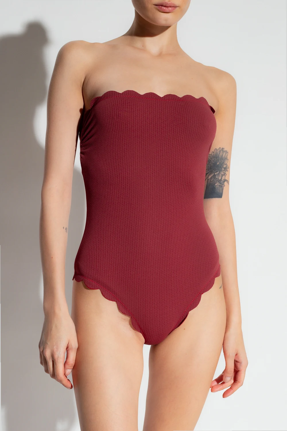 Dwustronny, jednoczęściowy kostium kąpielowy, model ‘Chesapeake Maillot’ Marysia. Wykonany z elastycznej teksturowanej tkaniny. Charakterystyczne, ręcznie wycinane brzegi. Odkryte ramiona. Z jednej strony czerwony. Z drugiej strony bordowy.