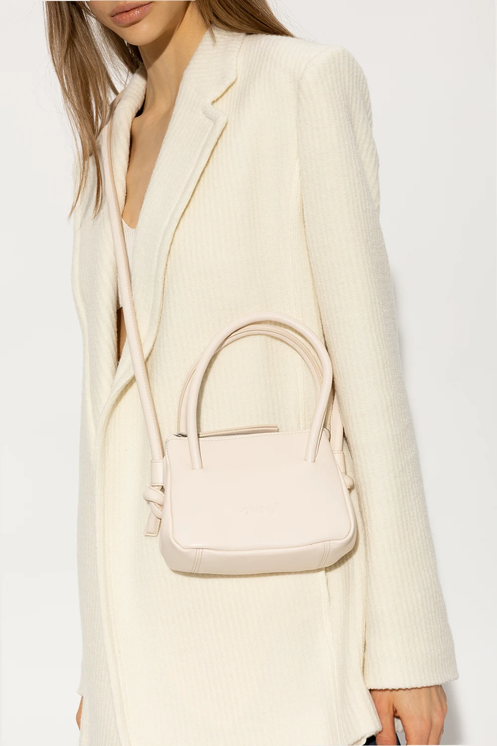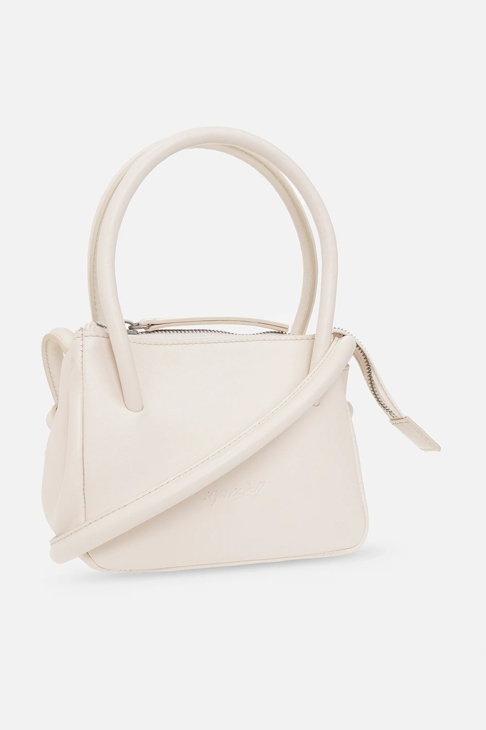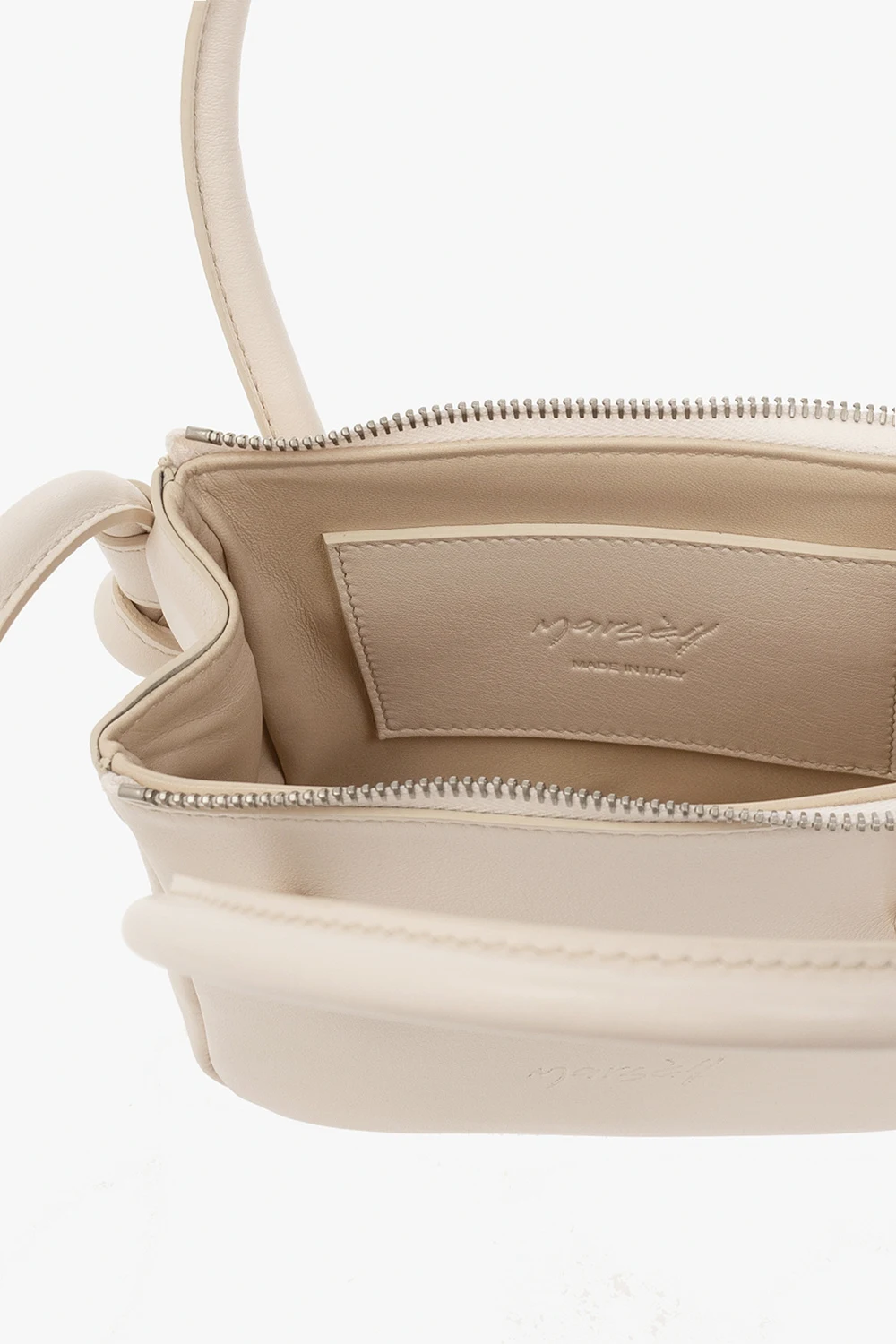 Kremowa torba na ramię, model ‘Sacco Piccolo’ Marsell. Wykonana ze skóry cielęcej. Zapinana na zamek. Wytłoczone logo. Dwie półokrągłe rączki oraz pasek na ramię. Wewnątrz komora. Metalowe elementy w kolorze srebrnym.