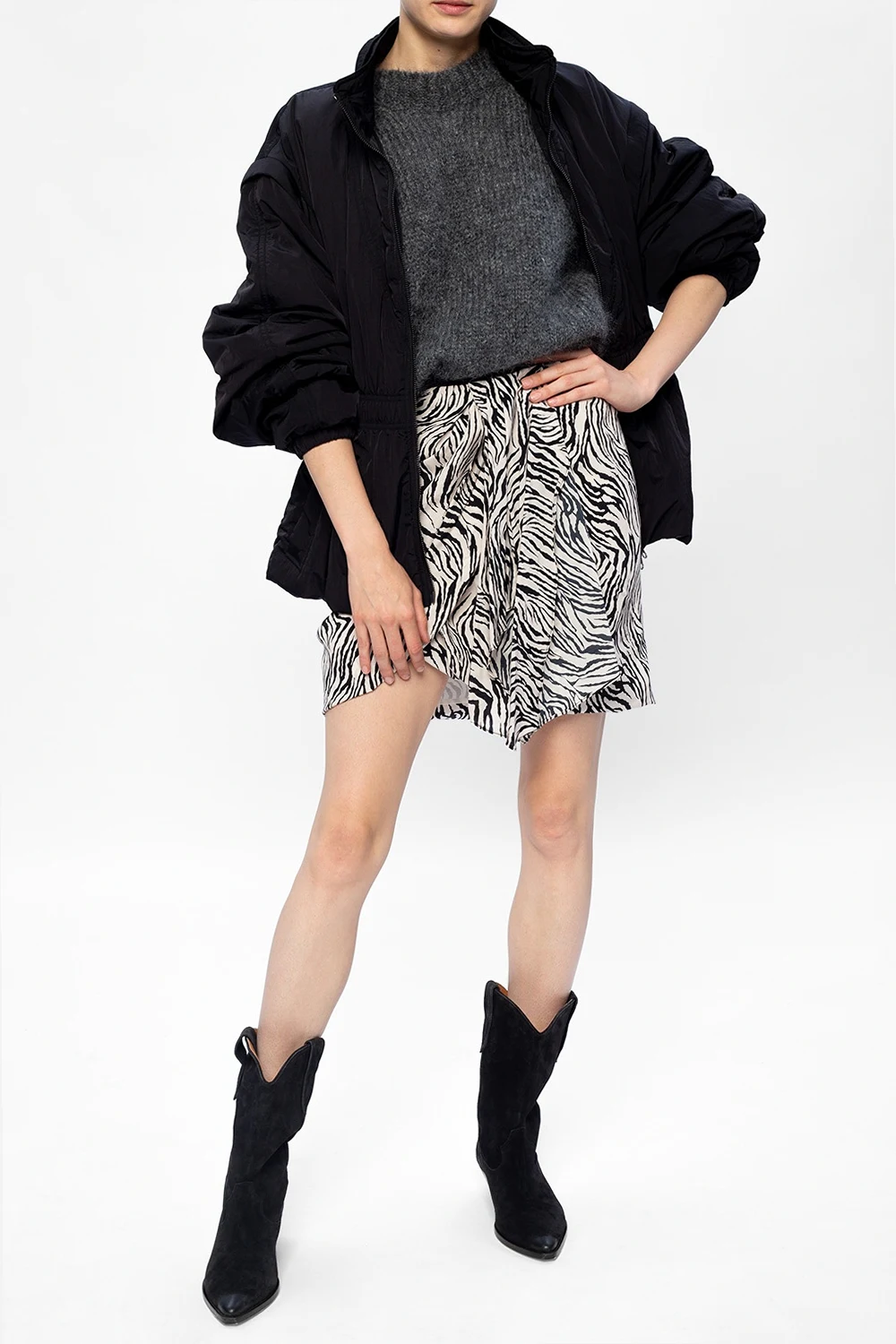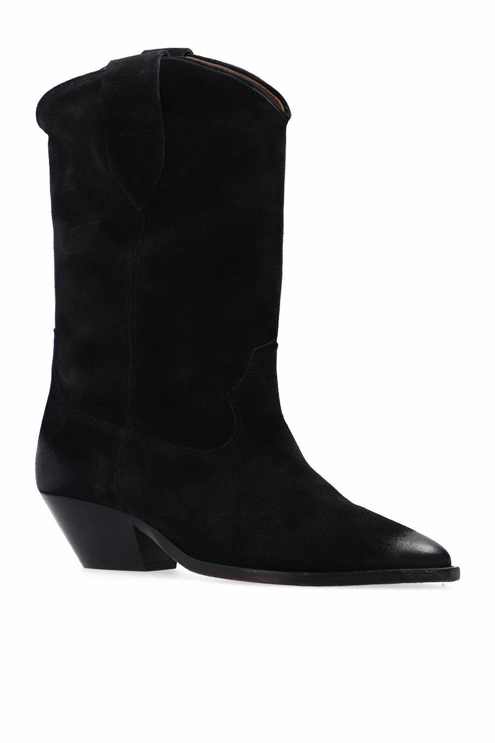 Czarne kowbojki na obcasie, model ‘Denvee’ Isabel Marant. Wykonane z zamszu. Ozdobione przeszyciami. Nosek w szpic. Warstwa wewnętrzna w kolorze brązowym. Brązowa, skórzana podeszwa.