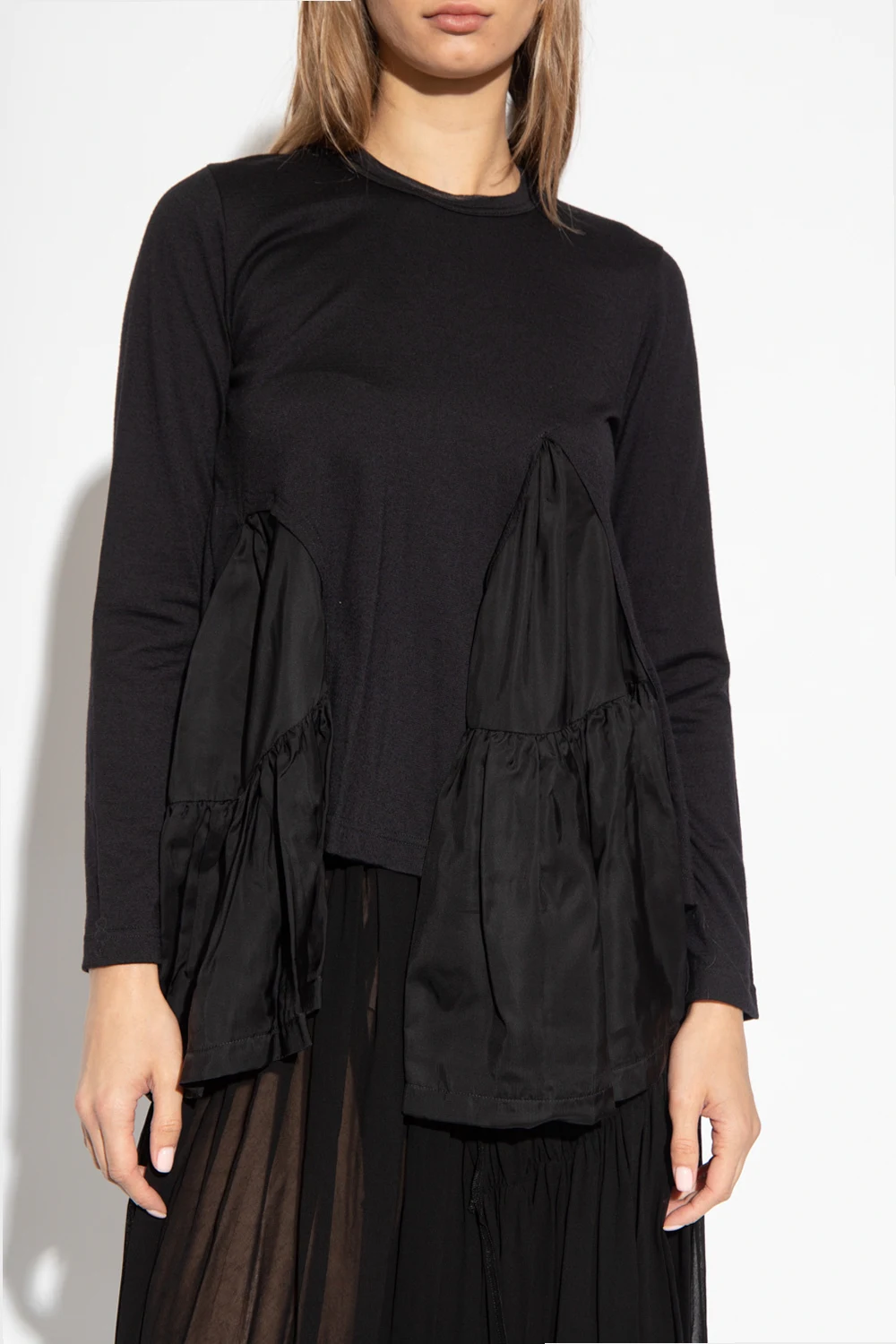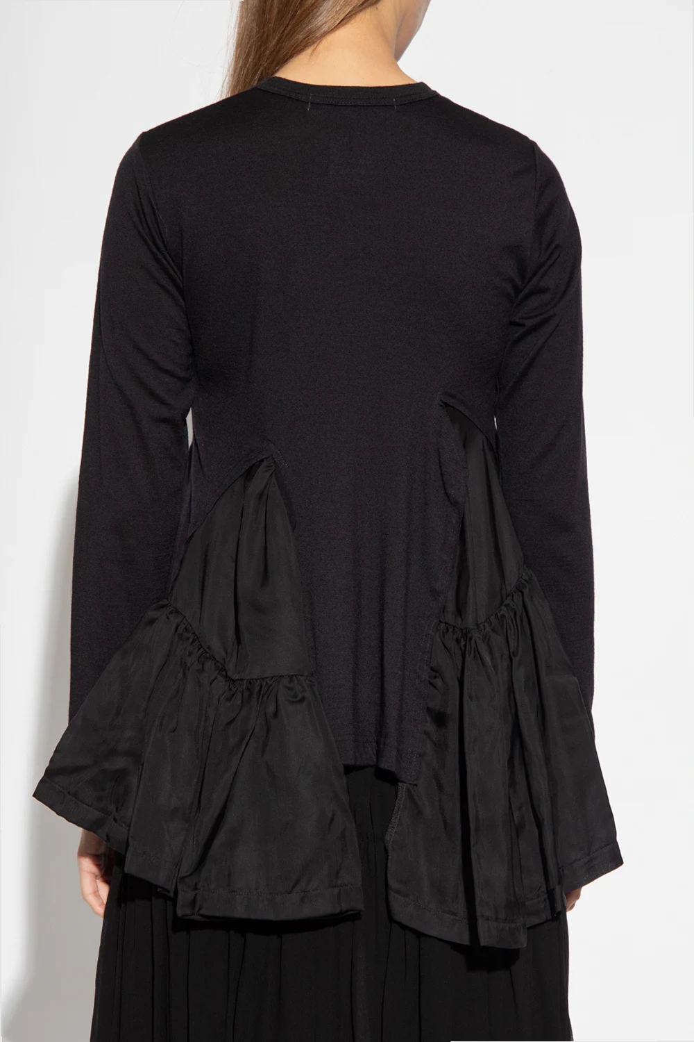 Czarny, wełniany top CDG by Comme des Garcons. Dekoracyjne, materiałowe wstawki wykończone falbaną. Okrągły dekolt. Długie rękawy.