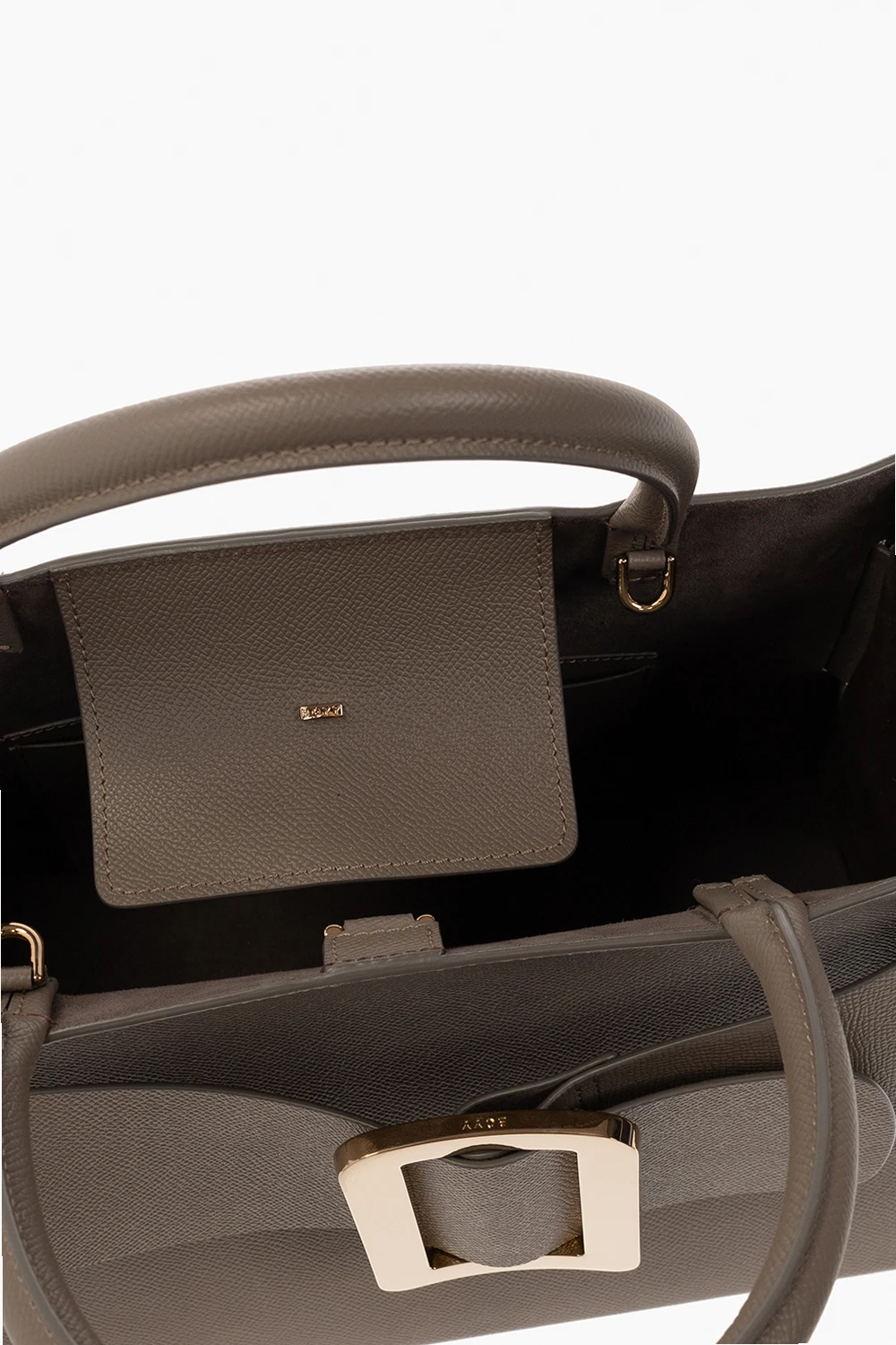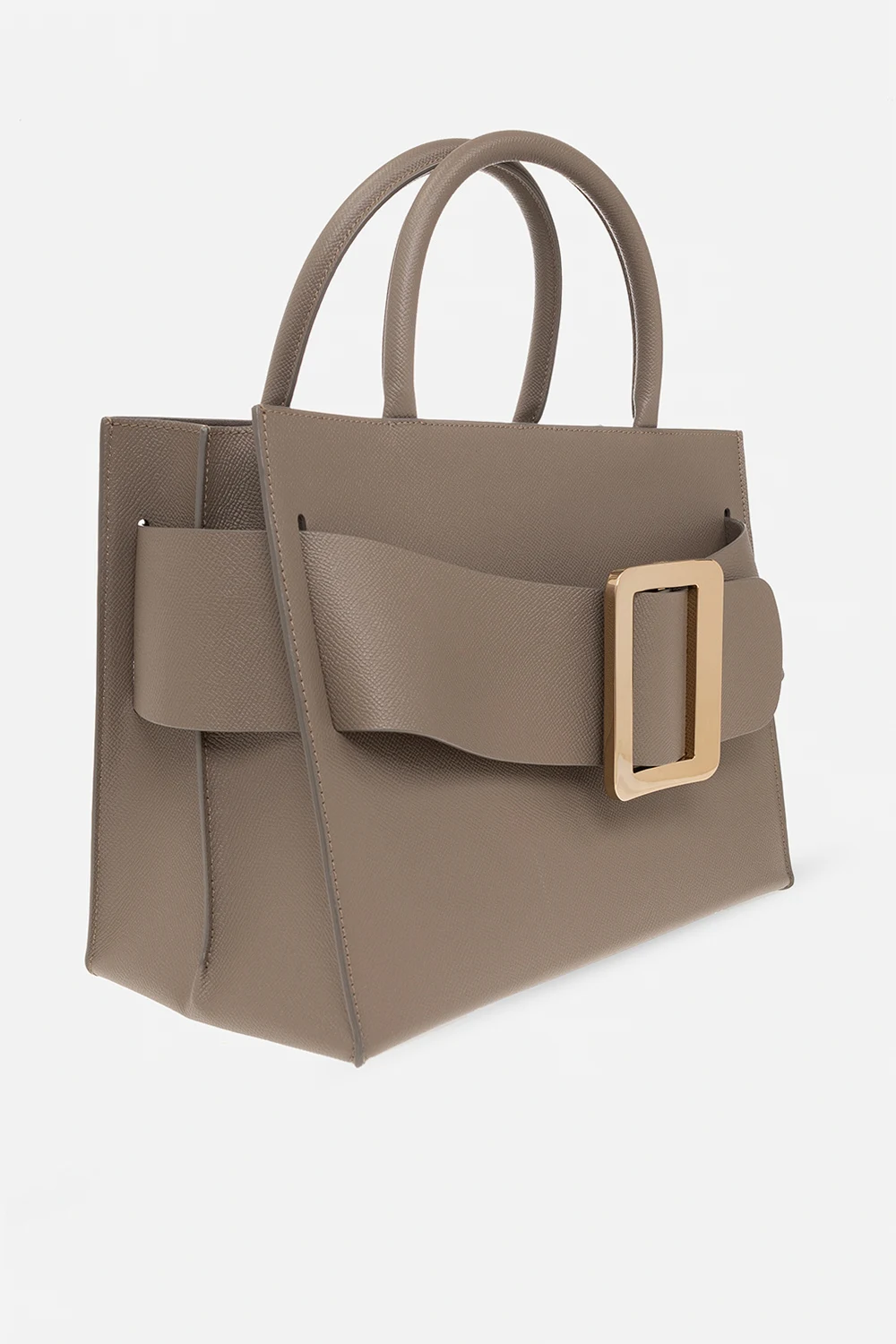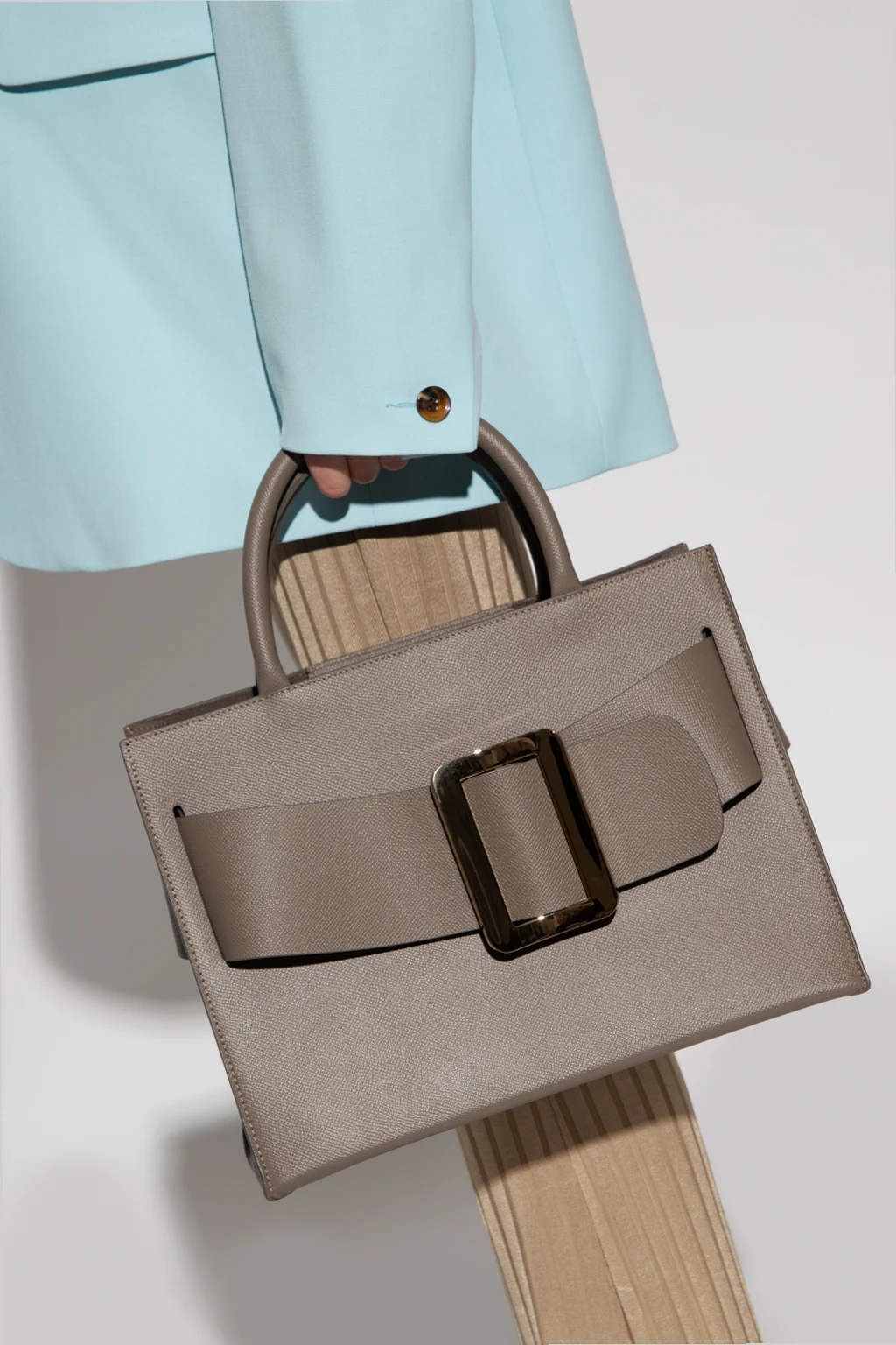 Szara torba na ramię, model ‘Bobby 32’ BOYY. Wykonana z cielęcej skóry. Zamykana na zaczep. Z przodu dekoracyjna klamra z wytłoczonym logo. Dwie półokrągłe rączki. Odpinany, regulowany pasek. Wewnątrz komora i wsuwana kieszeń. Metalowe elementy w kolorze postarzanego złota.