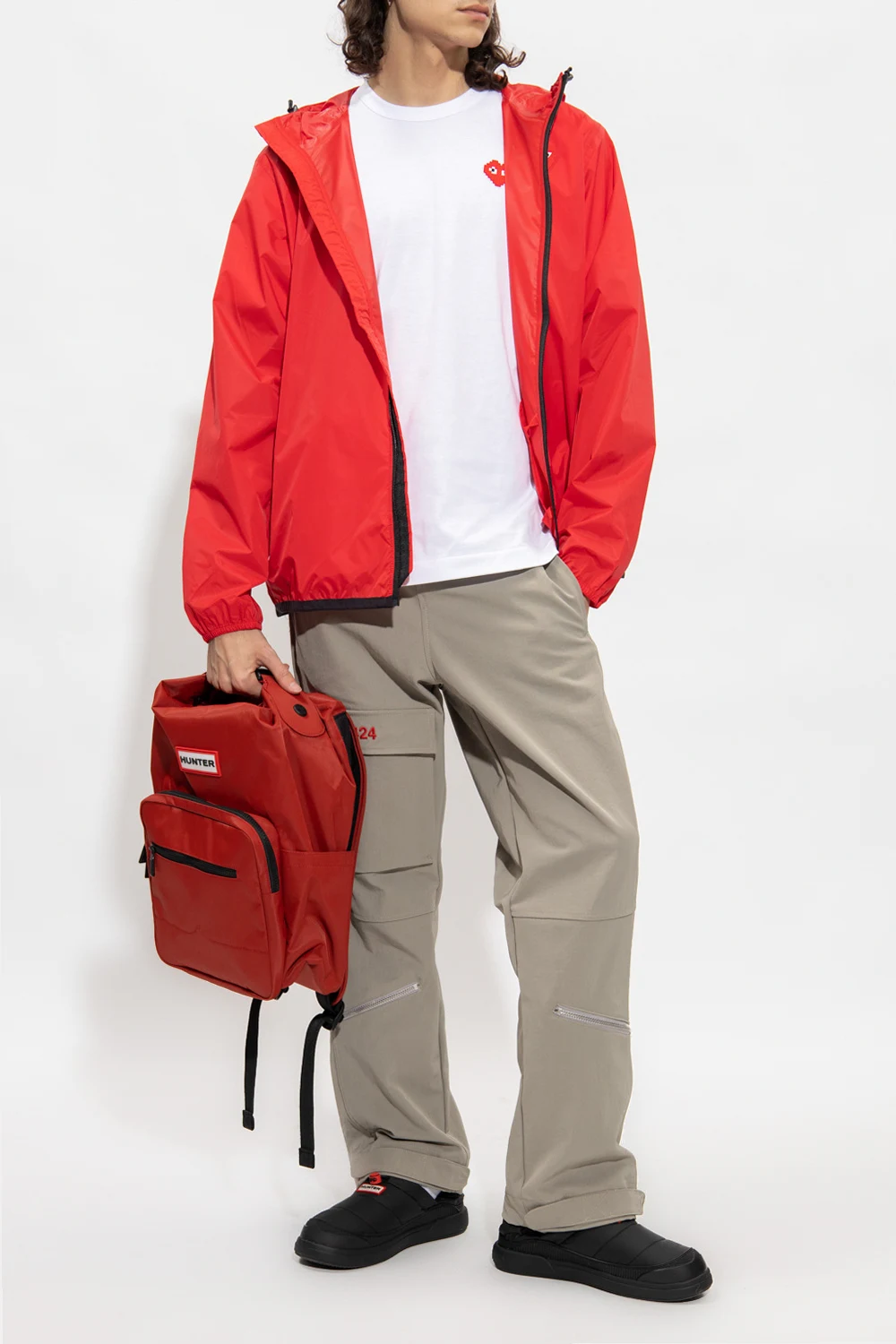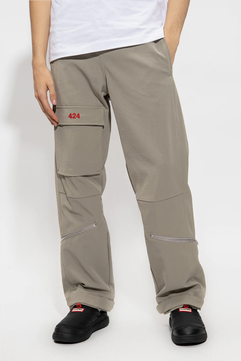 Beżowozielone spodnie 424. Zapinane na zamek oraz haftkę. Ozdobione wyhaftowanym wzorem z logo w kolorze czerwonym. Siedem kieszeni: cztery wsuwane, dwie zapinane na zamek oraz z patką. Szerokie nogawki.