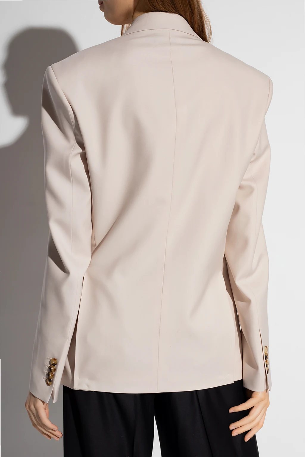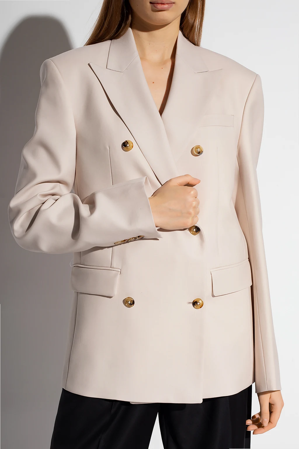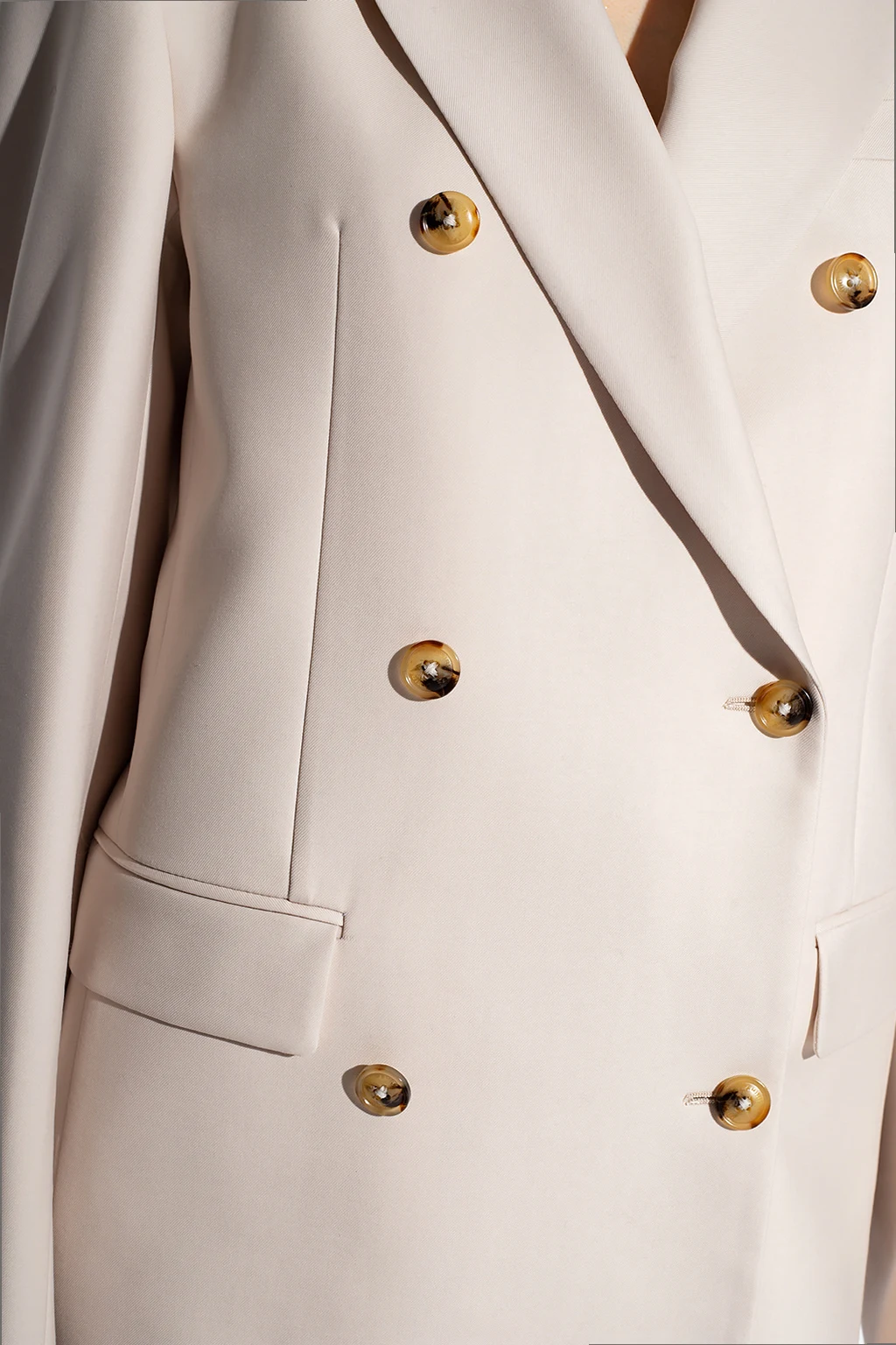 Kremowa, dwurzędowa marynarka typu ‘oversize’ Amiri. Wykonana z wełny. Zapinana na guziki. Kołnierz wykończony zamkniętymi klapami. Trzy kieszenie: wsuwana oraz dwie z patkami. Z tyłu podwójne rozcięcie. Długie rękawy zakończone zapięciem na guziki.