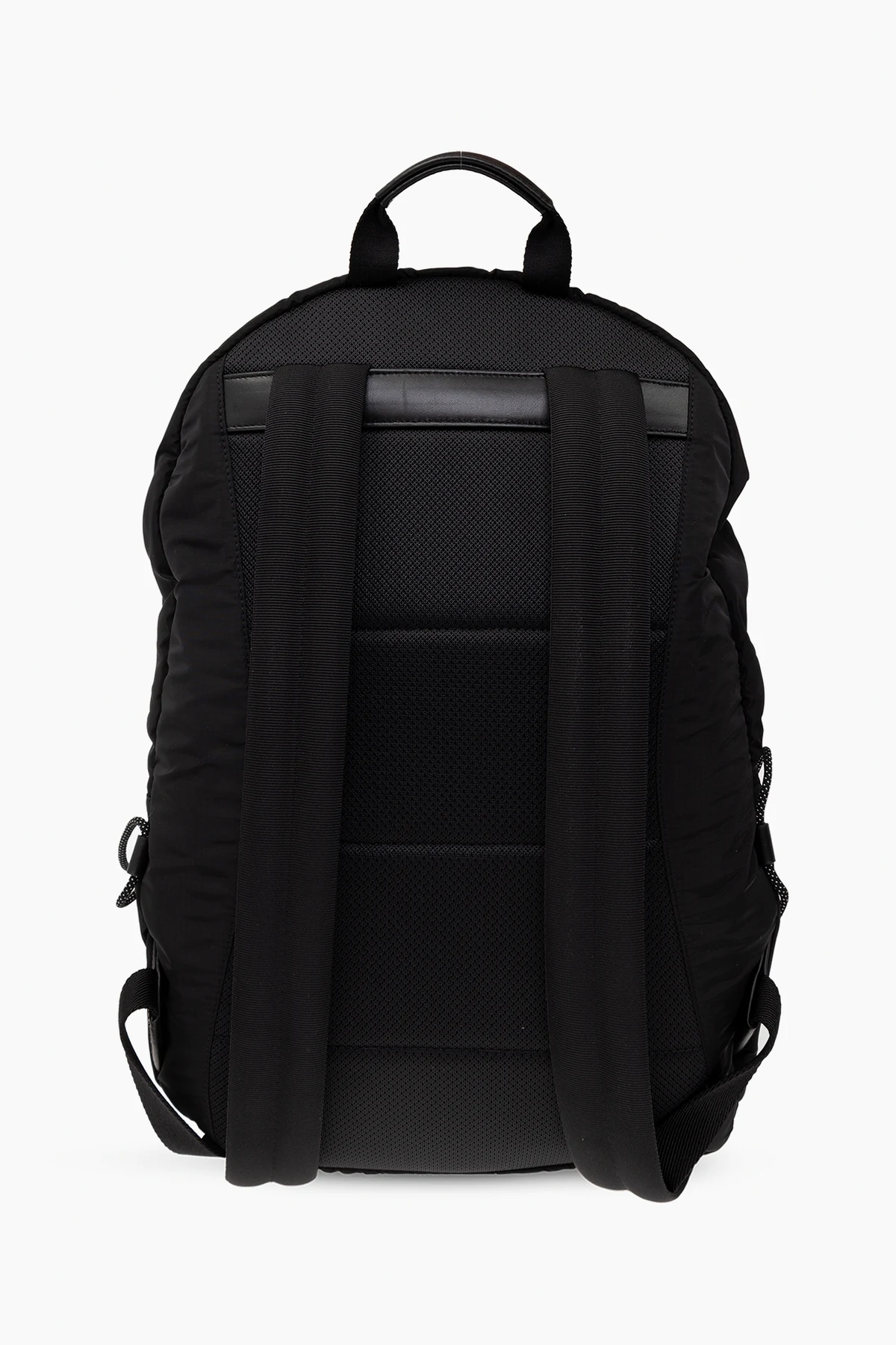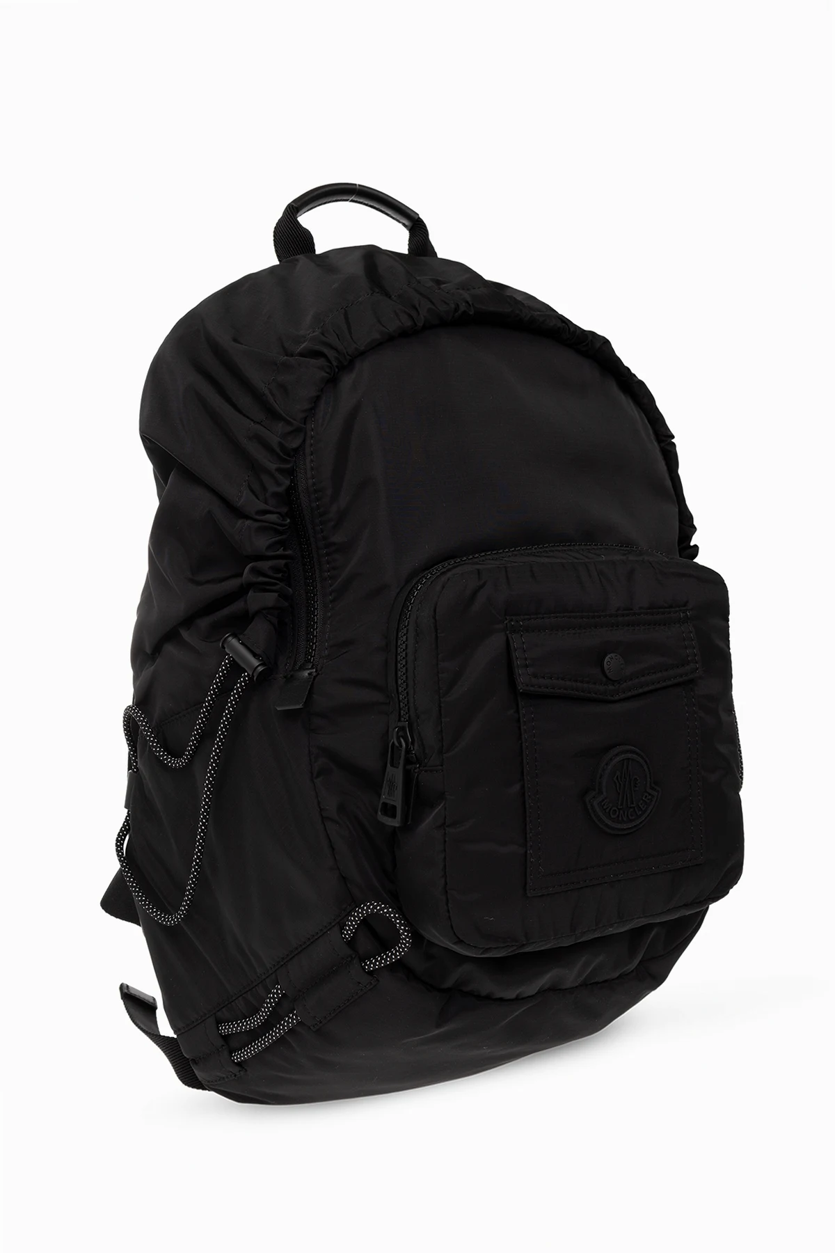Czarny plecak, model ‘Makaio’ Moncler. Ściągany trokami i zamykany na dwubiegunowy zamek. Ozdobiony gumową naszywką z logo. Z przodu dwie kieszenie: zamykana na zamek oraz z patką z zamknięciem na zatrzask. Na górze krótki uchwyt, z tyłu regulowane szelki. Wewnątrz komora z wsuwaną kieszenią.