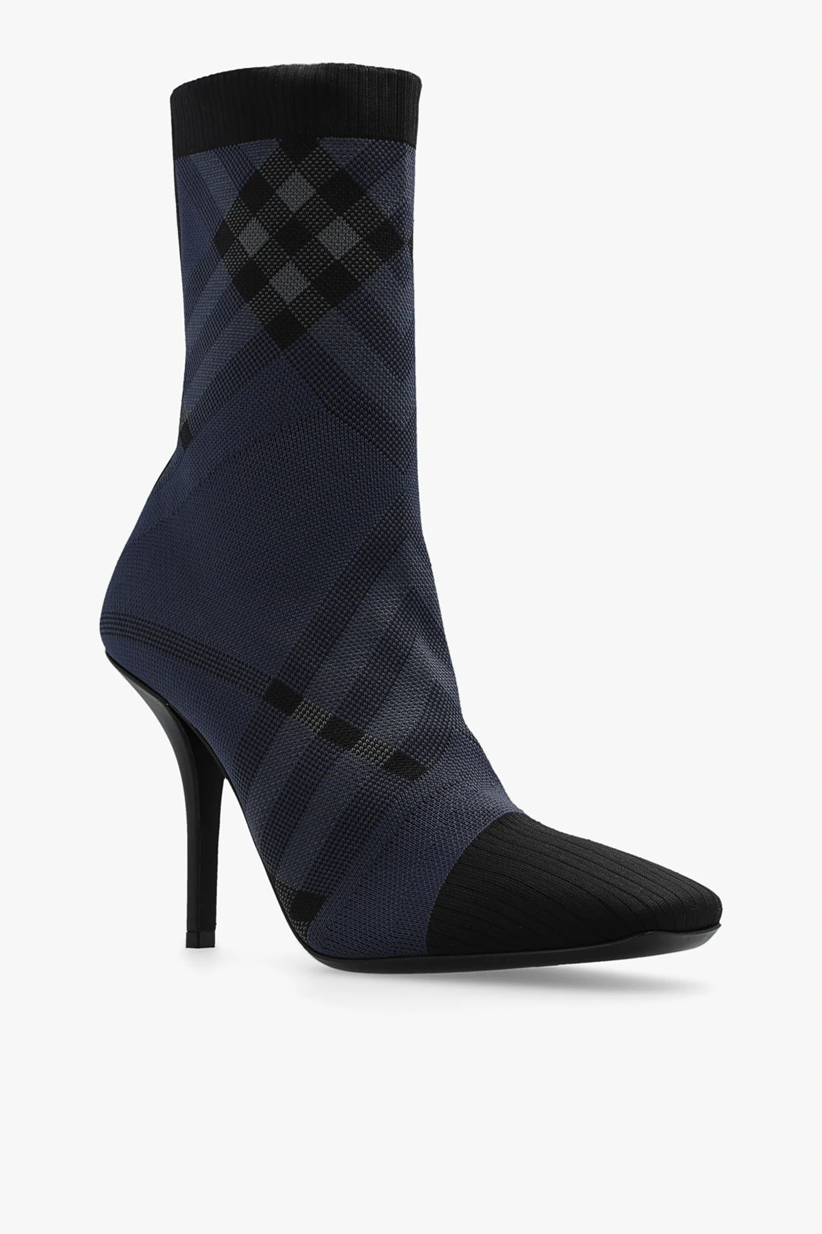 Czarno-szare botki na obcasie, model ‘Dolman’ Burberry. Wykonane z materiału. Góra wykończona ściągaczem. Ozdobione charakterystyczną kratą. Kwadratowy nosek. Czarna, skórzana podeszwa.