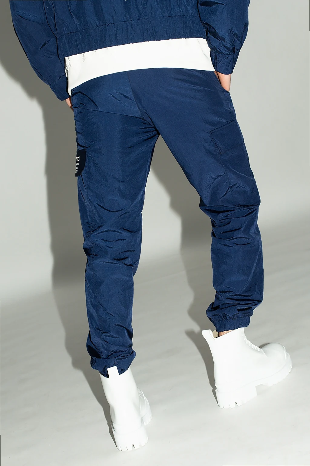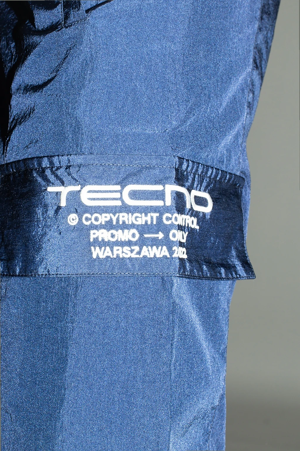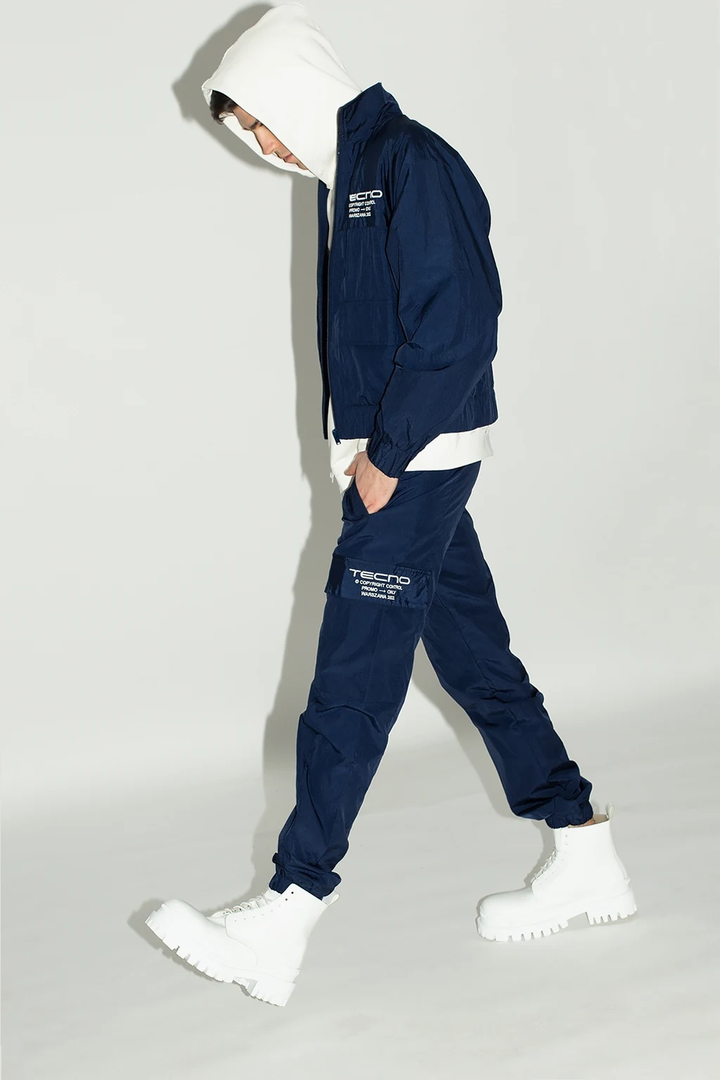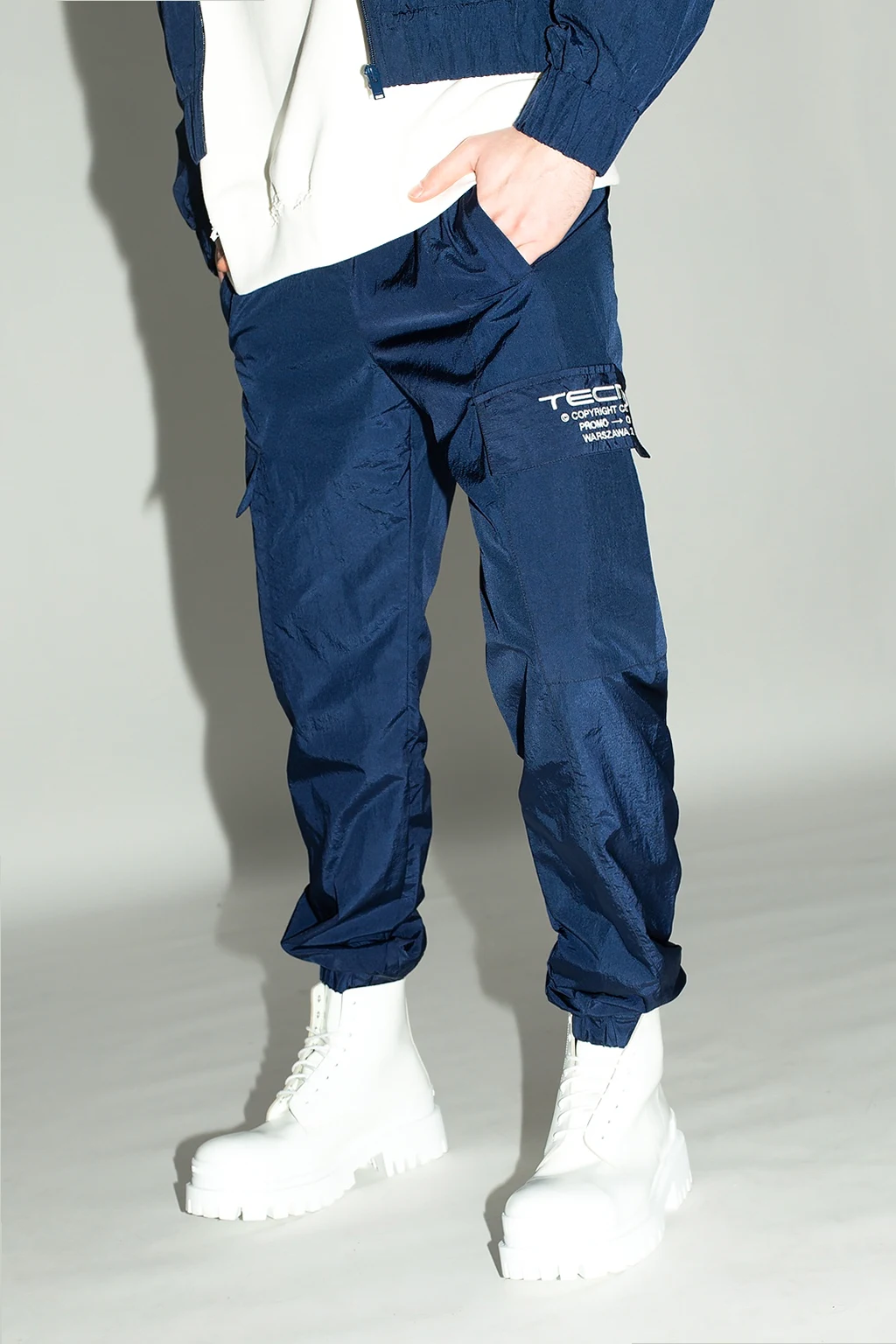 Granatowe spodnie dresowe, model ‘Tecno’ MISBHV. W pasie wszyta guma ściągana trokami. Ozdobione wyszytym wzorem z logo w kolorze białym. Cztery kieszenie: dwie wsuwane oraz dwie z patkami. Długie nogawki zakończone ściągaczem.