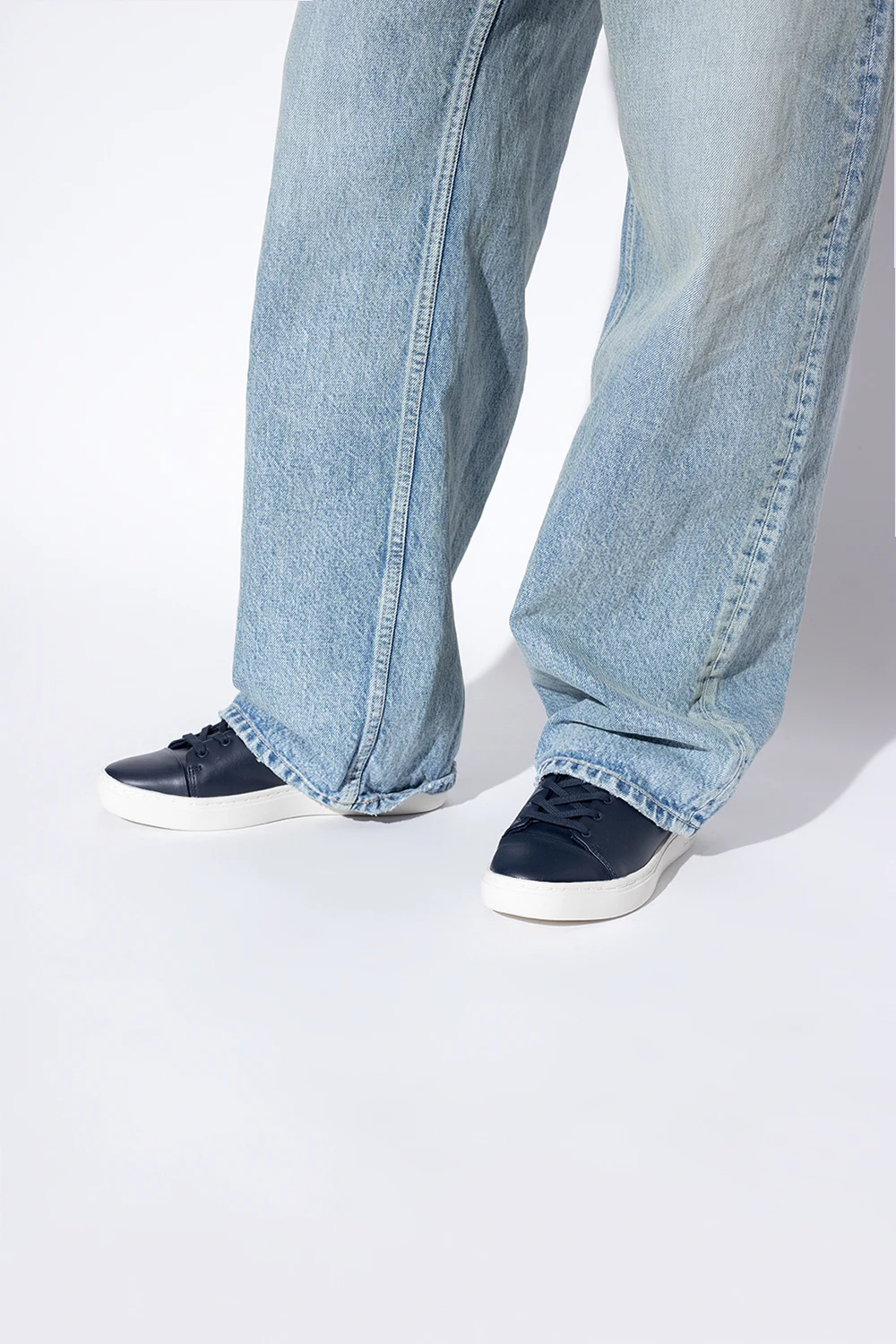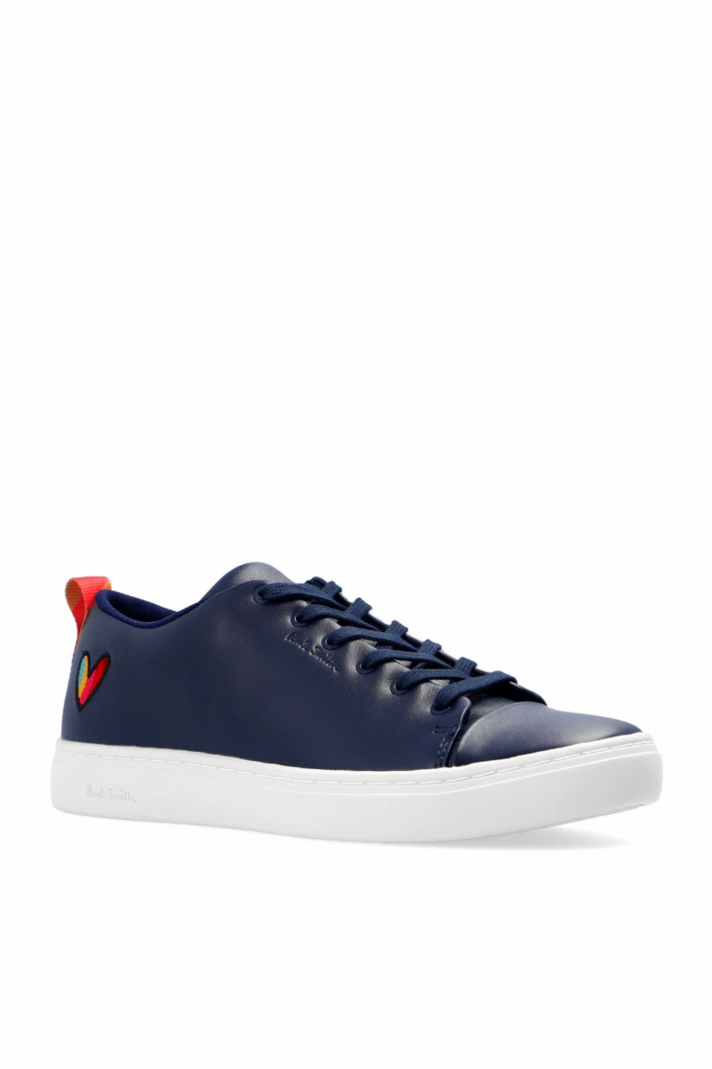 Granatowe, sznurowane buty sportowe Paul Smith. Wykonane ze skóry. Ozdobione wytłoczonym logo i kolorowo wyszytym wzorem w kształcie serca. Z tyłu kolorowy, materiałowy pasek. Biała, gumowa podeszwa.