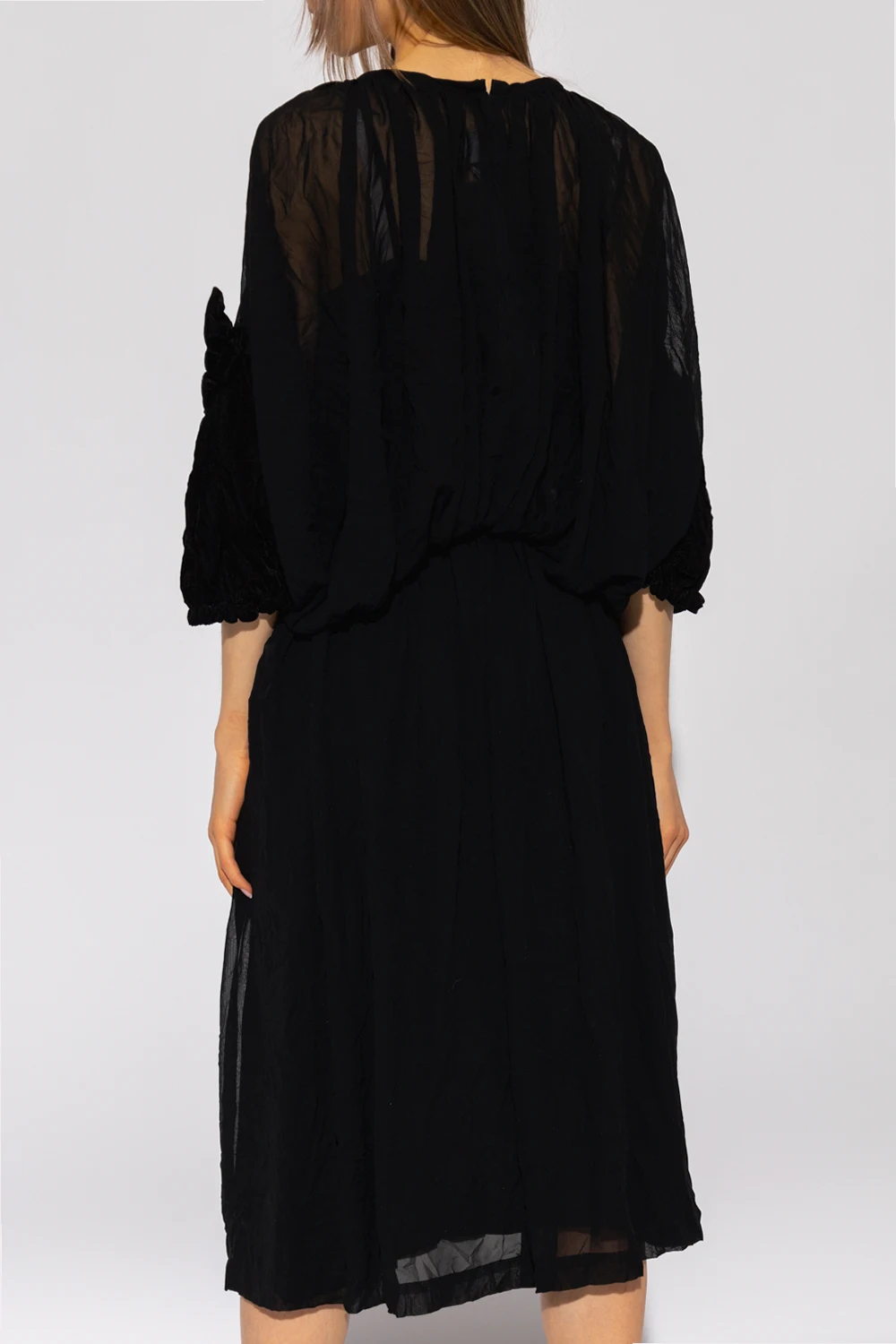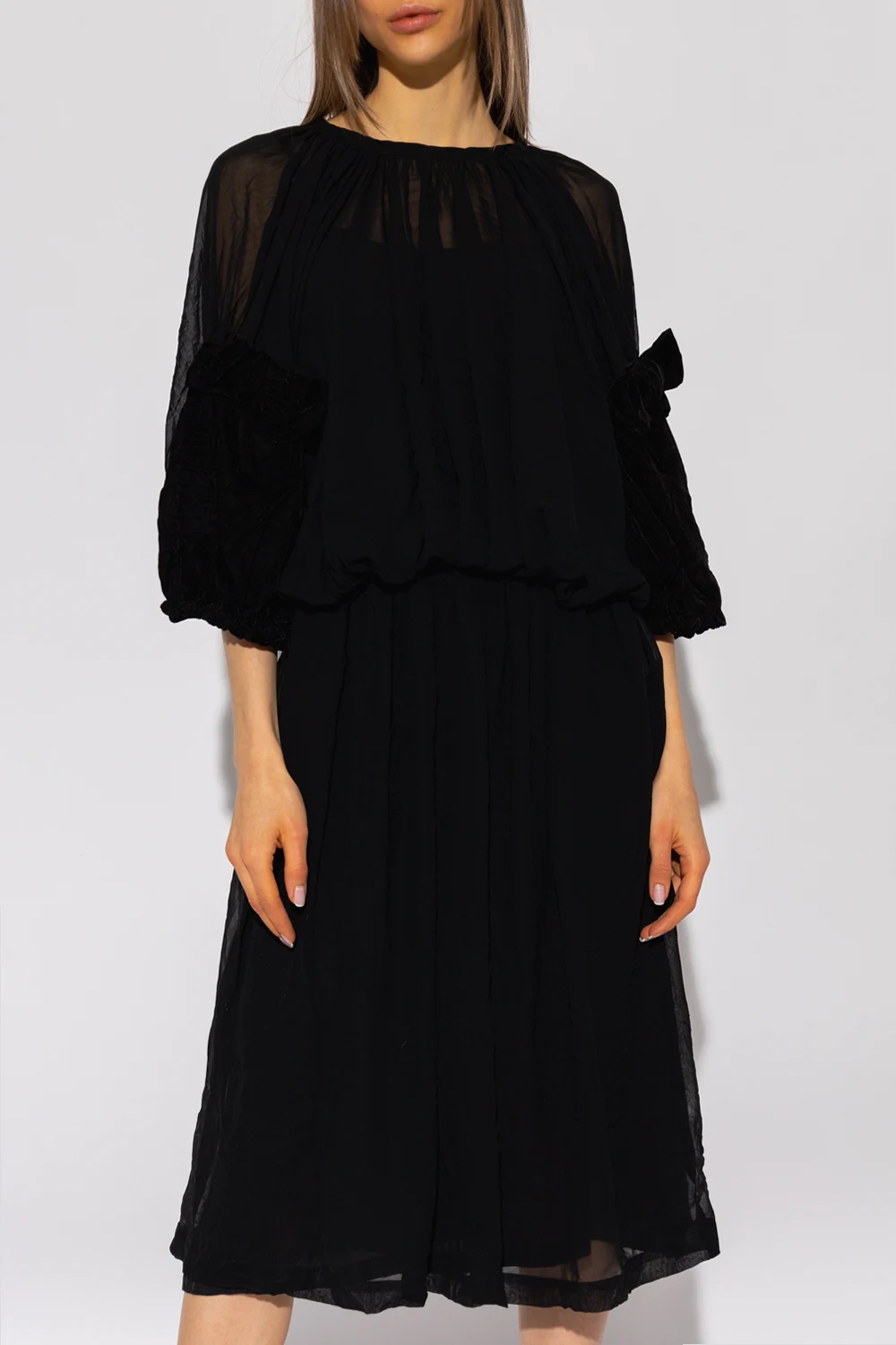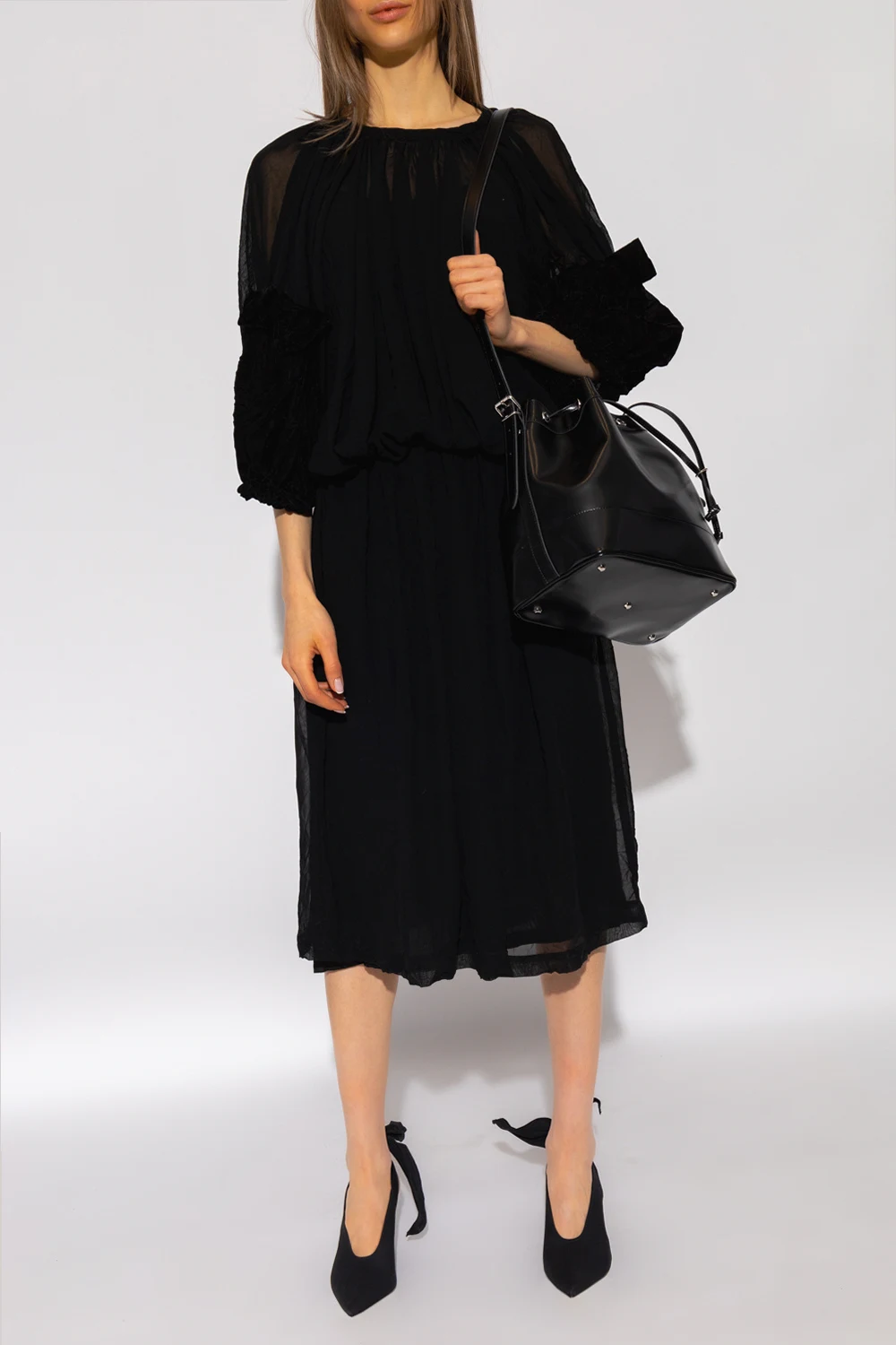 Czarna sukienka midi CDG by Comme Des Garçons. Wykonana z transparentnego materiału. Zapinana z tyłu na zamek oraz haftkę. W pasie wszyta elastyczna guma. Okrągły dekolt, dwie wsuwane kieszenie. Bufiaste rękawy ozdobione kokardą o welurowym wykończeniu ze ściągaczem.