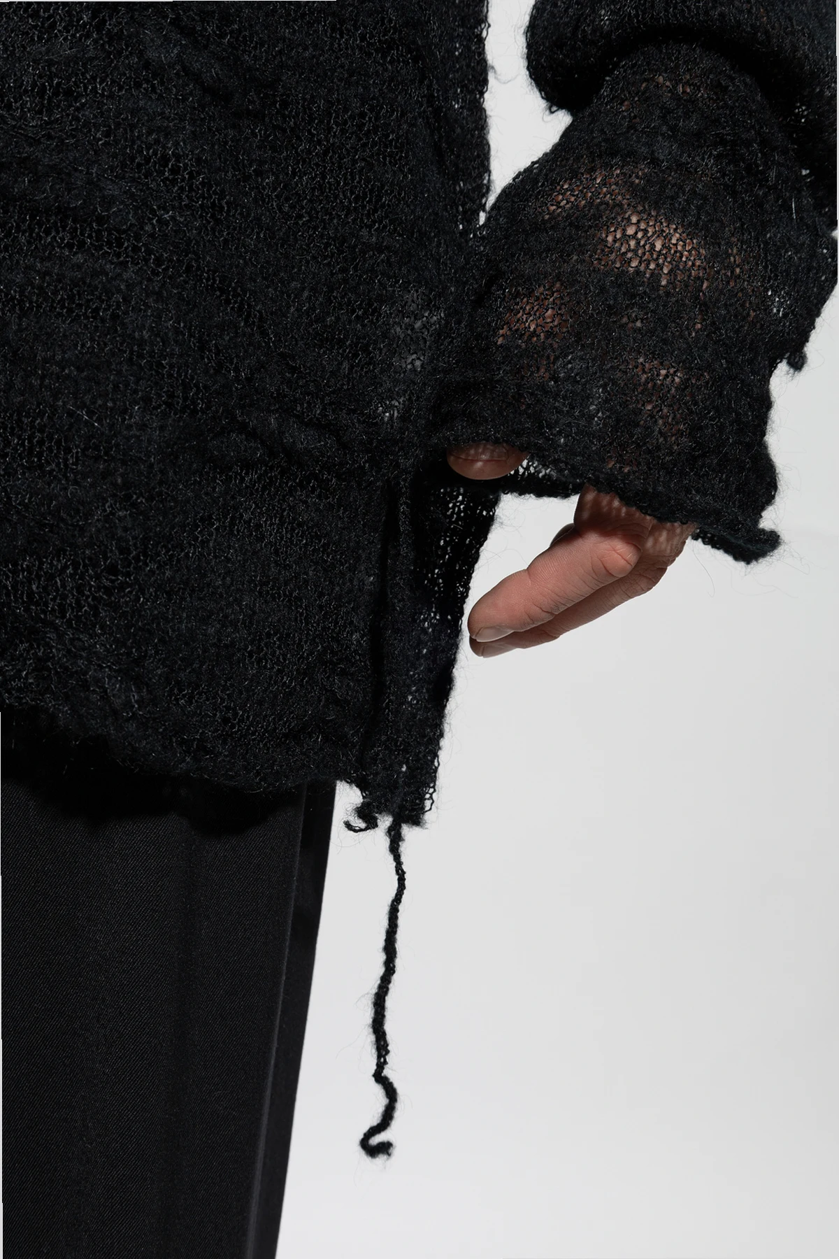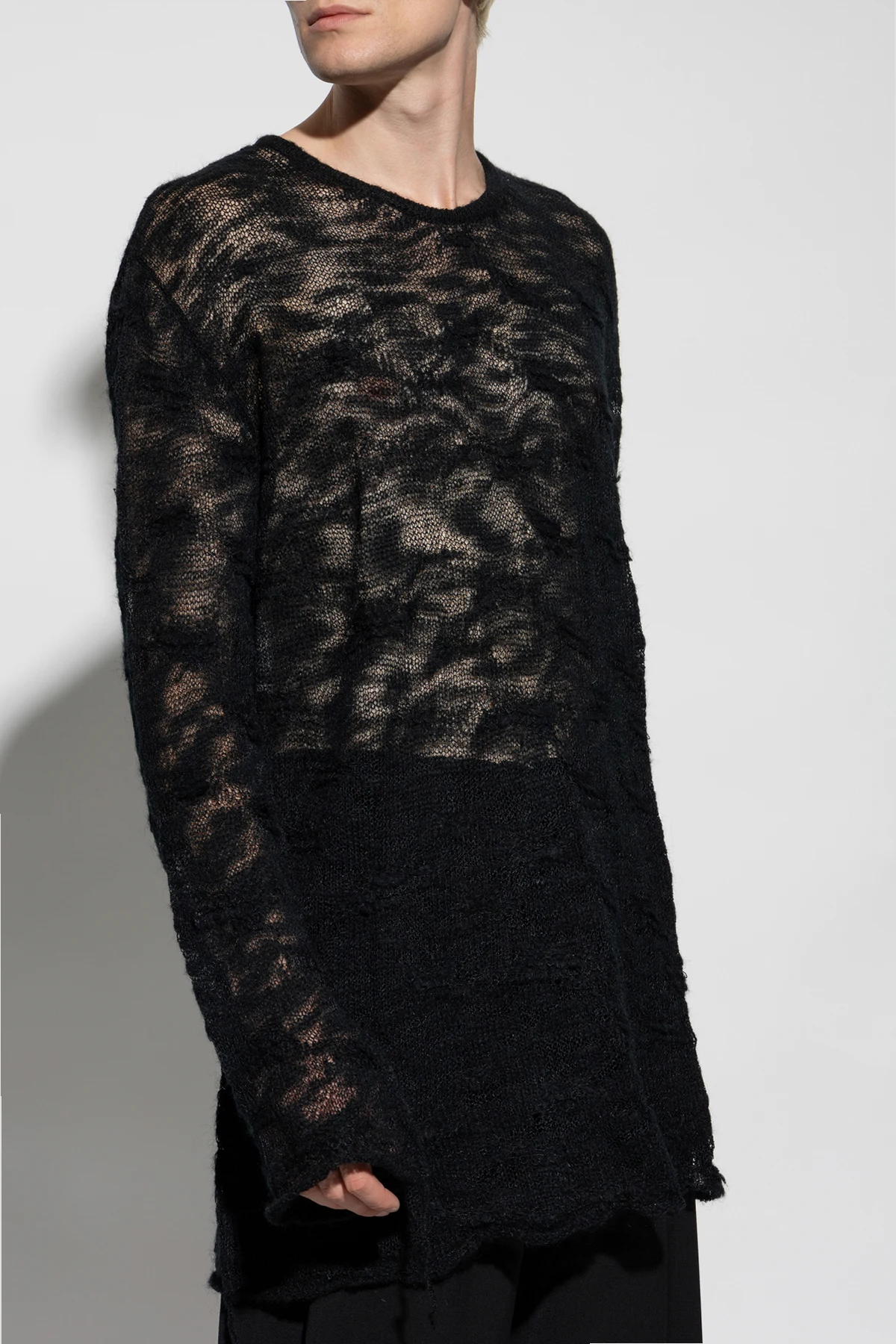 Sweter charakteryzuje się klasycznym krojem z długimi rękawami oraz okrągłym dekoltem. Wykonany z lekkiej, przezroczystej tkaniny, składającej się z akrylu, moheru oraz poliamidu, zachwyca delikatnym, subtelnie prześwitującym materiałem. Nieregularny, teksturowany wzór nadaje mu artystycznego wyrazu, a postrzępione wykończenia oraz luźna, zwisająca nitka przy bocznym szwie podkreślają unikatowy charakter tego projektu.