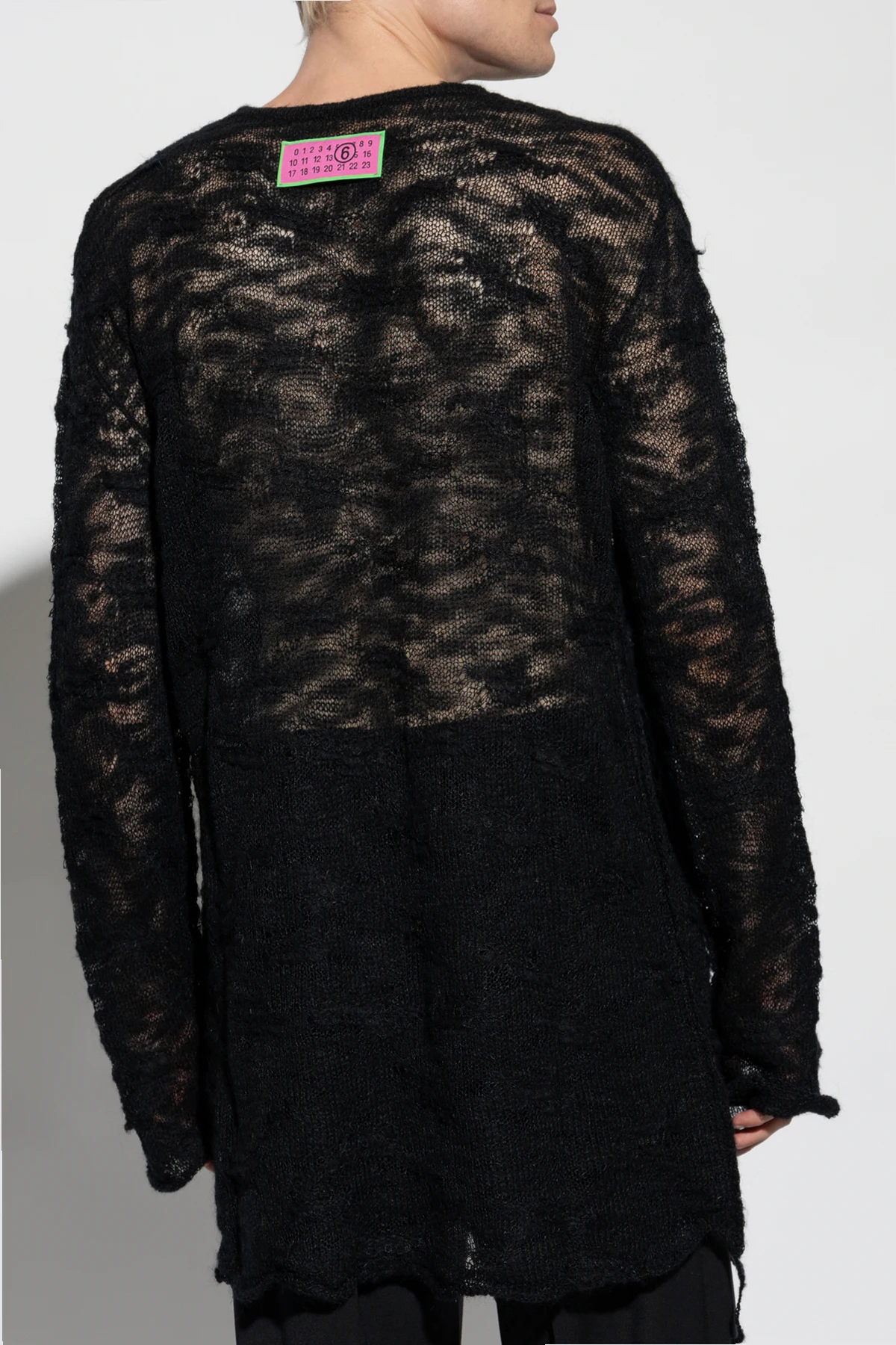 Na plecach, w górnej części swetra, znajduje się prostokątna, różowa naszywka z napisem, będąca logo projektanta. Przezroczystość materiału pozwala na kreatywne stylizacje, czyniąc go idealnym elementem garderoby do noszenia jako warstwa wierzchnia.