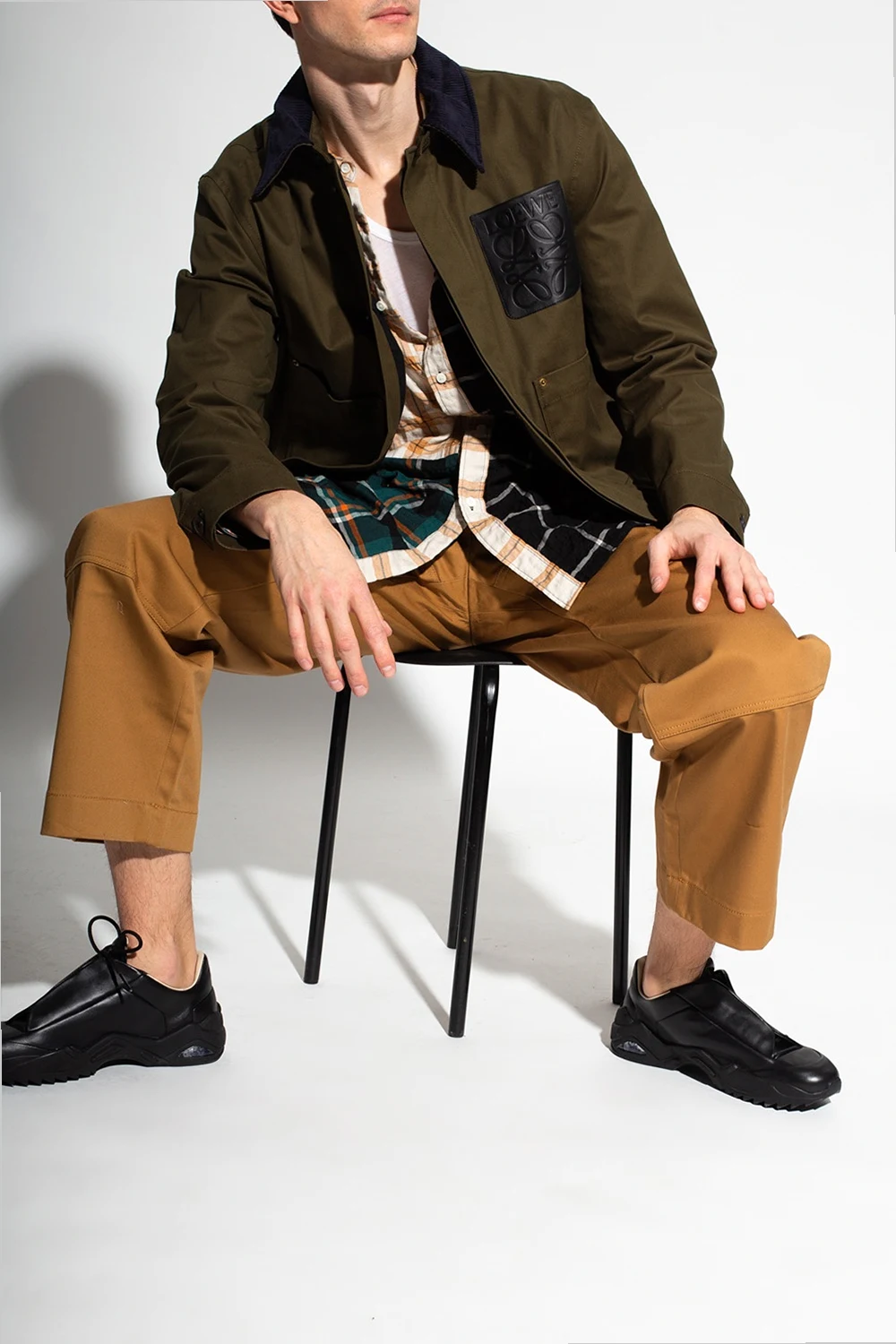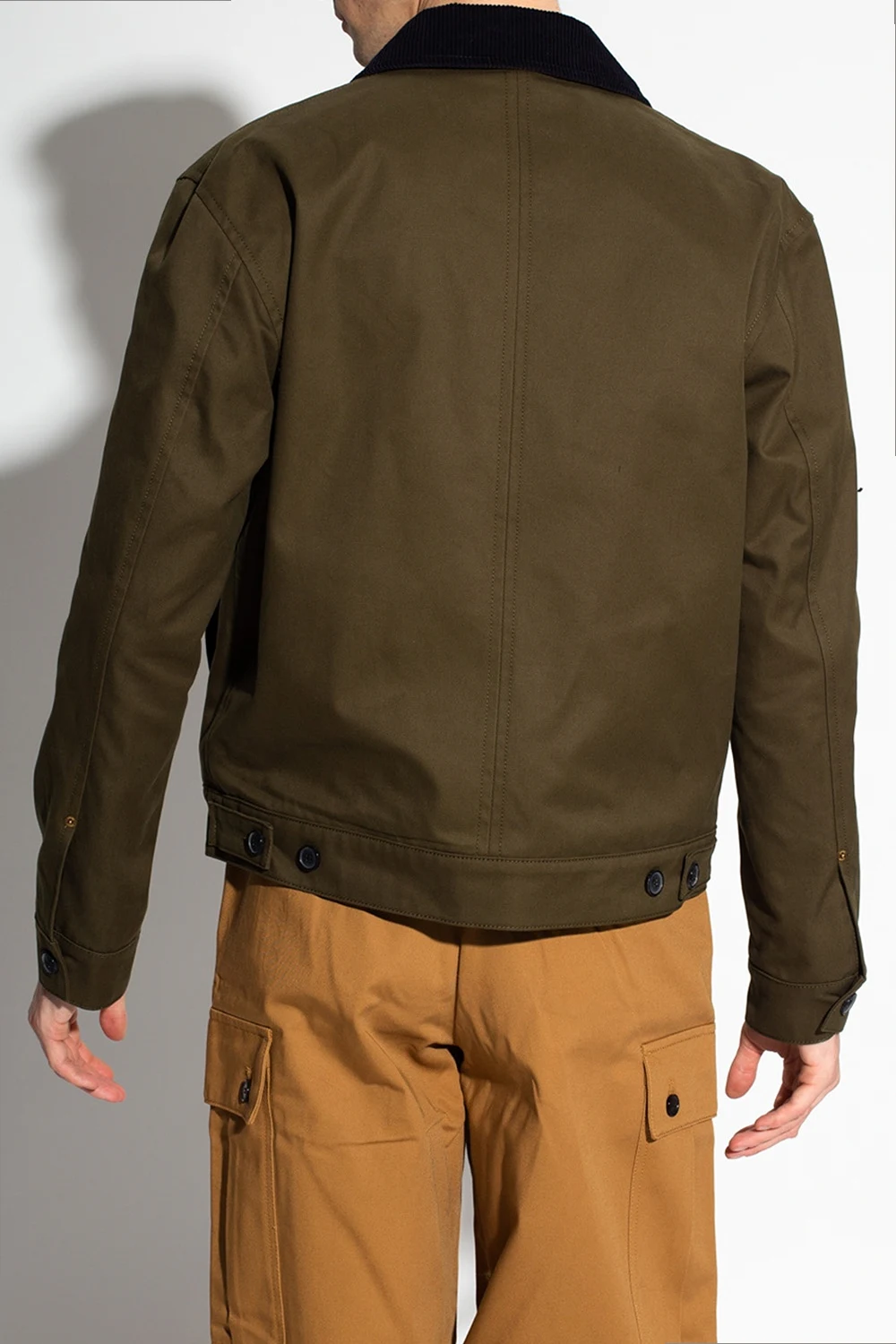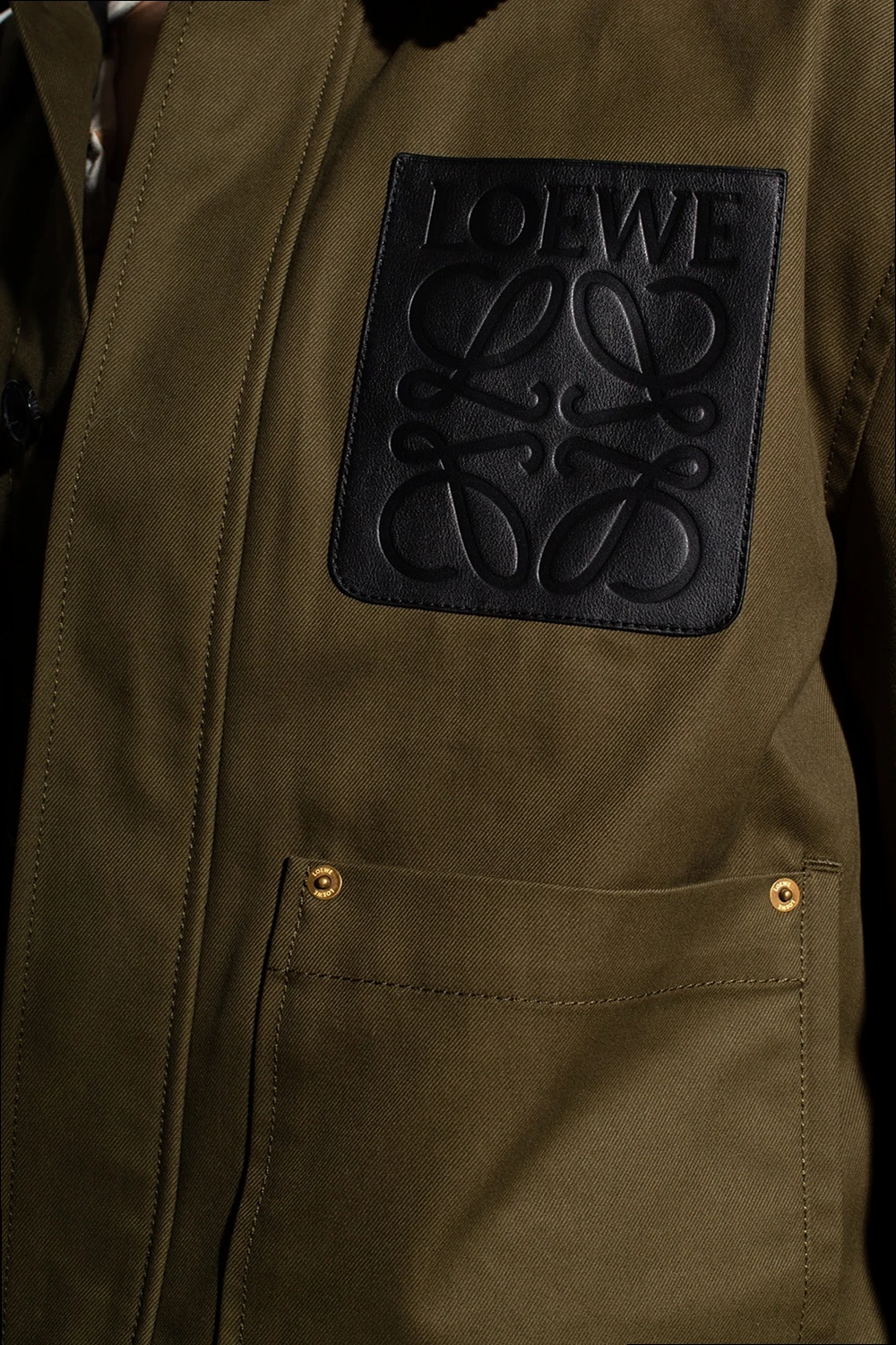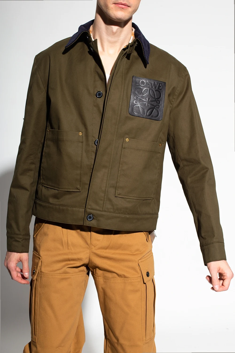 Zielona kurtka z kołnierzem Loewe. Wykonana z bawełny. Zapinana na guziki. Granatowy kołnierz ozdobiony wzorem w prążki. Z przodu wytłoczone logo oraz trzy wsuwane kieszenie. Jedna w kolorze czarnym.
