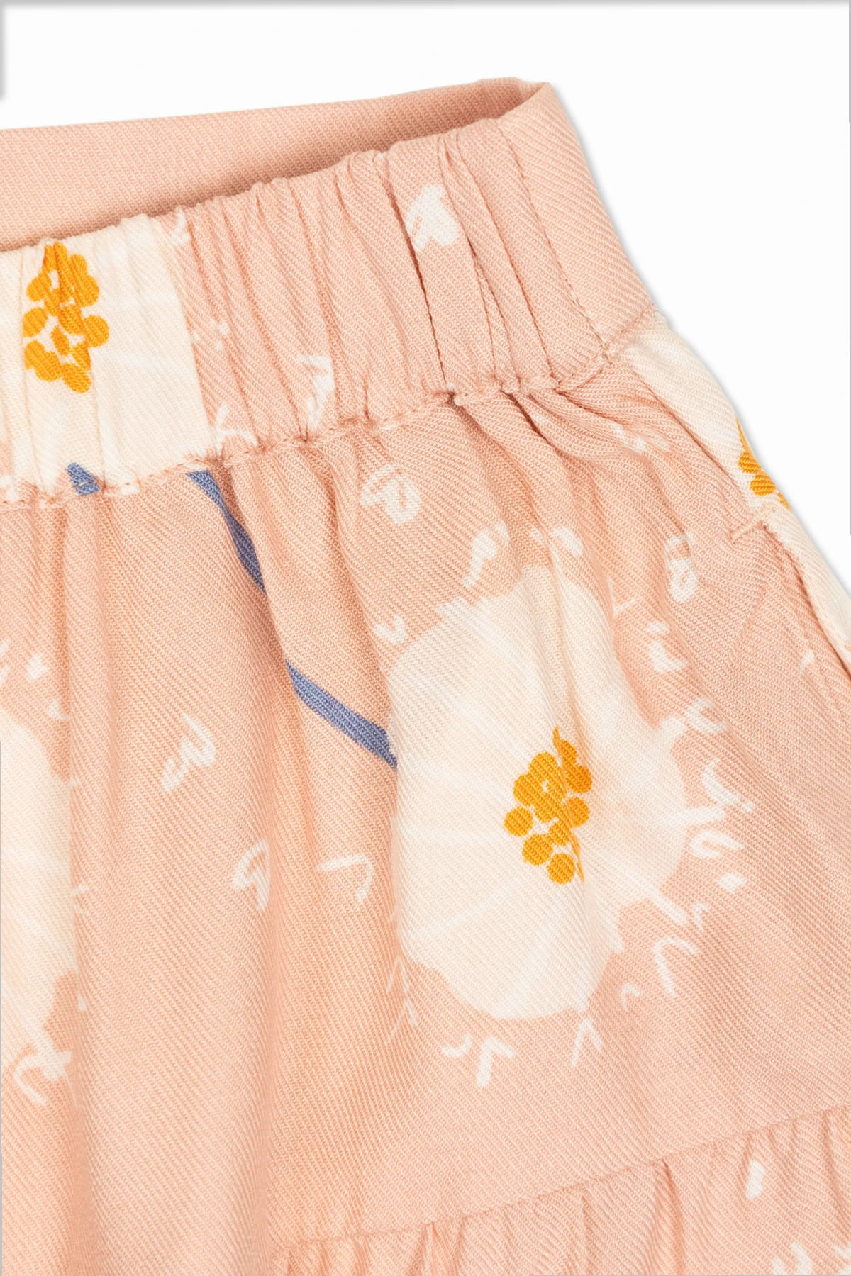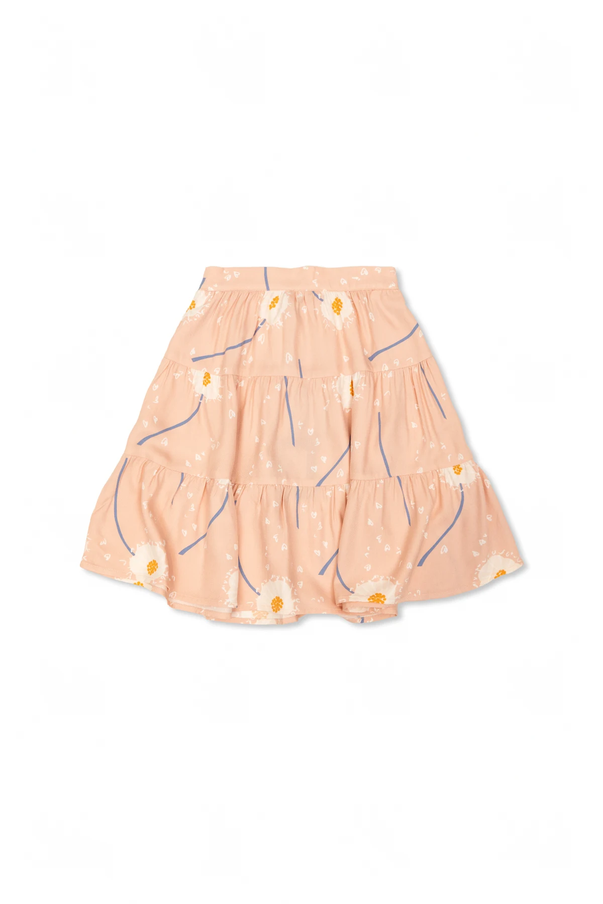 Przedstawiamy dziewczęcą spódnicę z motywem kwiatowym , pochodzącą z ekskluzywnej kolekcji odzieży Stella McCartney Kids . Ta unikalna spódnica zachwyca swoim rozkloszowanym fasonem, składającym się z kilku warstw tkaniny, które tworzą delikatne falbany. Wzór na całej powierzchni spódnicy to subtelne białe kwiaty z żółtymi środkami oraz niebieskimi i białymi akcentami, które harmonizują z dominującym różowym kolorem, nadając jej delikatny i dziewczęcy wygląd.