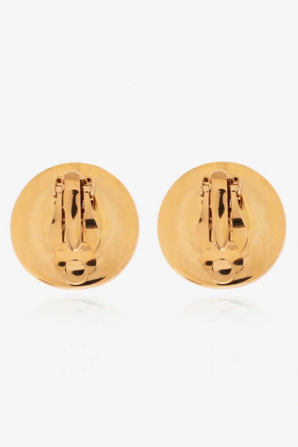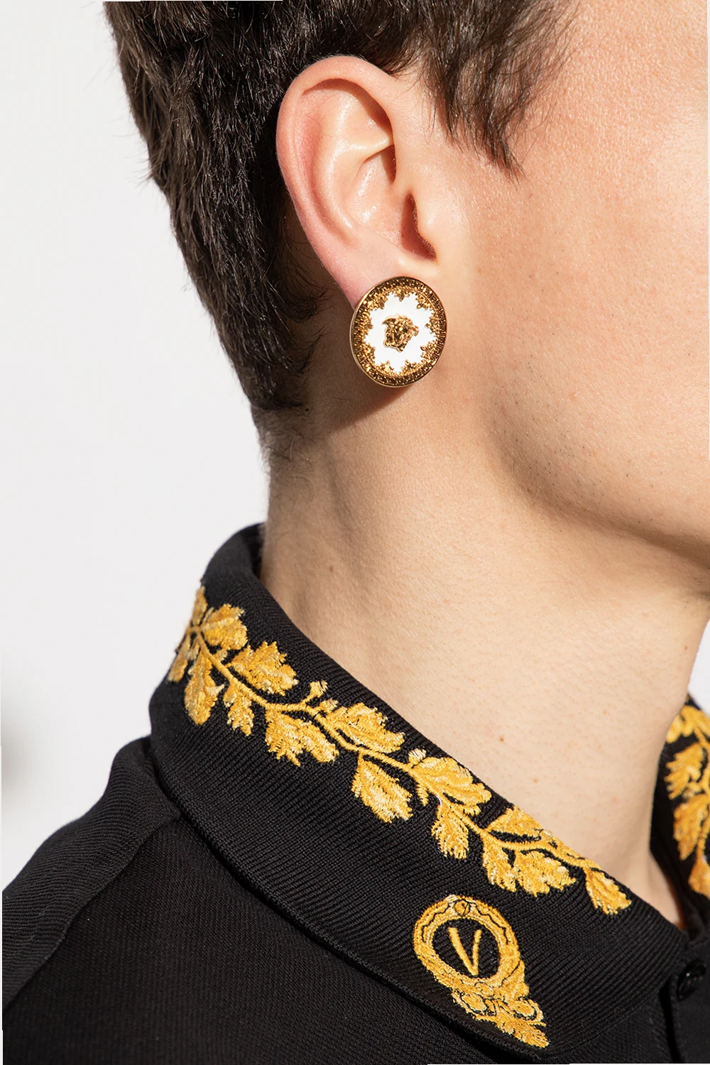Klipsy w kolorze złotym Versace. Ozdobione charakterystycznym greckim wzorem i głową Meduzy. Wykończone białą emalią.