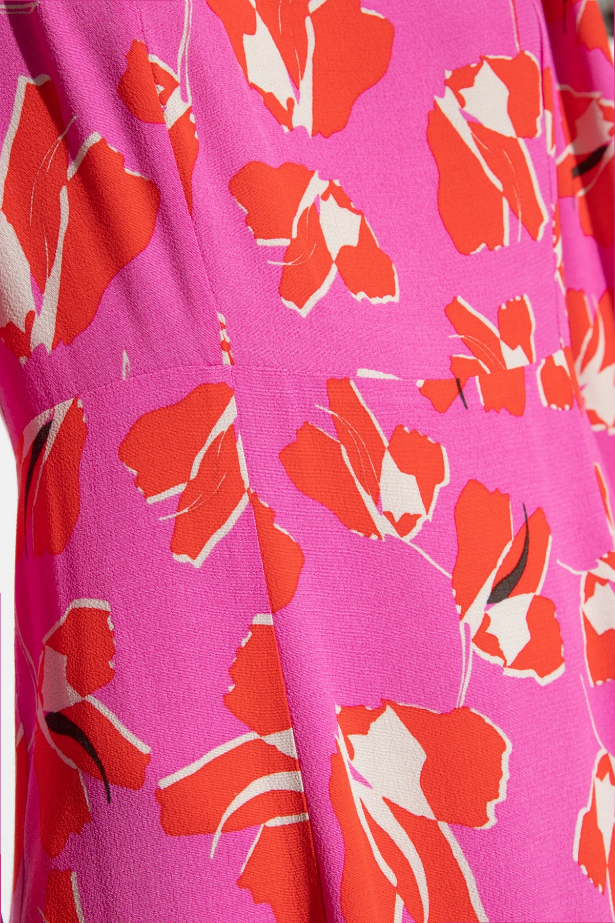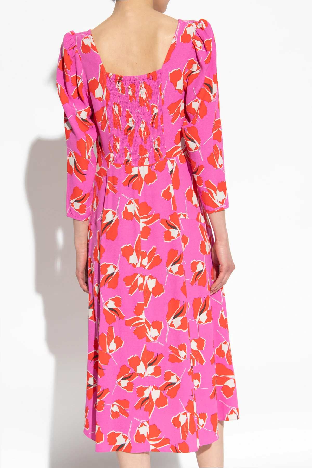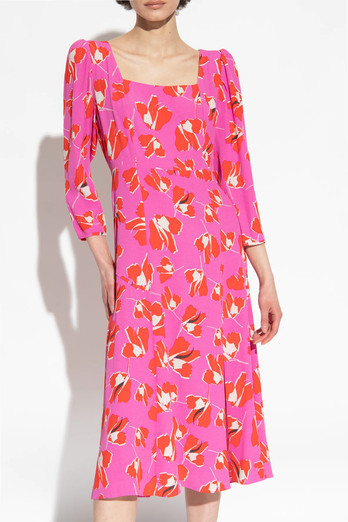Różowo-czerwona sukienka, model ‘Joanna’ Diane Von Furstenberg. Zapinana na kryty zamek. Ozdobiona wzorem z motywem kwiatowym. Bufiaste rękawy. Kwadratowy dekolt.