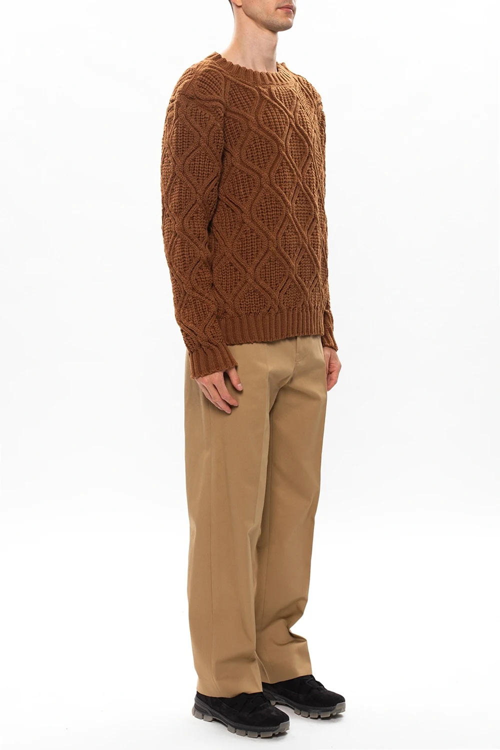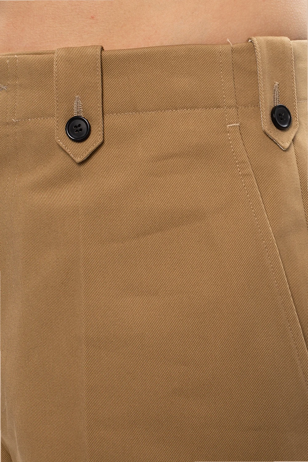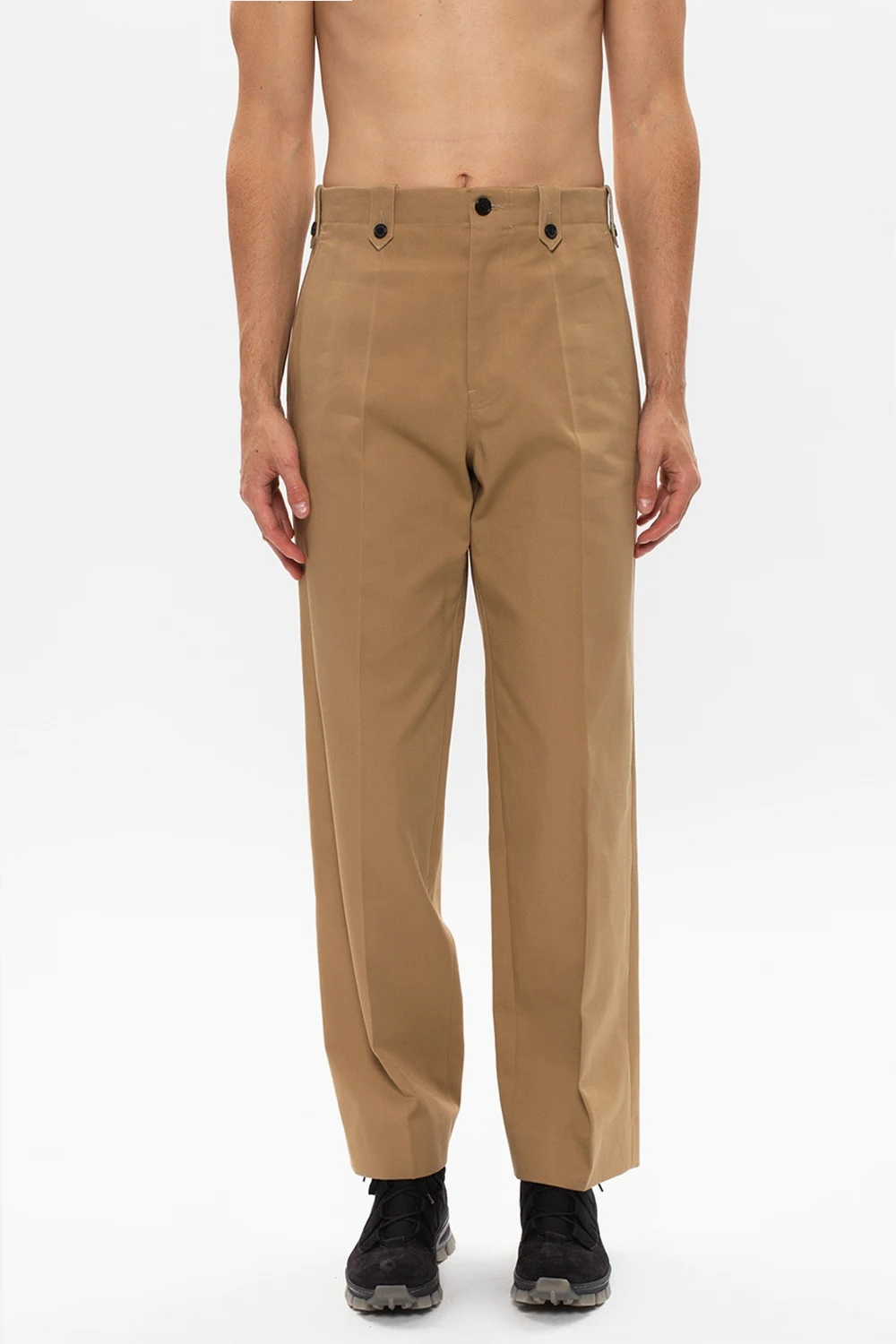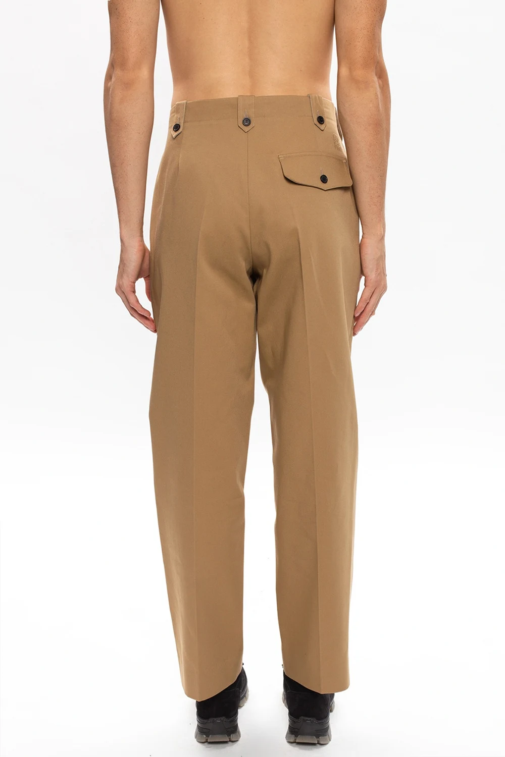 Beżowe, bawełniane spodnie w kant Loewe. Zapinane na zamek i guzik. Z przodu dwie kieszenie. Z tyłu wyszyte logo oraz kieszeń z patką zapinana na guziki.