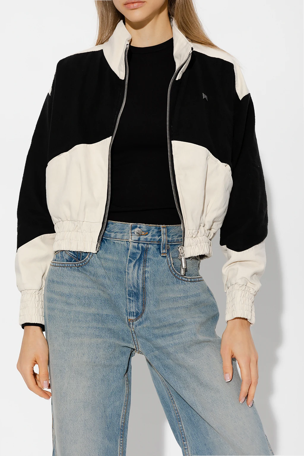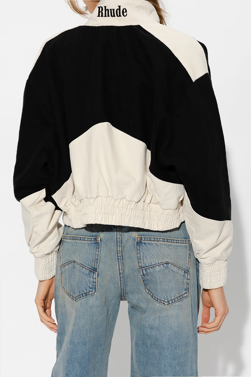 Krótka, czarno-kremowa, bawełniana kurtka o luźnym kroju Rhude. Zapinana na dwubiegunowy zamek. Z przodu aplikacja w kolorze srebrnym z logo i dwie kieszenie. Z tyłu na kołnierzu wyszyte logo. Długie rękawy.