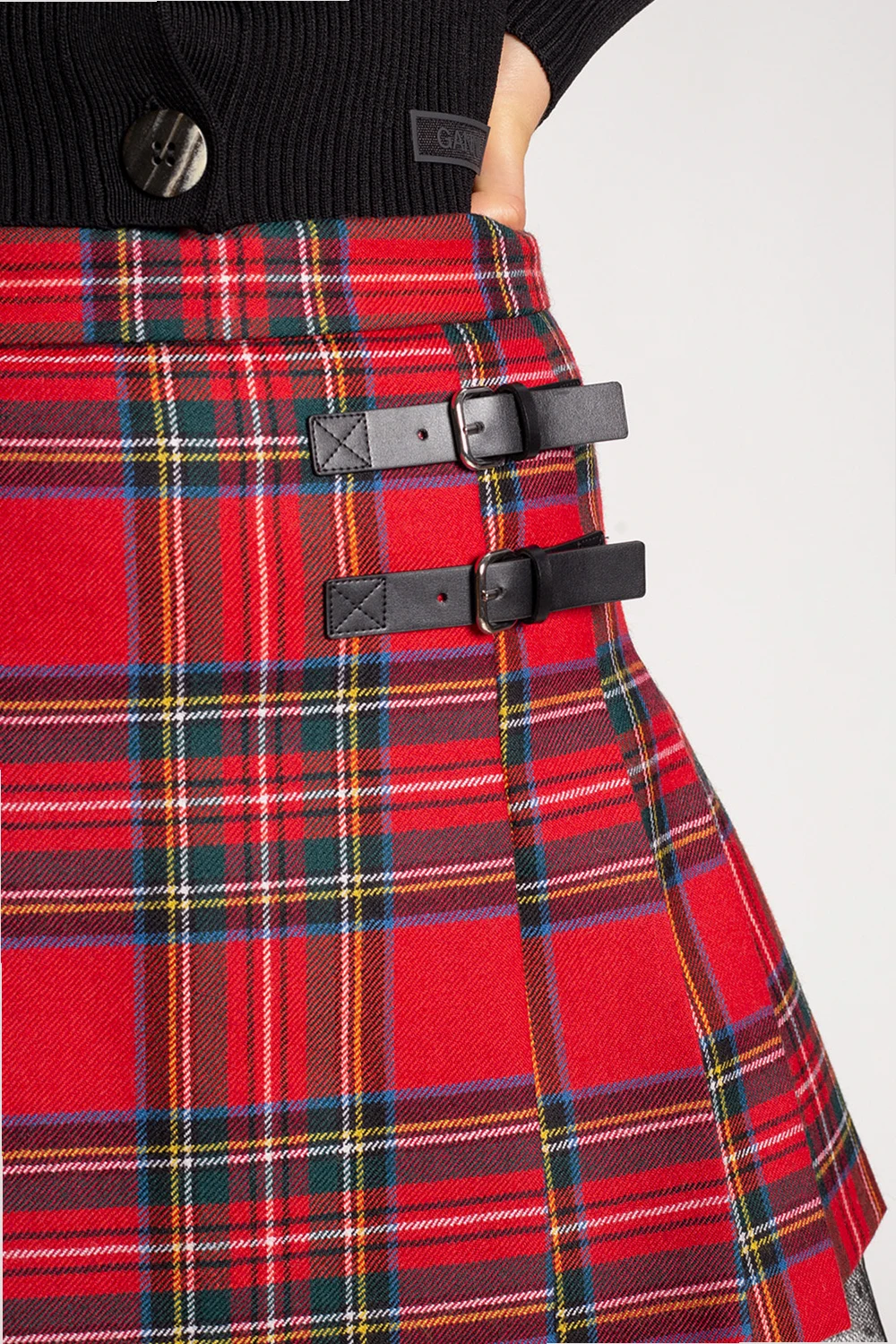 Czerwono-czarna, wełniana, plisowana spódnica Red Valentino. Zapinana z tyłu na zamek i haftkę. Ozdobiona kolorowym wzorem w kratę. Z przodu dwa dekoracyjne paski z klamrą. Czarna, tiulowa warstwa wewnętrzna.