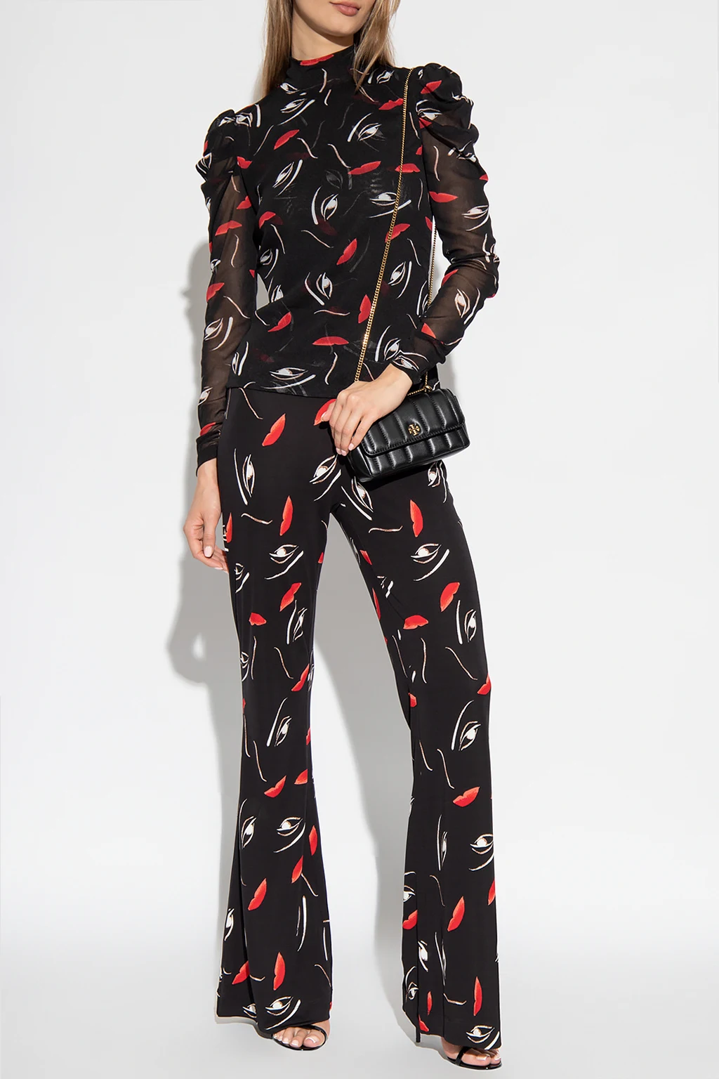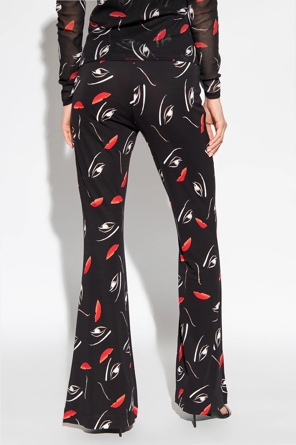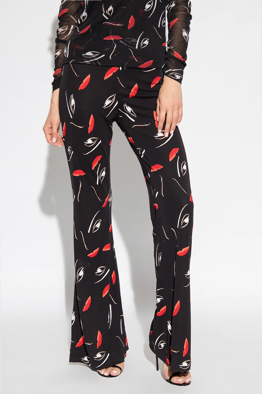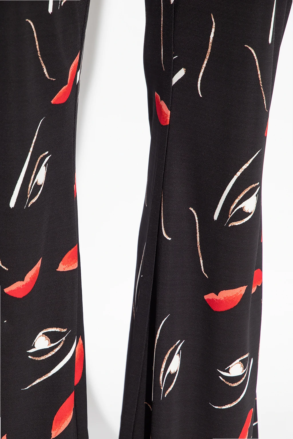 Czarne spodnie z wysokim stanem, model ‘Brooklyn’ Diane Von Furstenberg. W talii wszyta guma. Ozdobione czerwono-beżowo-białym wzorem z motywem twarzy. Długie nogawki rozszerzające się ku dołowi.