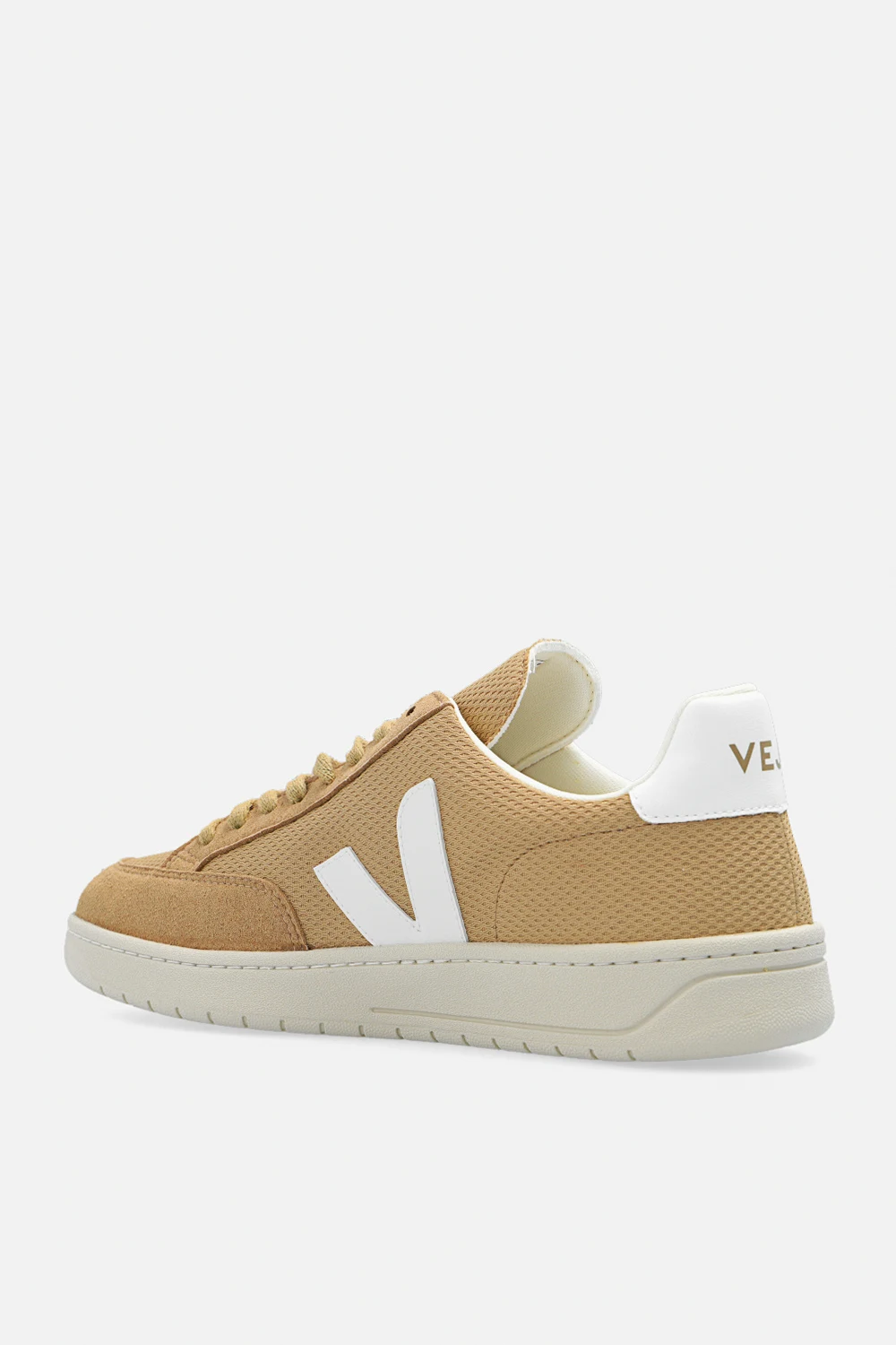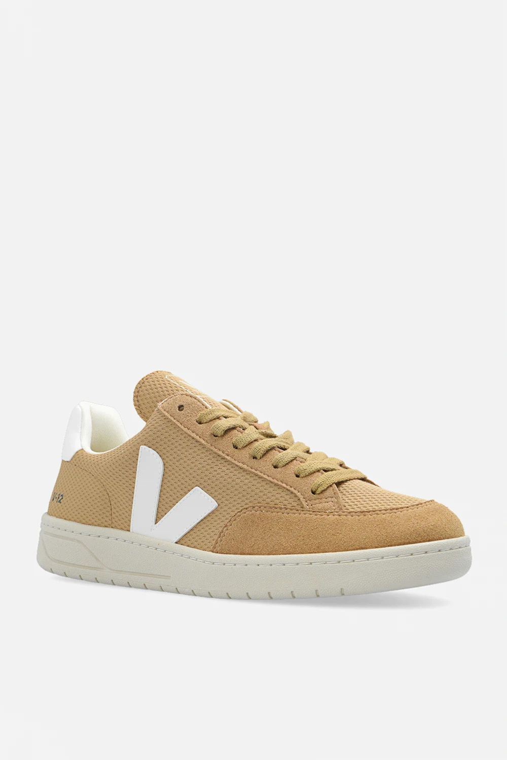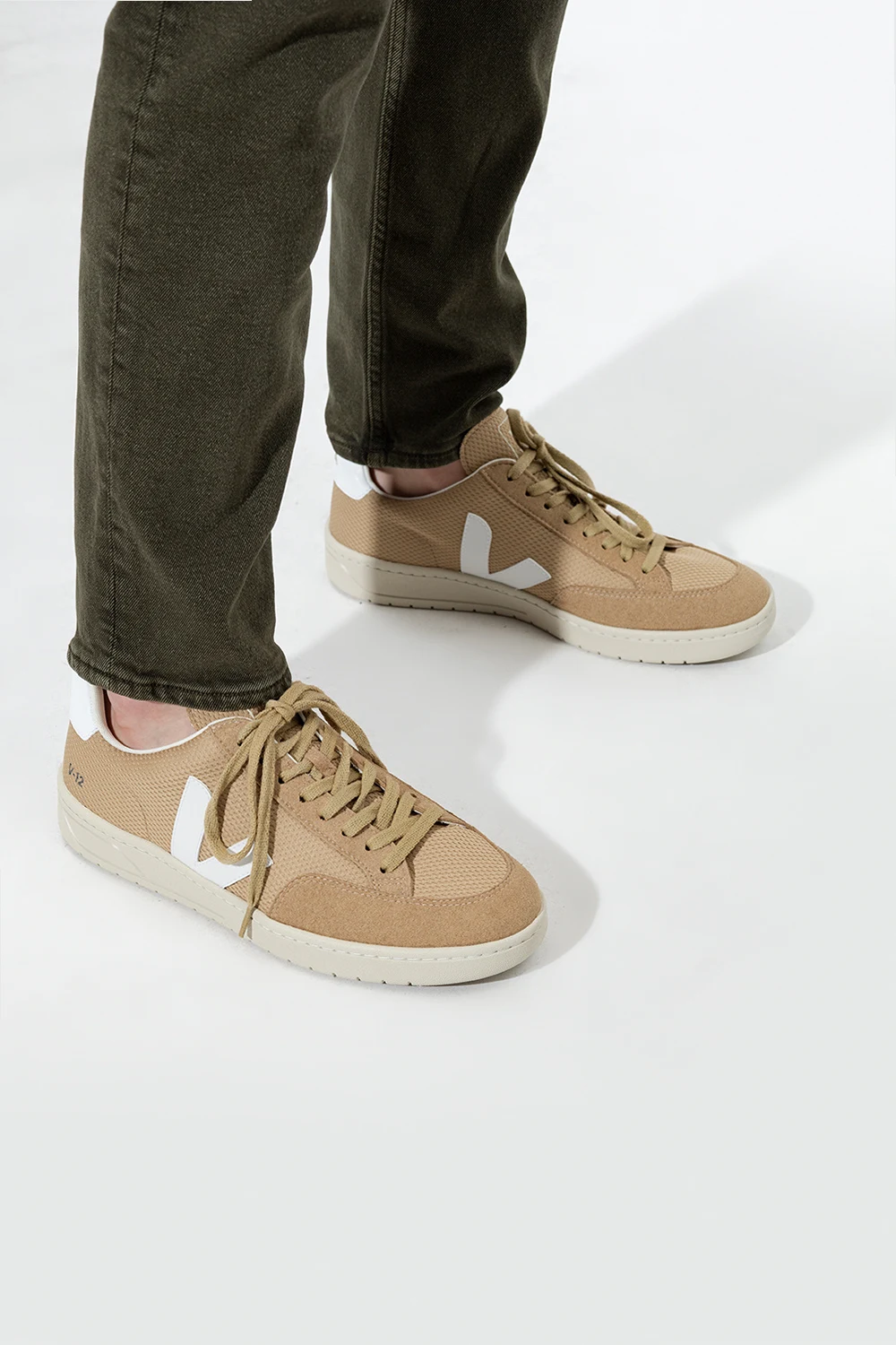 Beżowo-brązowe, sznurowane buty sportowe, model ‘V-12 Alveomesh’ Veja. Wykonane z wytrzymałego siateczkowego materiału Alveomesh, który jest wykonany w 100% z przetworzonych plastikowych butelek z recyklingu. Wykończone wegańskim zamszem. Ozdobione nadrukowanym logo. Charakterystyczna dla marki naszywka w kolorze białym wykonana z gumy oraz odpadów ryżowych. Materiał wkładki składa się z dziko rosnącego kauczuku, trzciny cukrowej, organicznej bawełny i pianki EVA pochodzącej z recyklingu. Środkowa podeszwa wykonana z trzciny cukrowej, natomiast zewnętrzna część podeszwy jest klejona i wykonana z gumy pochodzącej z lasu amazońskiego oraz odpadów ryżowych, perforowana powierzchnia zapewnia przyczepność i amortyzację. Elastyczna siateczkowa podszewka to materiał w 100% z recyklingu plastikowych butelek, został zaprojektowany tak, aby uzyskać najwyższą odporność na tarcie, zapewnić komfort i wygodę podczas chodzenia.
