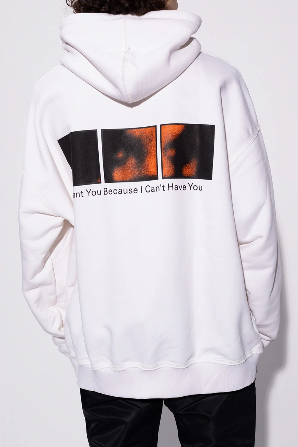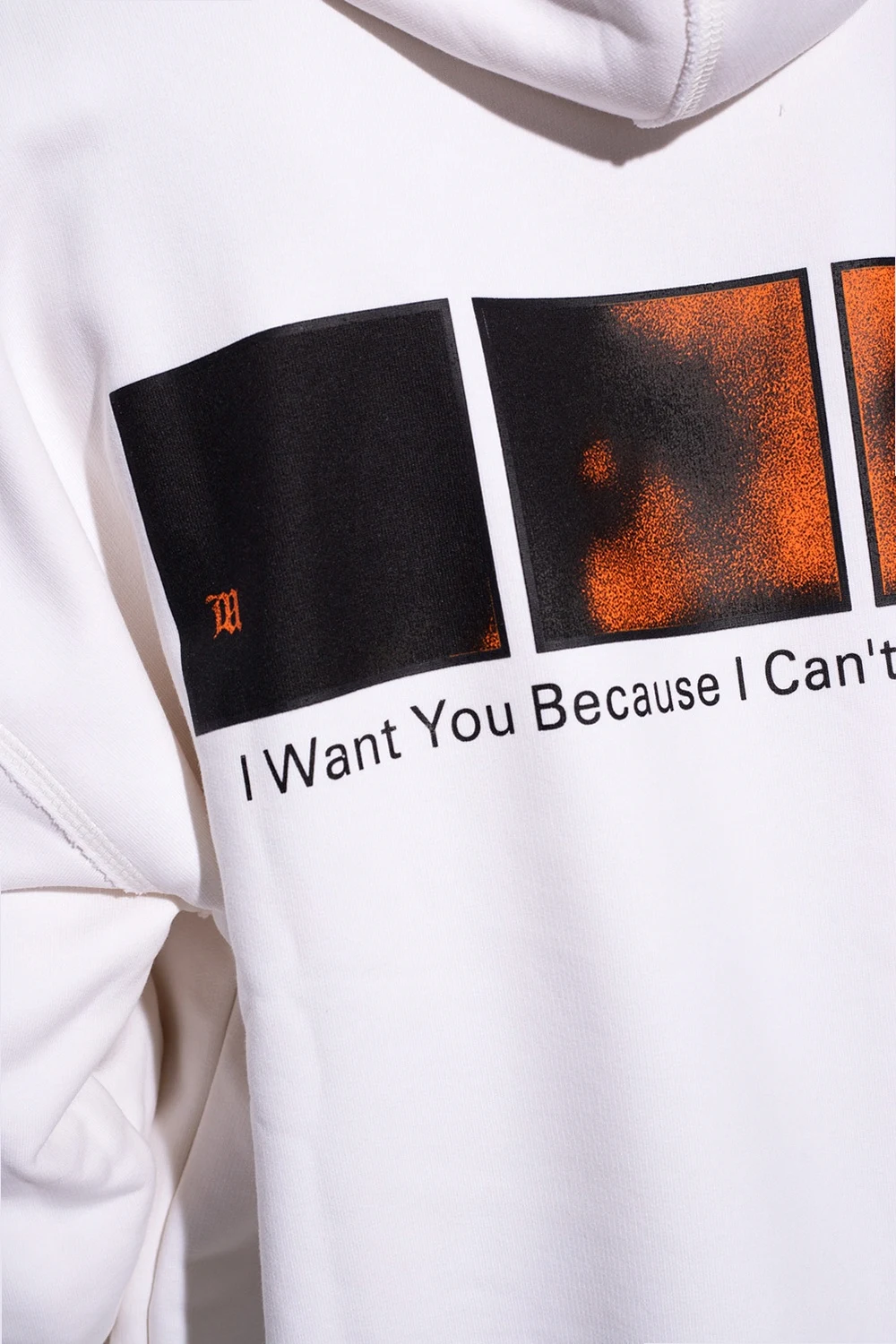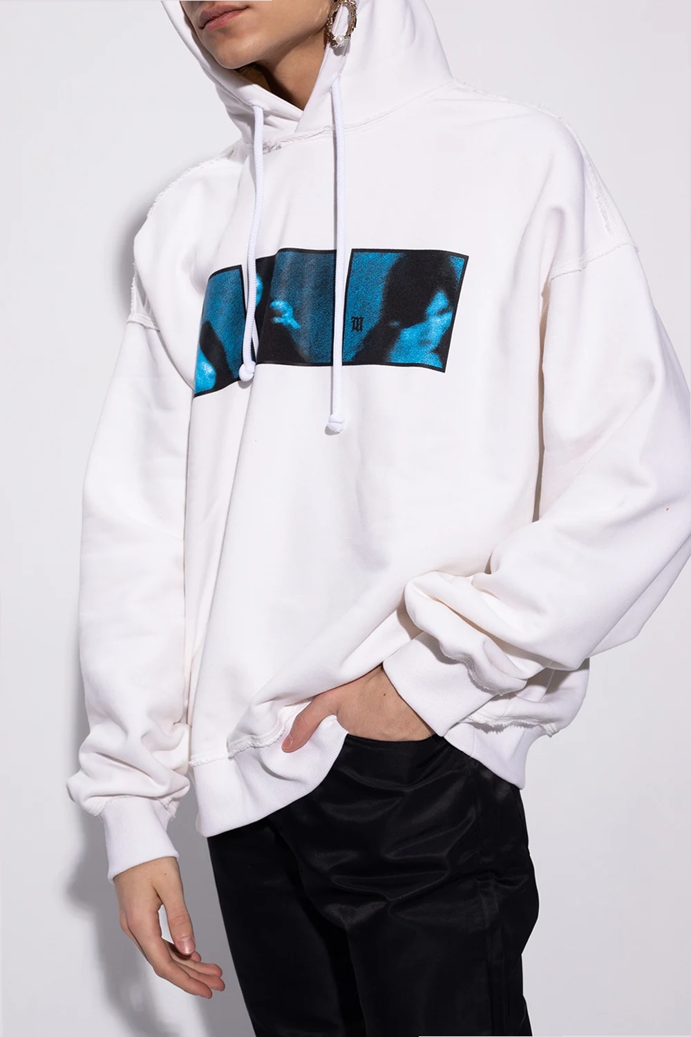 Biała bluza, model, I Want You’ MISBHV. Wykonana z bawełny organicznej. Kaptur ściągany trokami. Ozdobiona nadrukowanym niebiesko-czarnym wzorem i logo. Dół i długie rękawy zakończone ściągaczem. Surowe wykończenie.