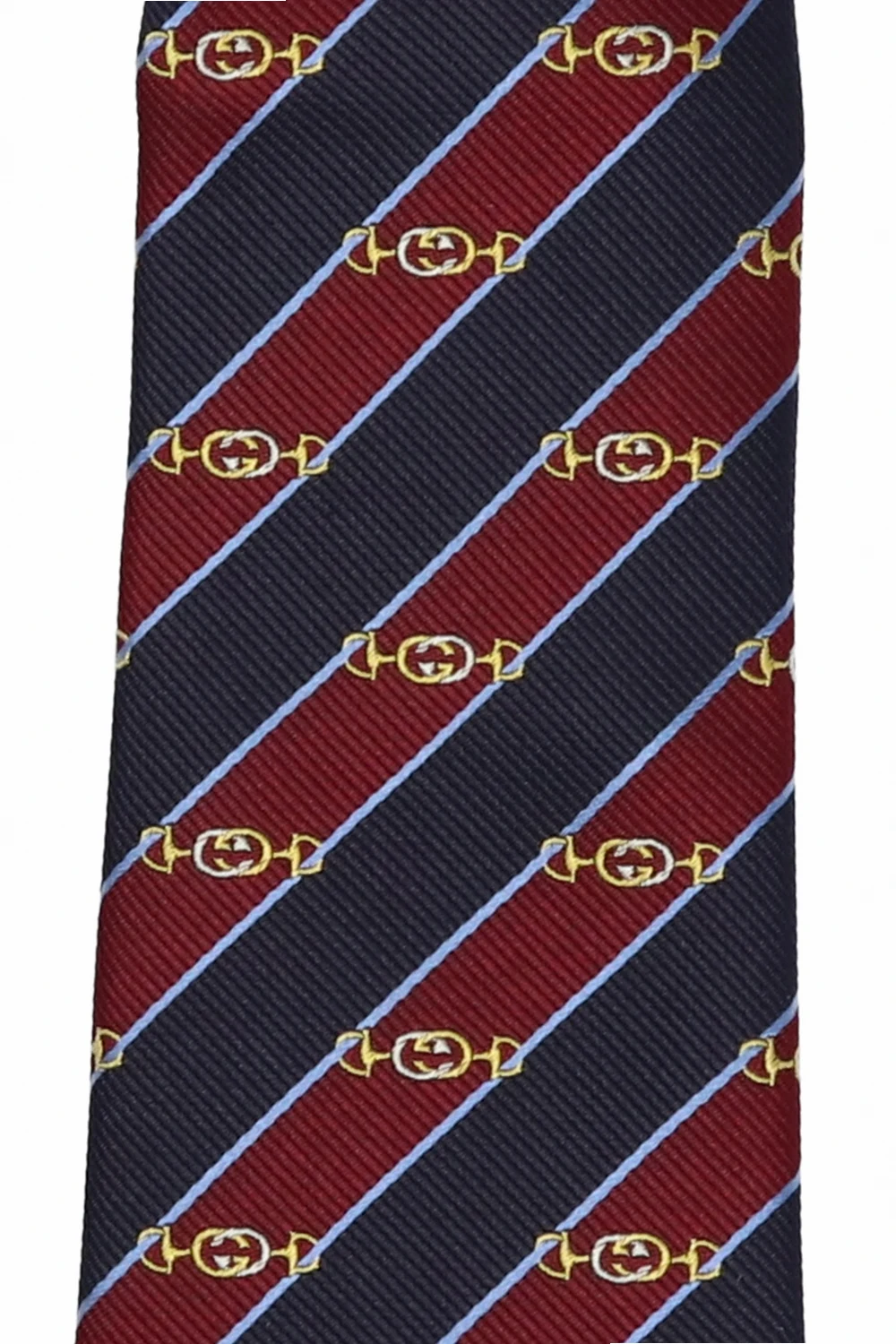 Bordowo-granatowy, jedwabny krawat Gucci. Ozdobiony wzorem z motywem wędzidła w kolorze beżowo-żółtym oraz niebieskimi pasami.