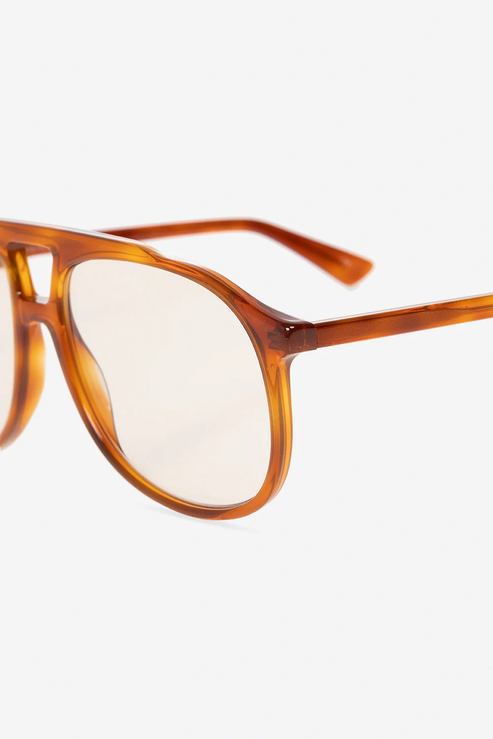 Brązowe okulary korekcyjne Gucci. Oprawki typu ‘aviator’. Zauszniki ozdobione logo w kolorze złotym. Dołączone etui w losowo wybranym kolorze.