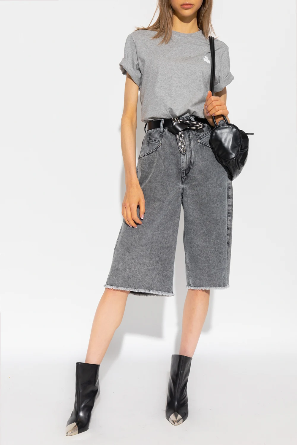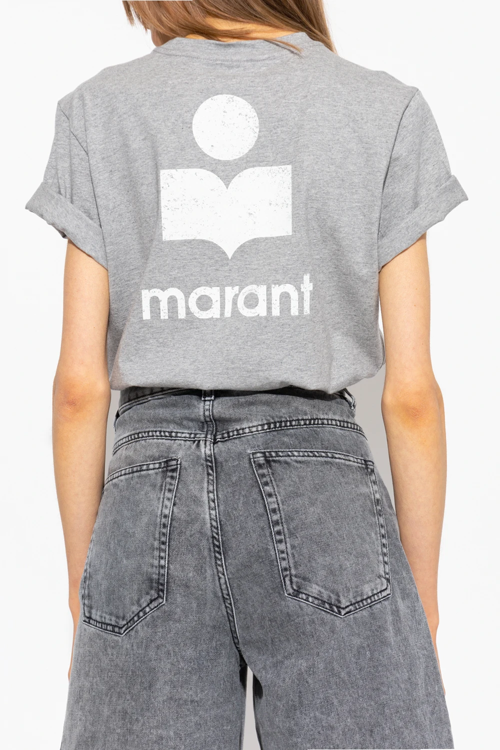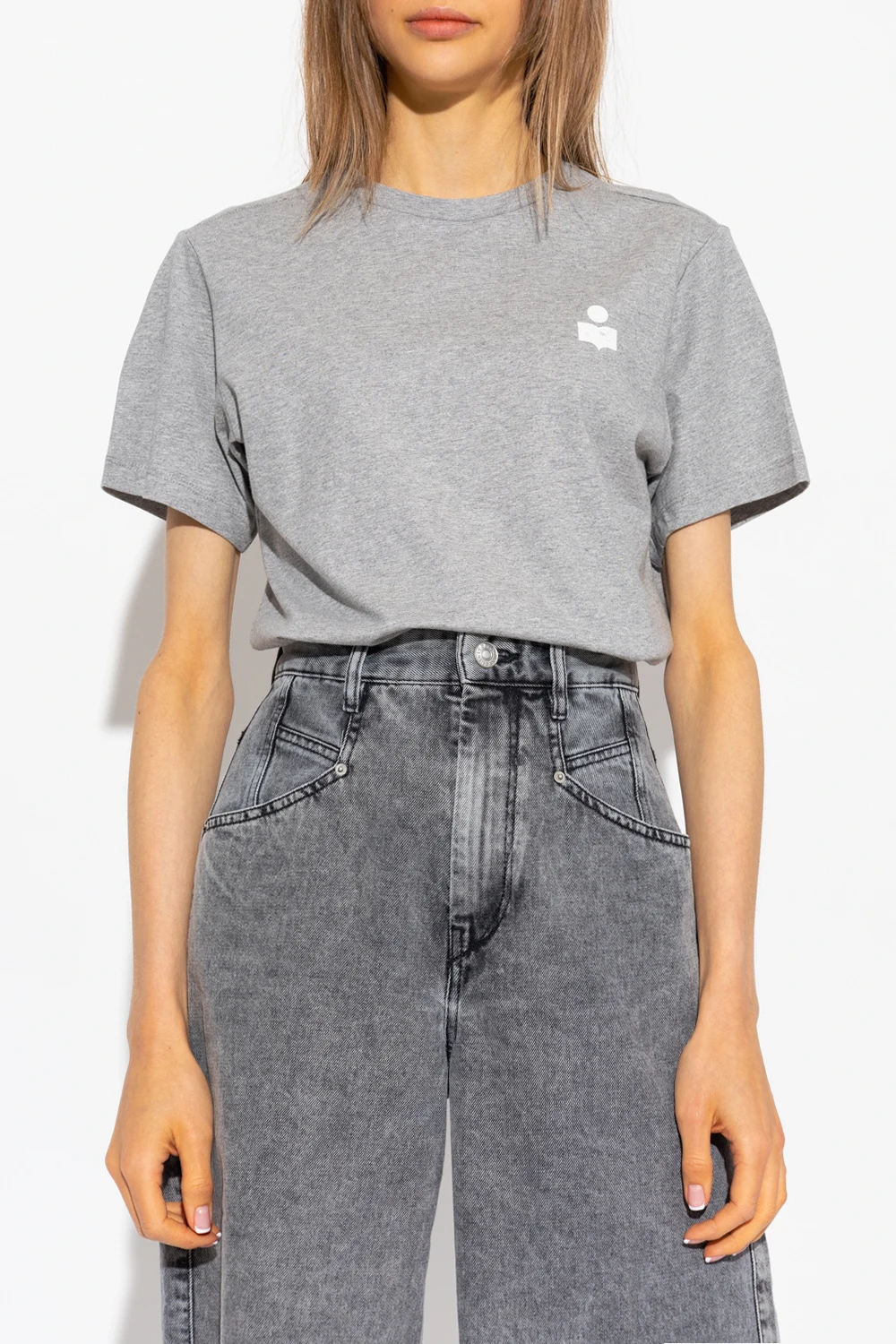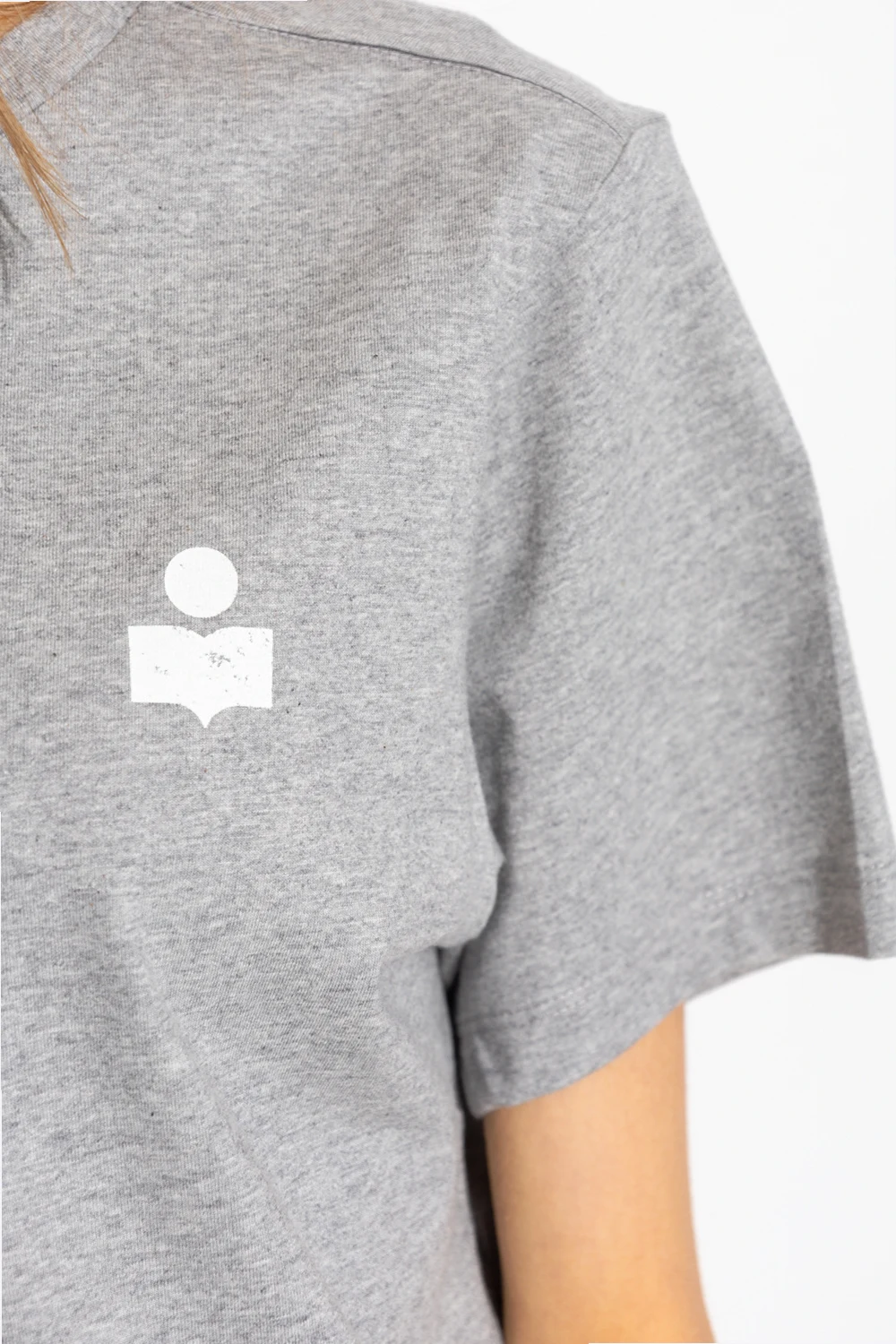 Szary, bawełniany t-shirt, model ‘Zewel’ Isabel Marant Etoile. Z przodu oraz z tyłu biały nadruk z logo wykończony efektem ‘vintage’. Okrągły dekolt wykończony ściągaczem, krótkie rękawy.