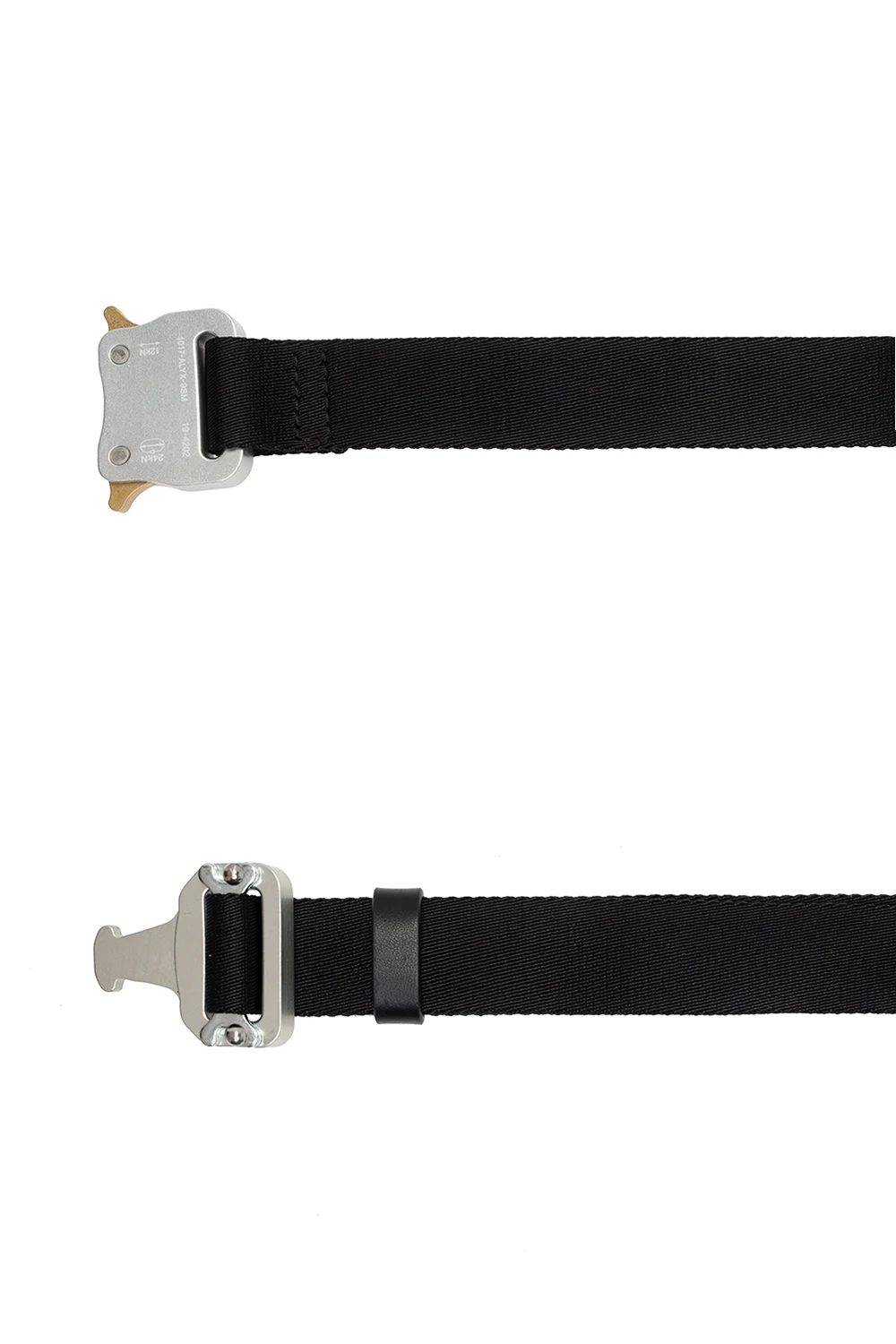 Czarny pasek 1017 ALYX 9SM. Metalowa klamra w kolorze srebrno-złotym z nadrukowanym logo.