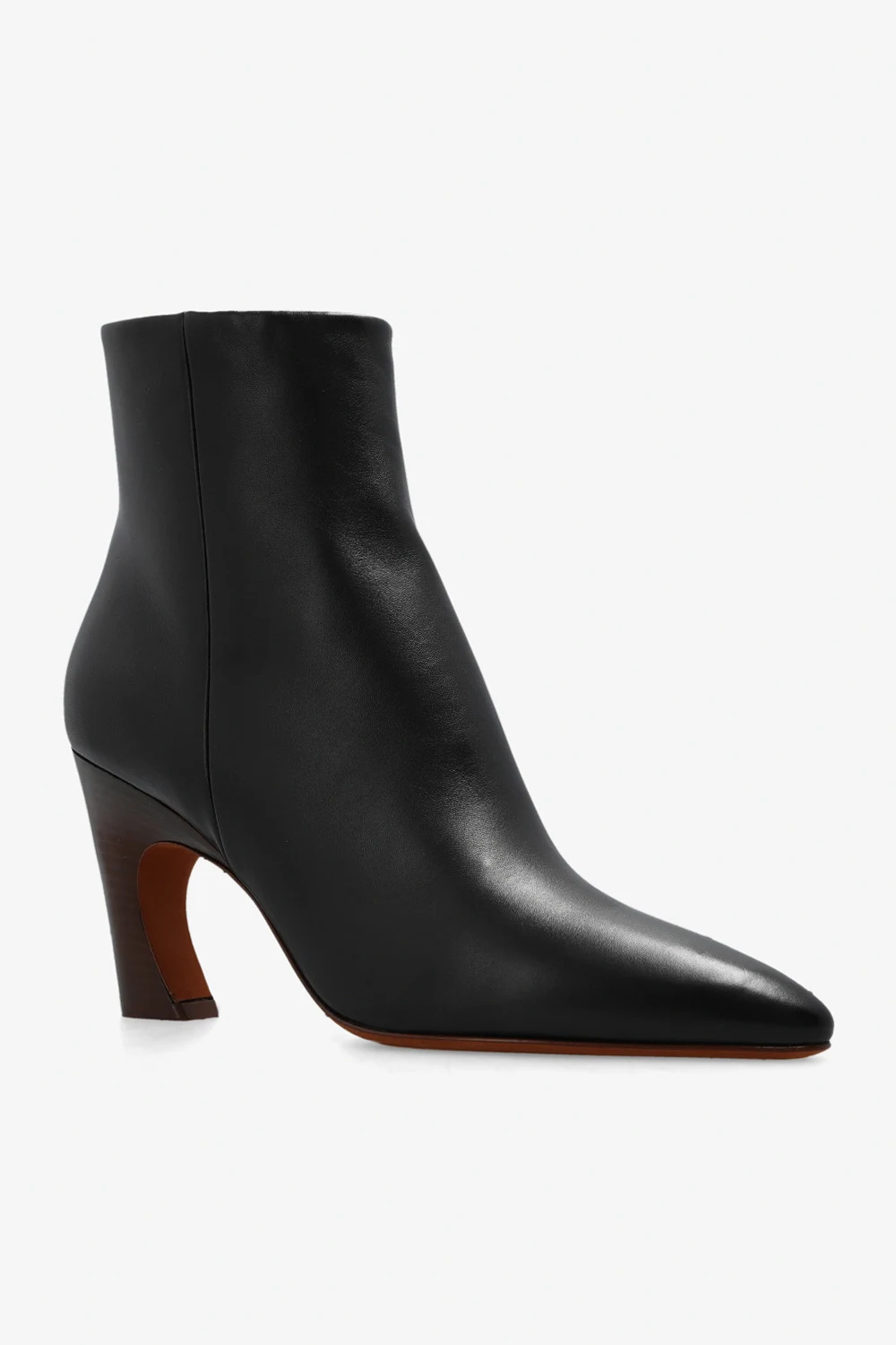 Czarne botki na obcasie, model ‘Oli’ Chloé. Wykonane z cielęcej skóry. Z boku zapinane na zamek. Dekoracyjny ciemnobrązowy obcas. Brązowa, skórzana podeszwa.