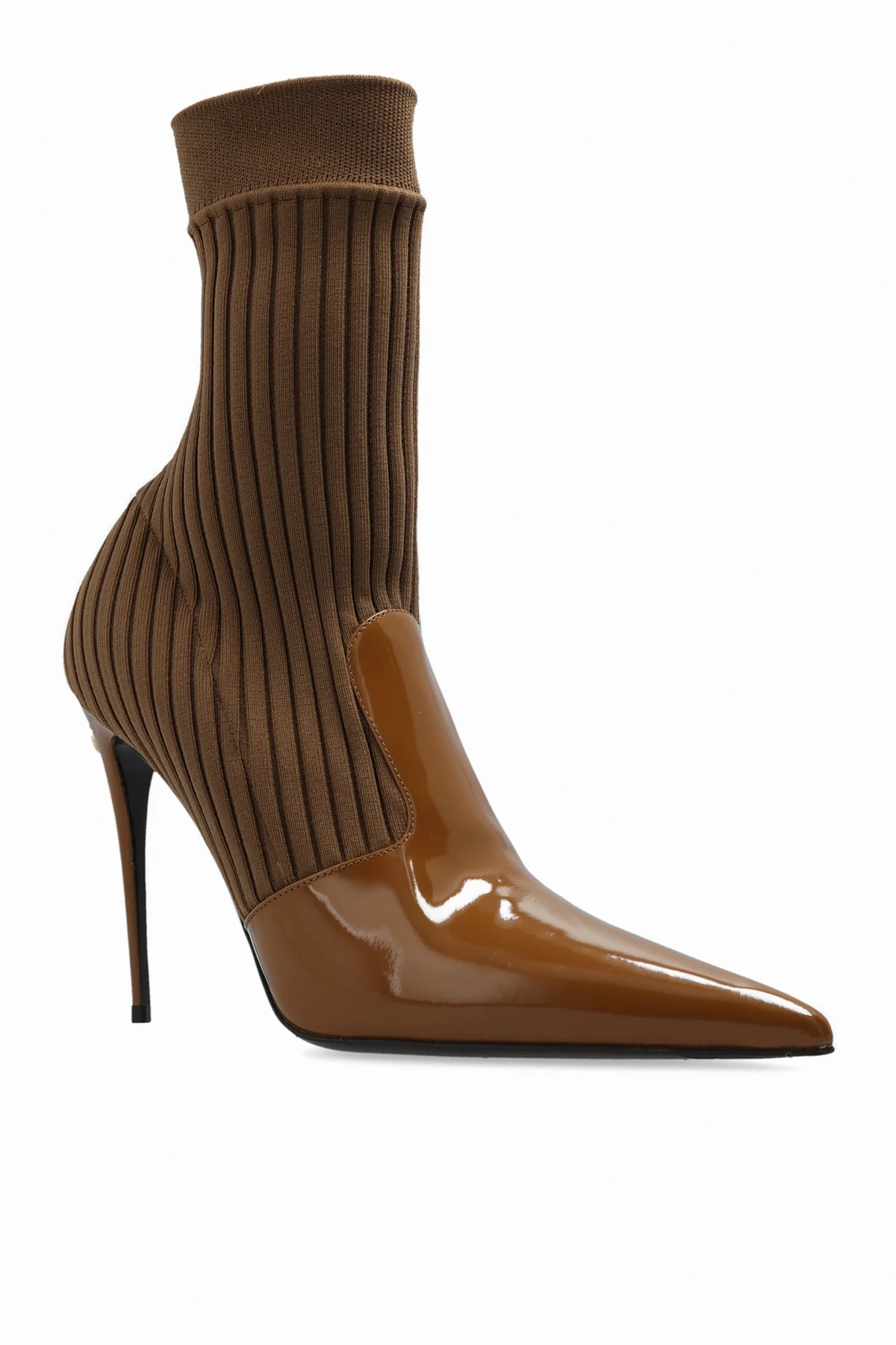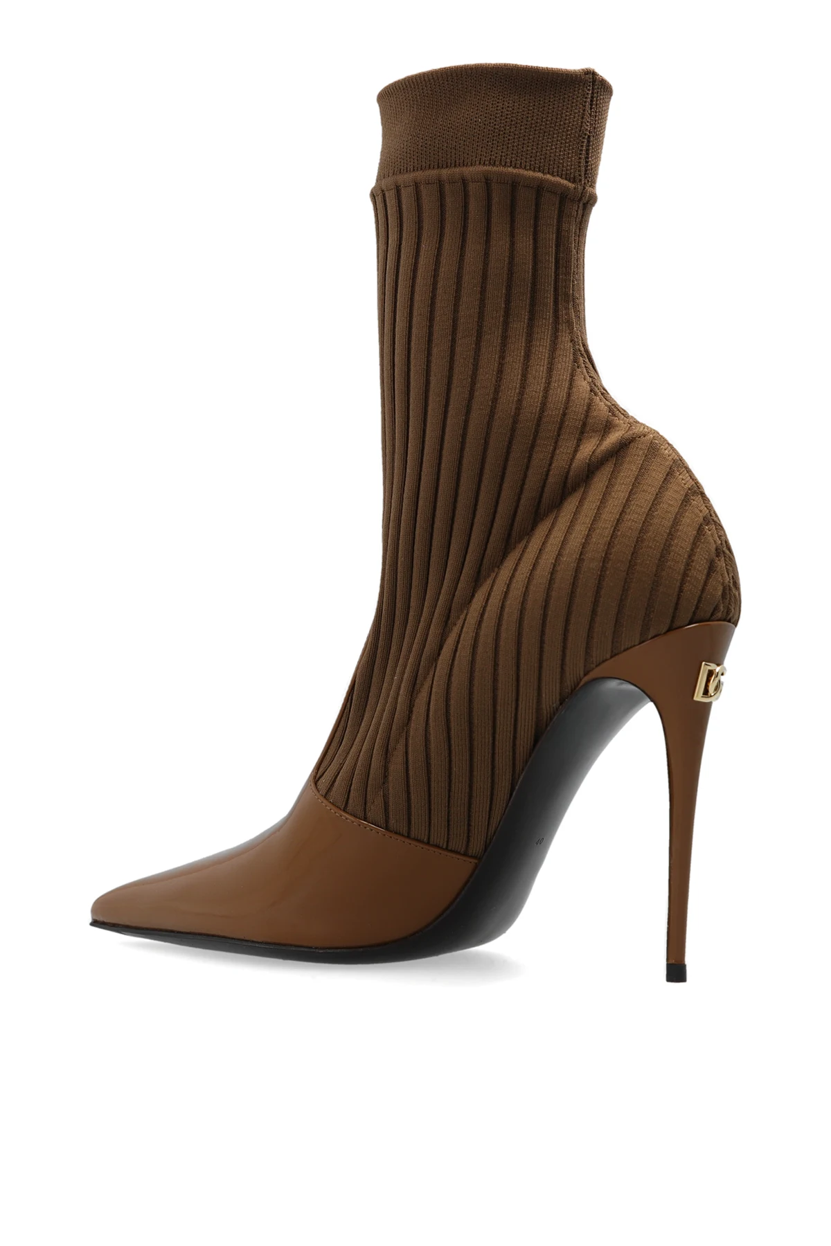Brązowe botki na obcasie z prążkowaną skarpetą Dolce & Gabbana. Wykonane z materiału. Wykończone lakierowaną skórą. Nosek w szpic. Obcas ozdobiony metalową aplikacją w kolorze złotym w kształcie logo. Ciemnobrązowa, skórzana podeszwa.