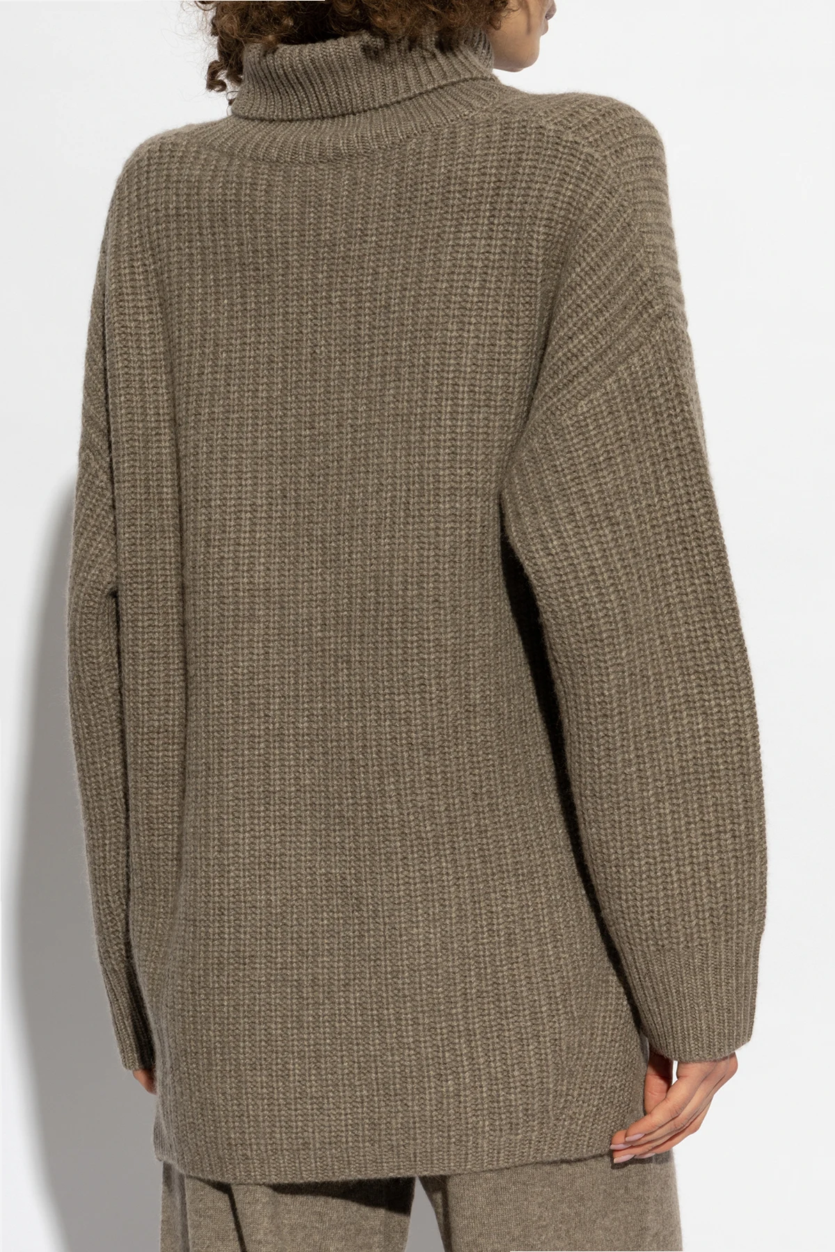 Golf charakteryzuje się luźnym, oversize'owym krojem , który gwarantuje swobodę ruchów, a jego klasyczny, wysoki kołnierz skutecznie chroni przed chłodem. Delikatny wzór prążków dodaje subtelnej tekstury, podkreślając unikatowy charakter tego niezwykłego projektu.