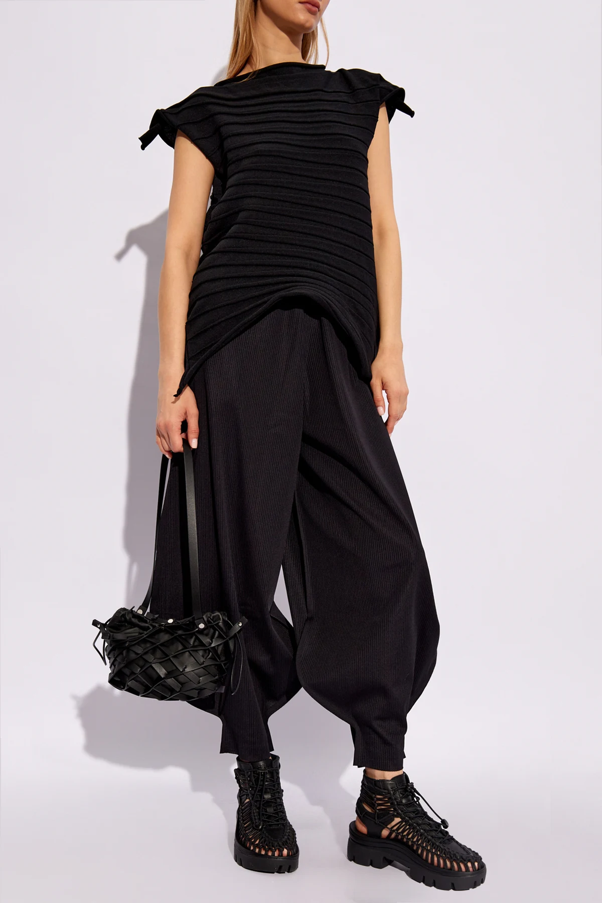 Prezentujemy Państwu kwintesencję miejskiego szyku i komfortu - Prążkowane Spodnie z ekskluzywnej kolekcji Issey Miyake Pleats Please . Wykonane z zaawansowanej mieszanki poliestru, nylonu i poliuretanu, te czarne spodnie o luźnym fasonie są zarówno funkcjonalne, jak i wyraźnie modne. Ich prążkowana faktura nie tylko wzbogaca wizualną estetykę, ale również subtelnie maskuje wszelkie niedoskonałości materiału, dodając ubraniu niepowtarzalnego charakteru.