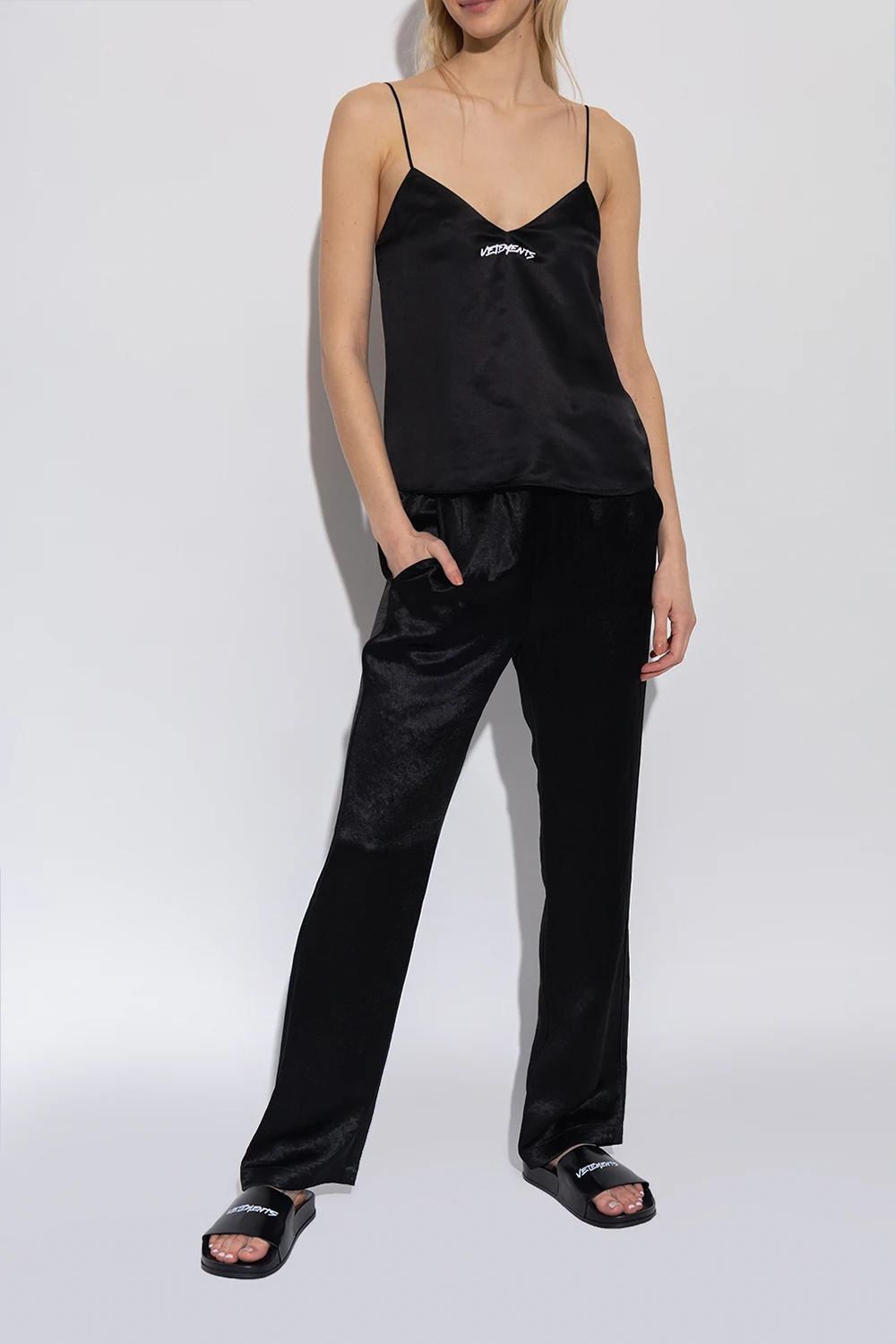Czarne, skórzane klapki VETEMENTS. Ozdobione nadrukowanym logo w kolorze białym. Czarna, gumowa podeszwa.