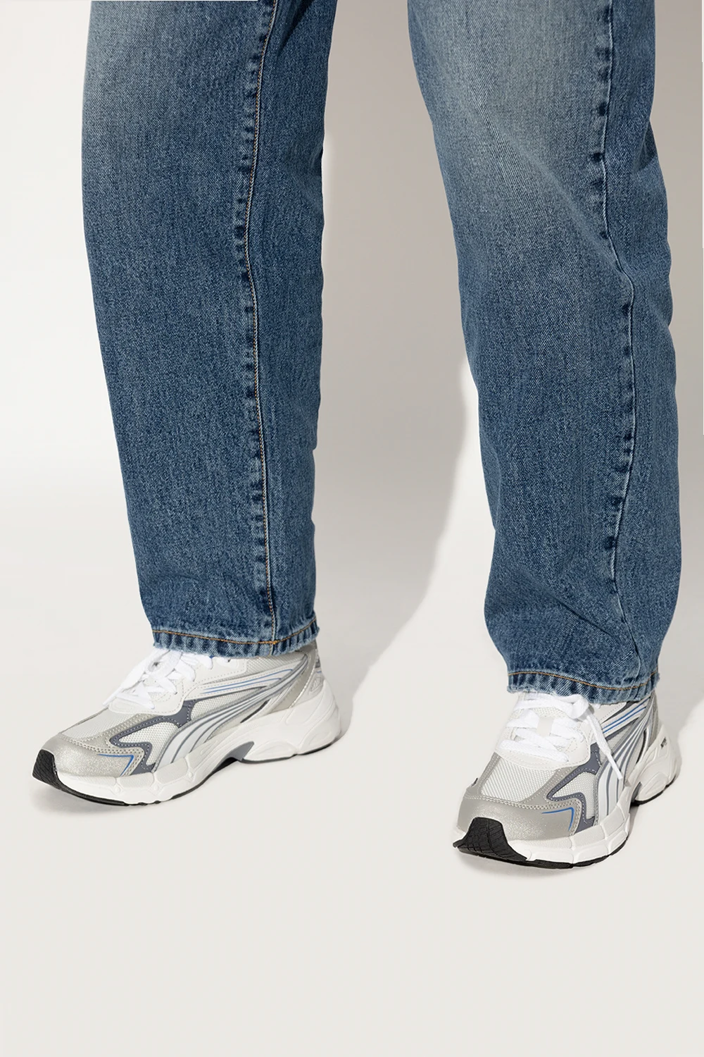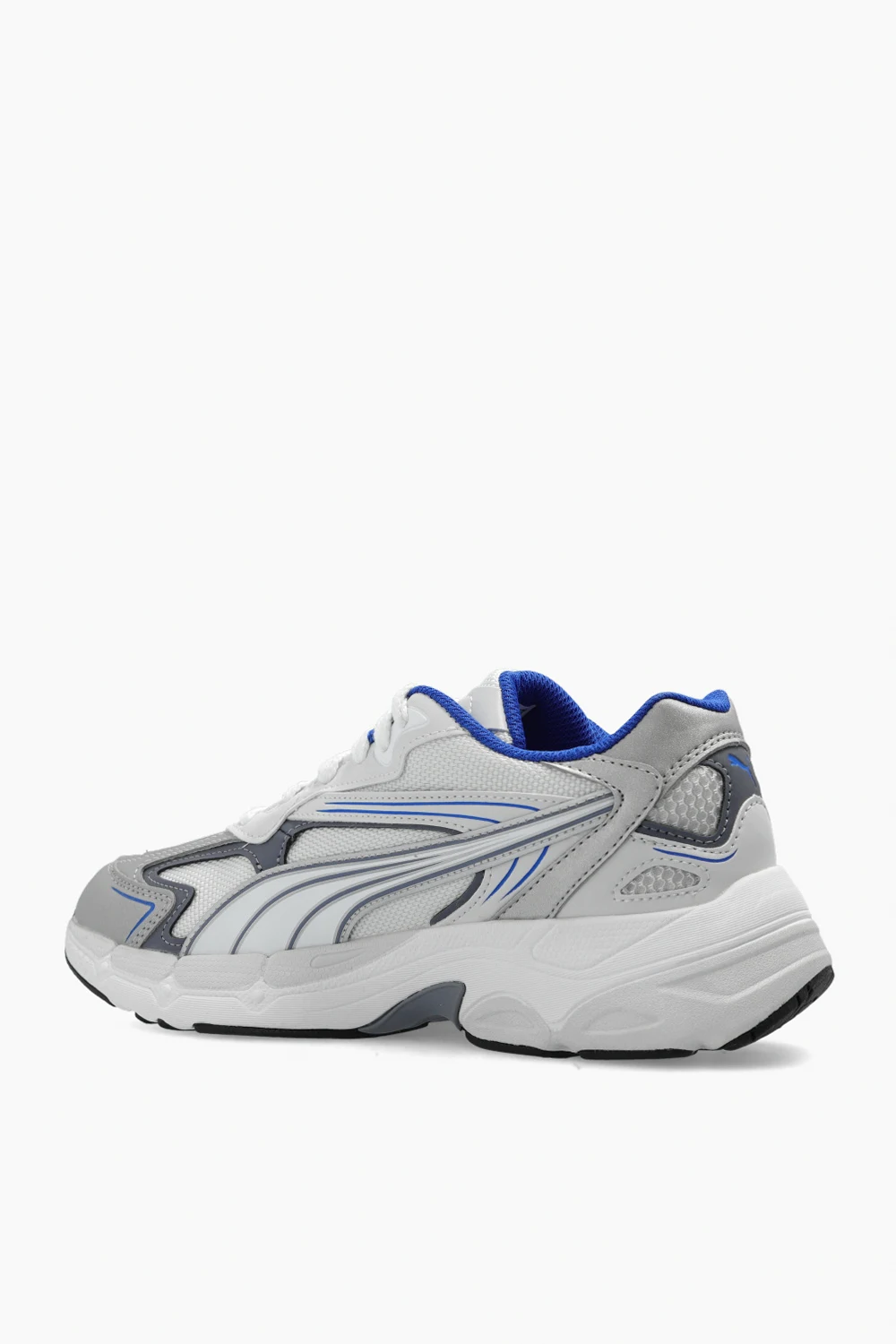 Biało-szaro-niebieskie, sznurowane buty sportowe, model ‘Teveris Nitro’ Puma. Cholewa z siateczki z podkładkami ze sztucznej skóry i zamszowymi nakładkami. Podeszwa środkowa CMEVA. Ozdobione wytłoczonym logo. Pianka NITRO zastosowana w podeszwie środkowej zapewnia amortyzację na najwyższym poziomie, reakcję na ruchy stopy i uczucie lekkości jak w powietrzu.