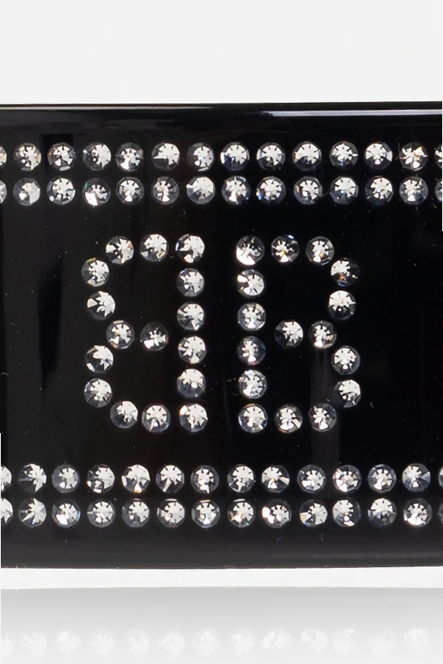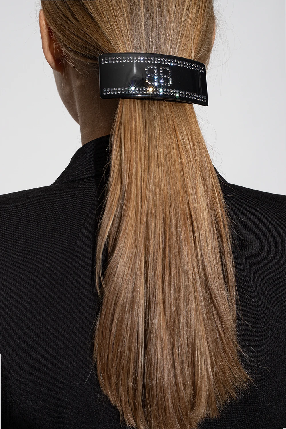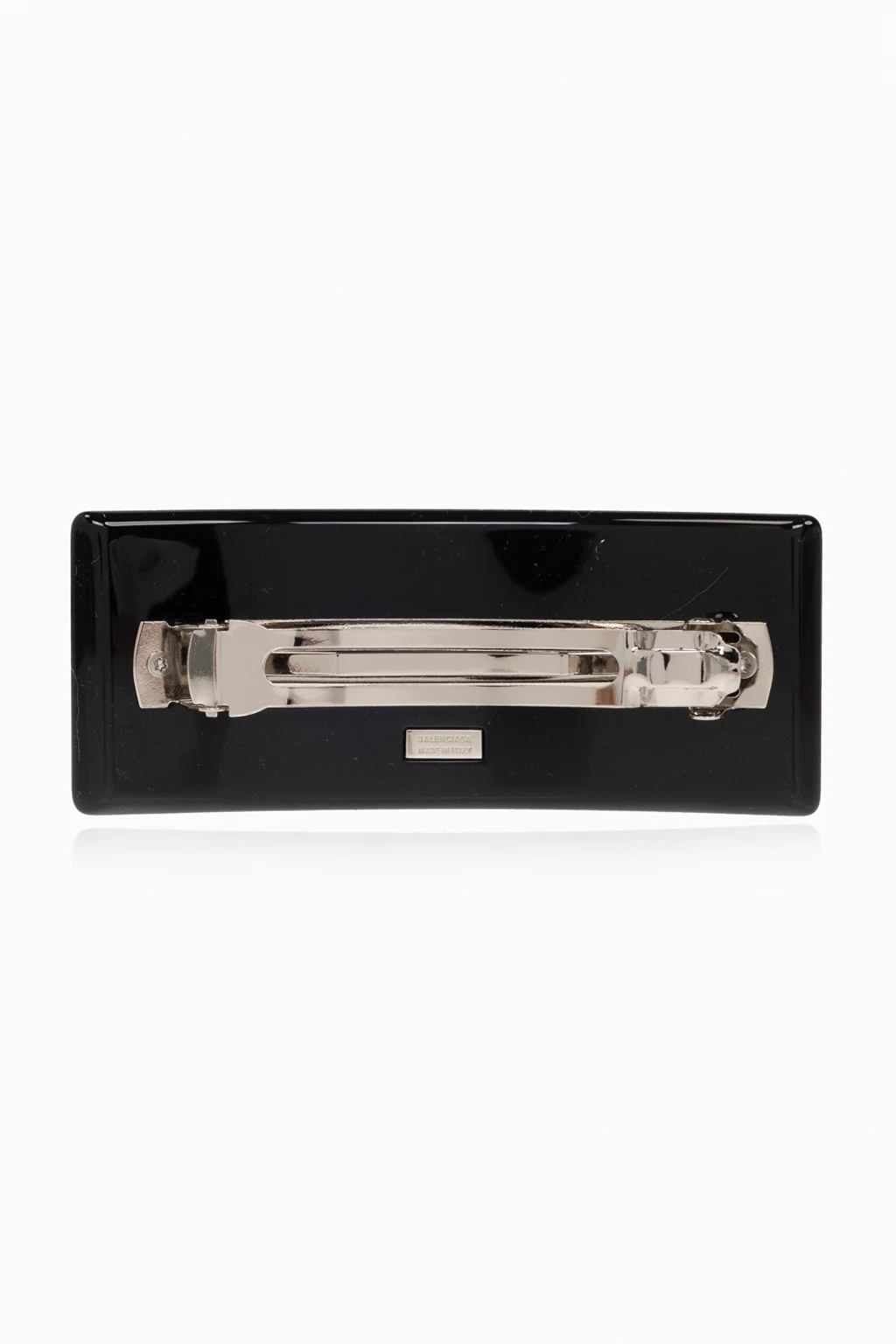 Czarna spinka do włosów Balenciaga. Wykonana z żywicy i mosiądzu. Ozdobiona wzorem z logo wykończonym połyskującymi kryształami.