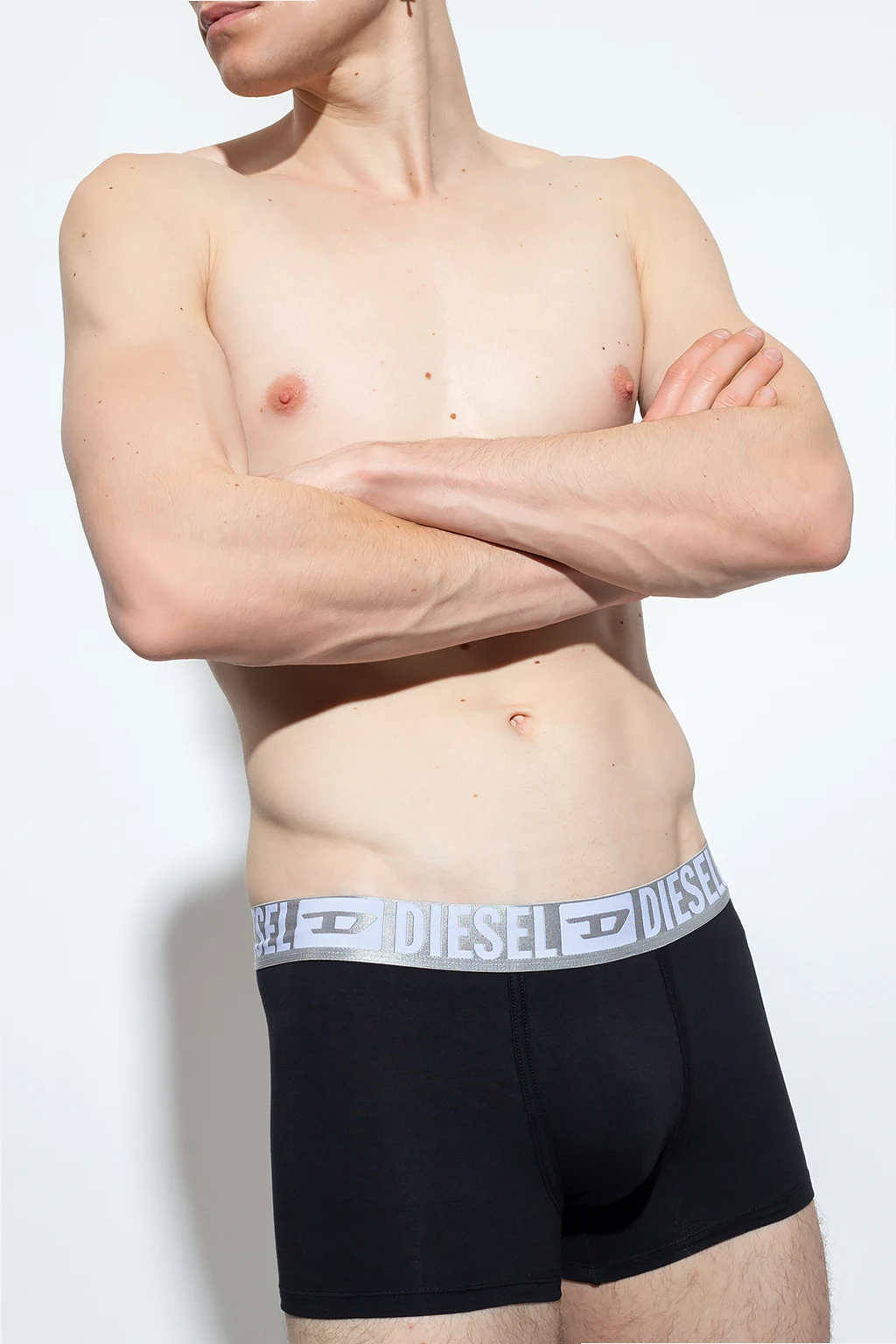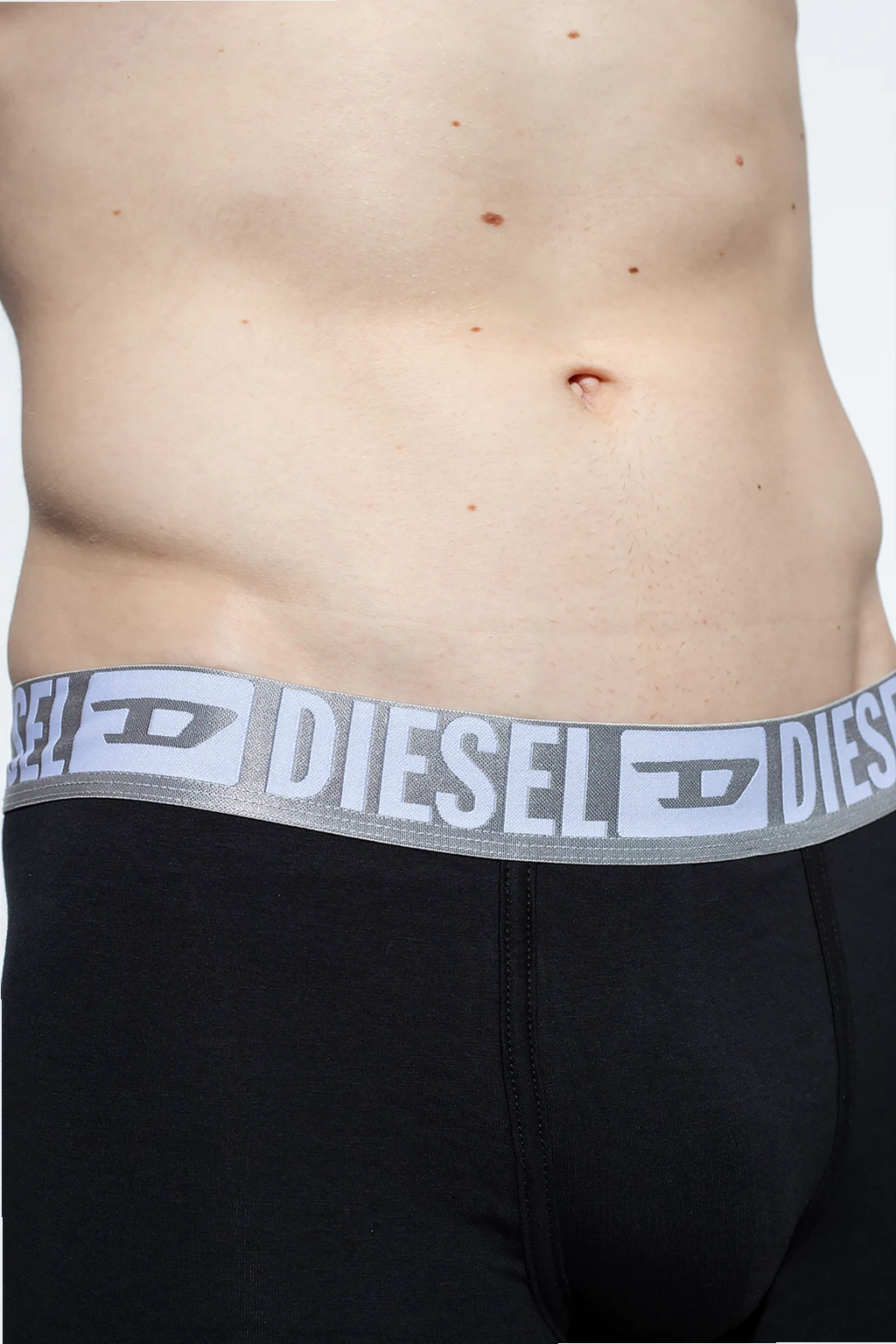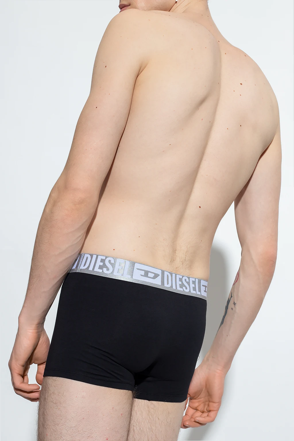 Dwupak czarnych, bawełnianych bokserek, model ‘Umbx-Damien’ Diesel. W pasie wszyta szara guma z wyszytym logo.