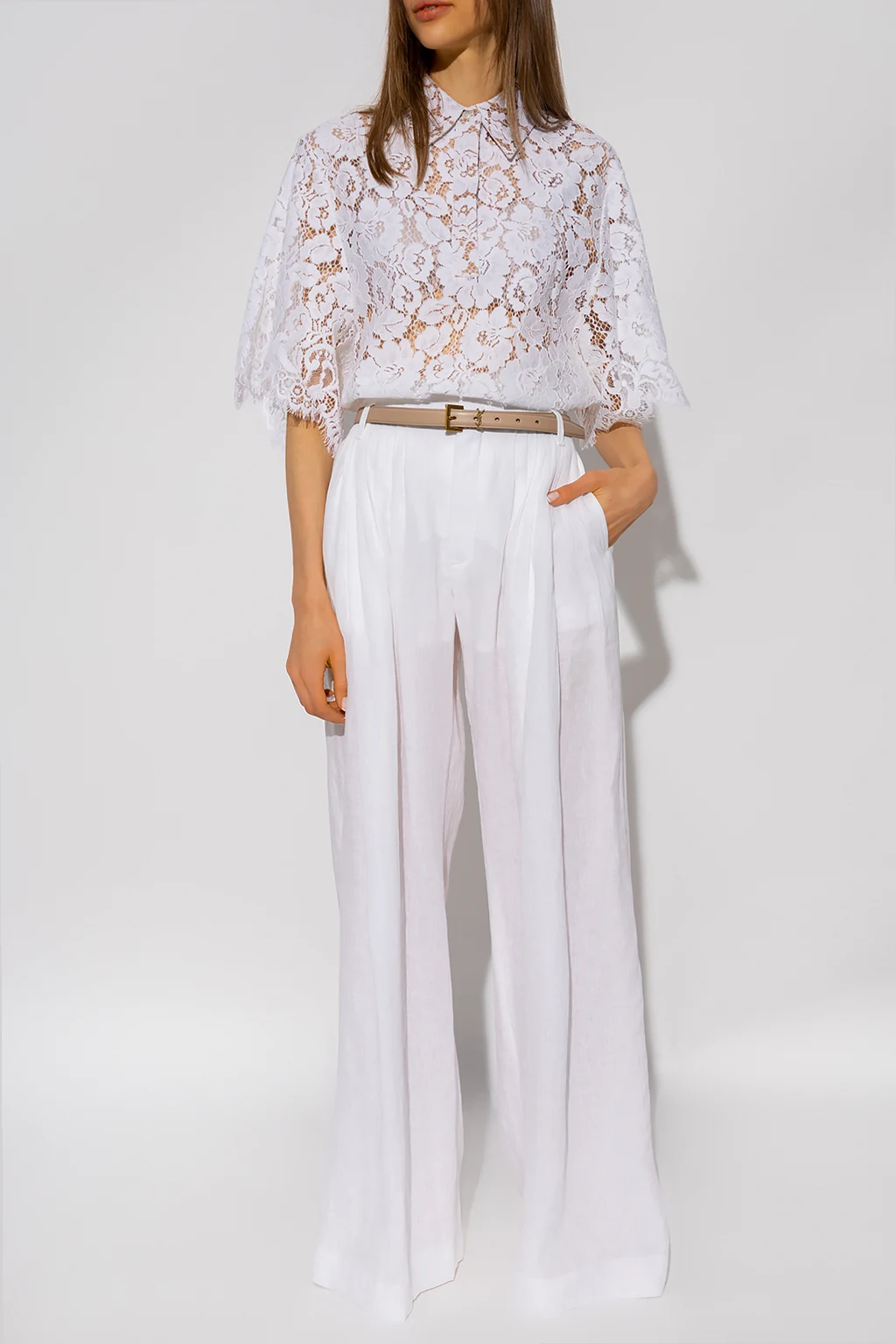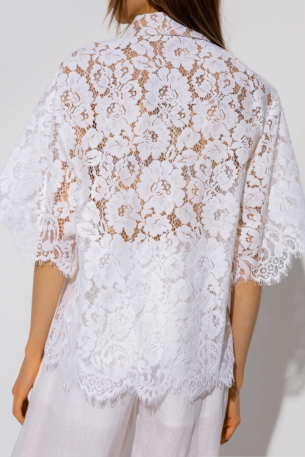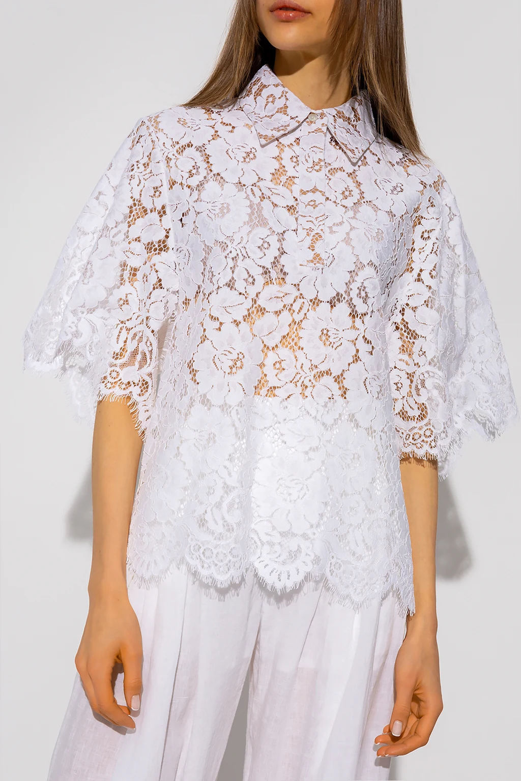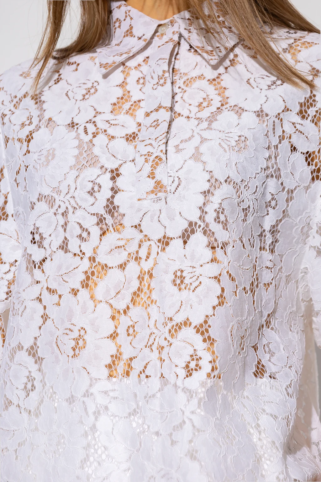Biało-beżowy, koronkowy top Michael Kors. Pod szyją zapinany na guziki. Surowe wykończenie. Krótkie rękawy.