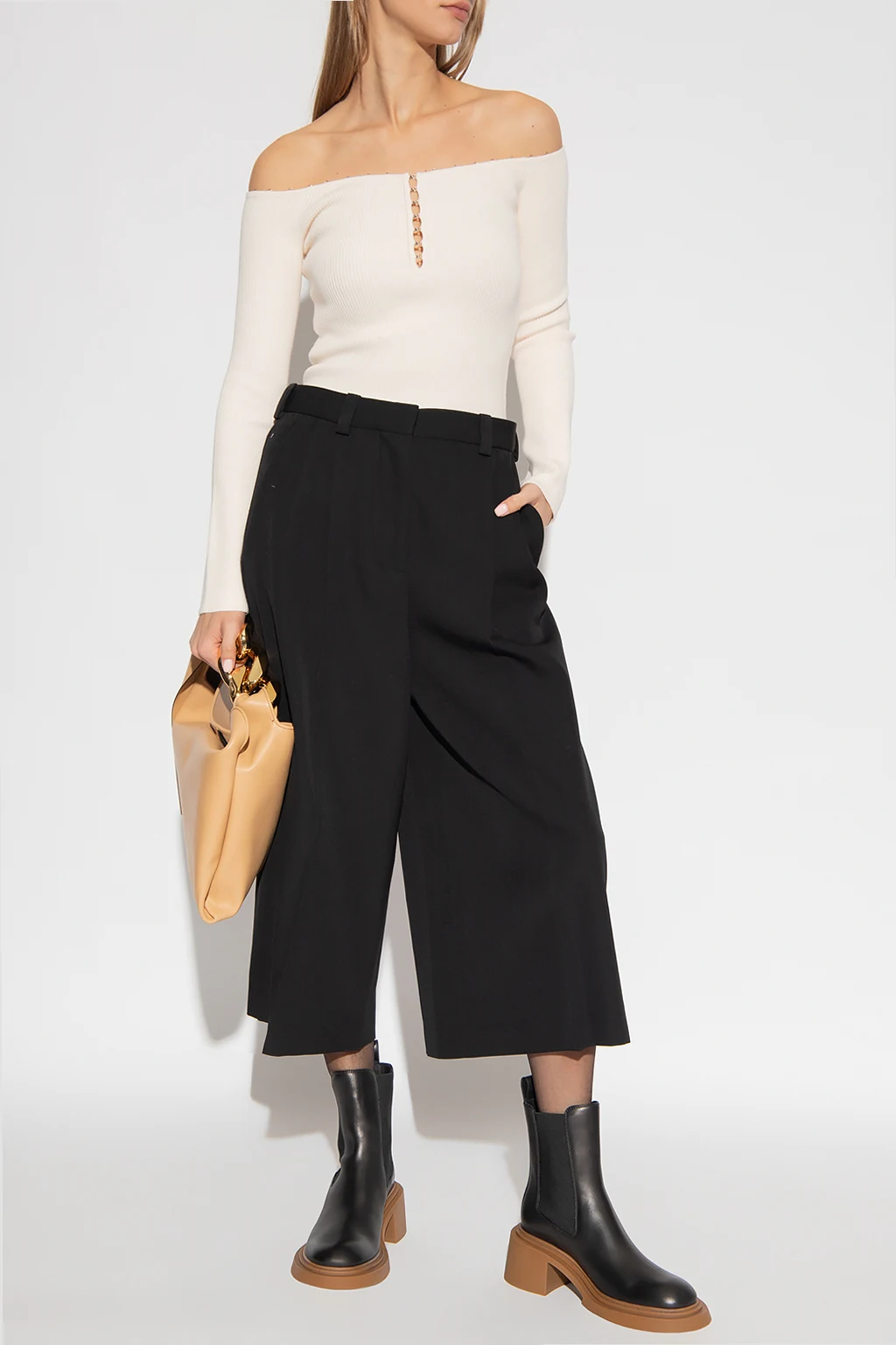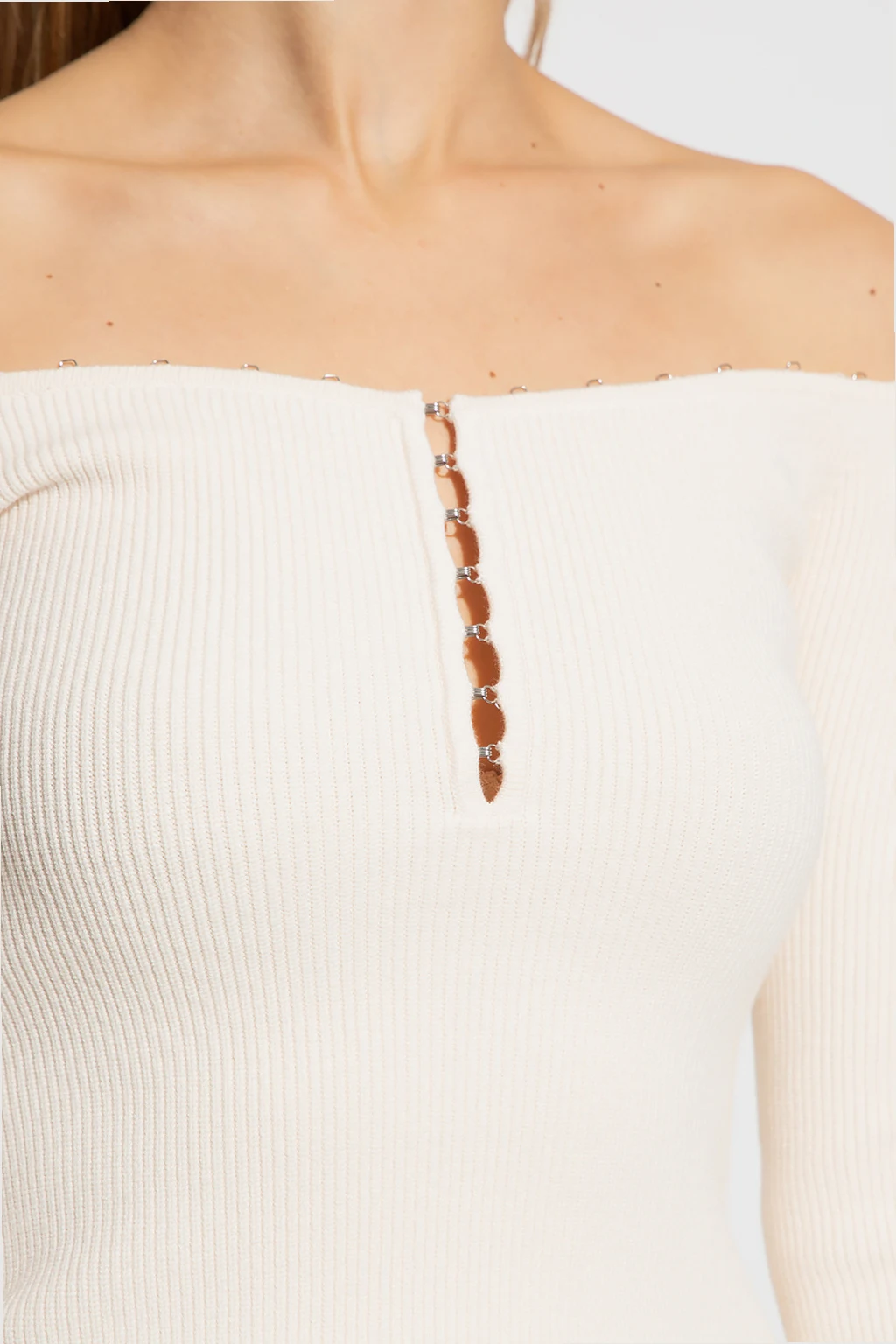 Kremowy, prążkowany top z odkrytymi ramionami Helmut Lang. Dopasowany krój. Dekolt z rozcięciem zapinany na haftki. Długie rękawy.
