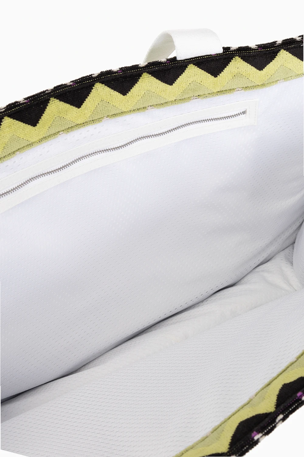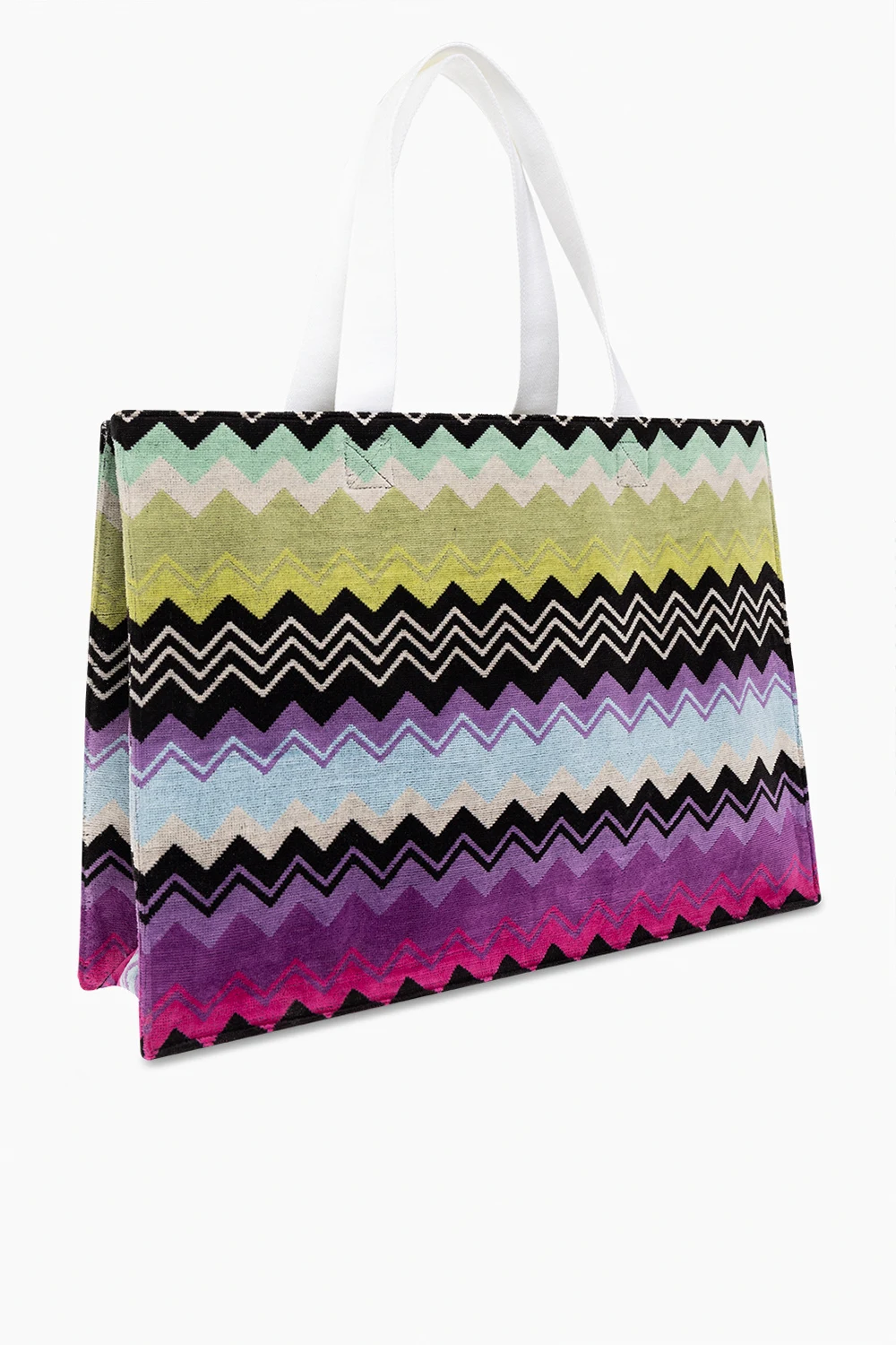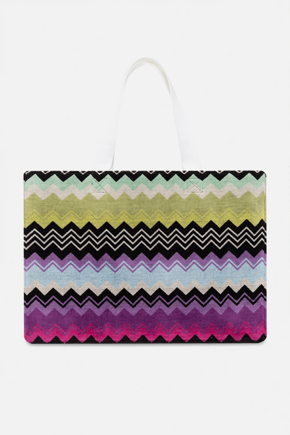 Kolorowa torba typu ‘shopper’ Missoni. Wykonana z bawełny. Ozdobiona geometrycznym wzorem. Dwie półokrągłe rączki. Wewnątrz komora oraz kieszeń zamykana na zamek.