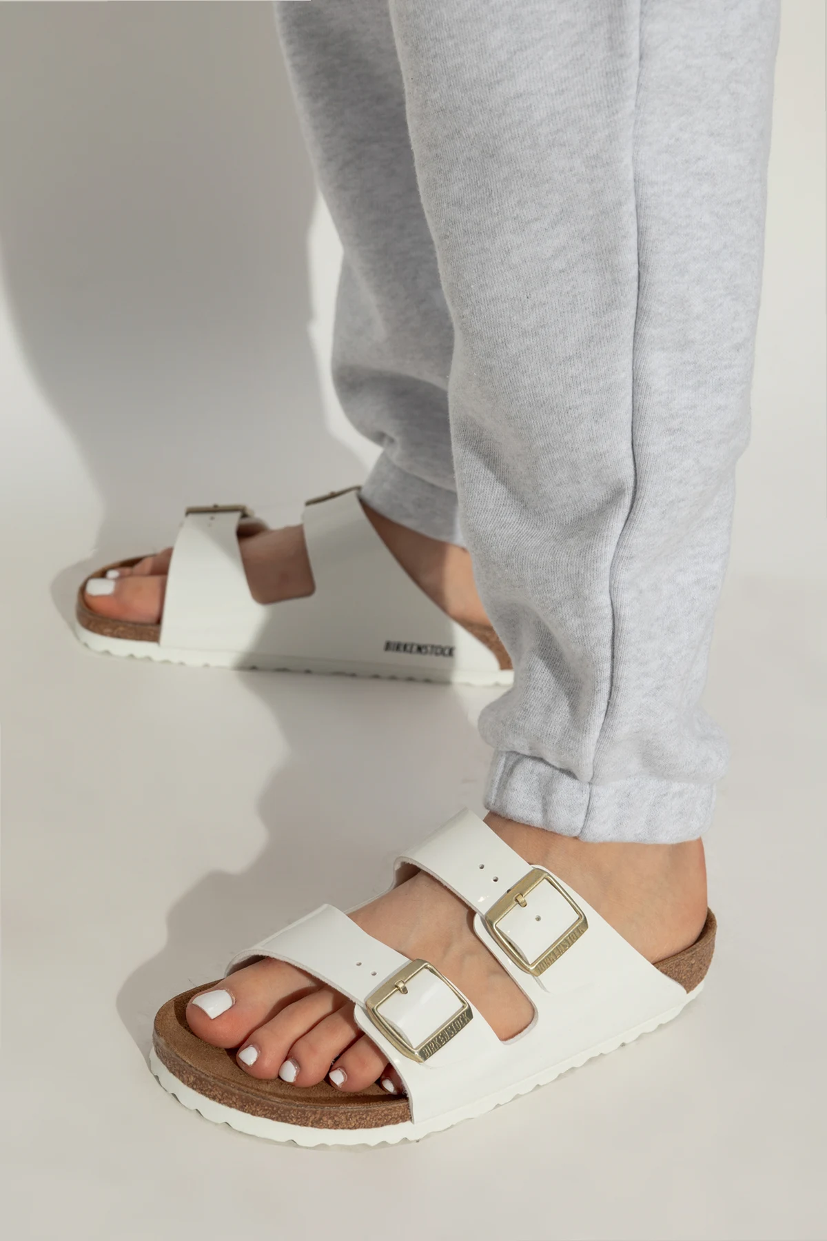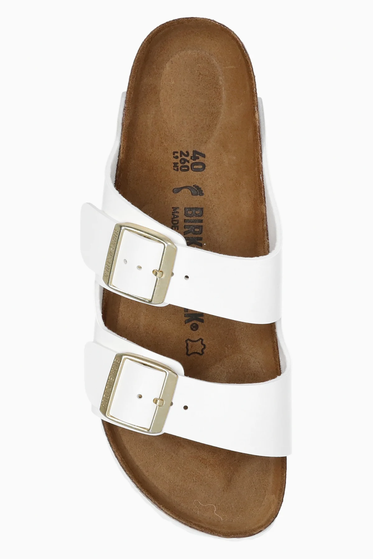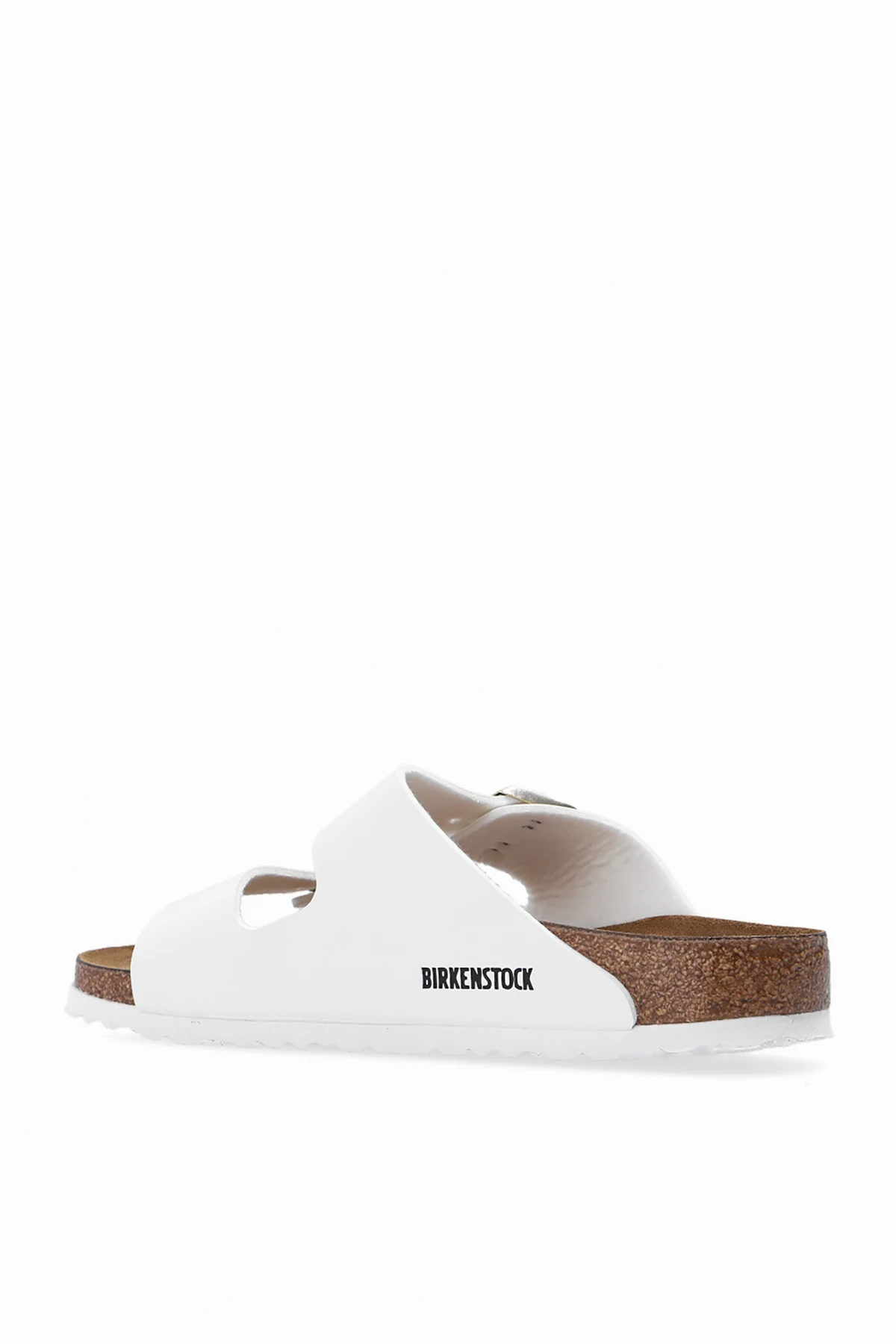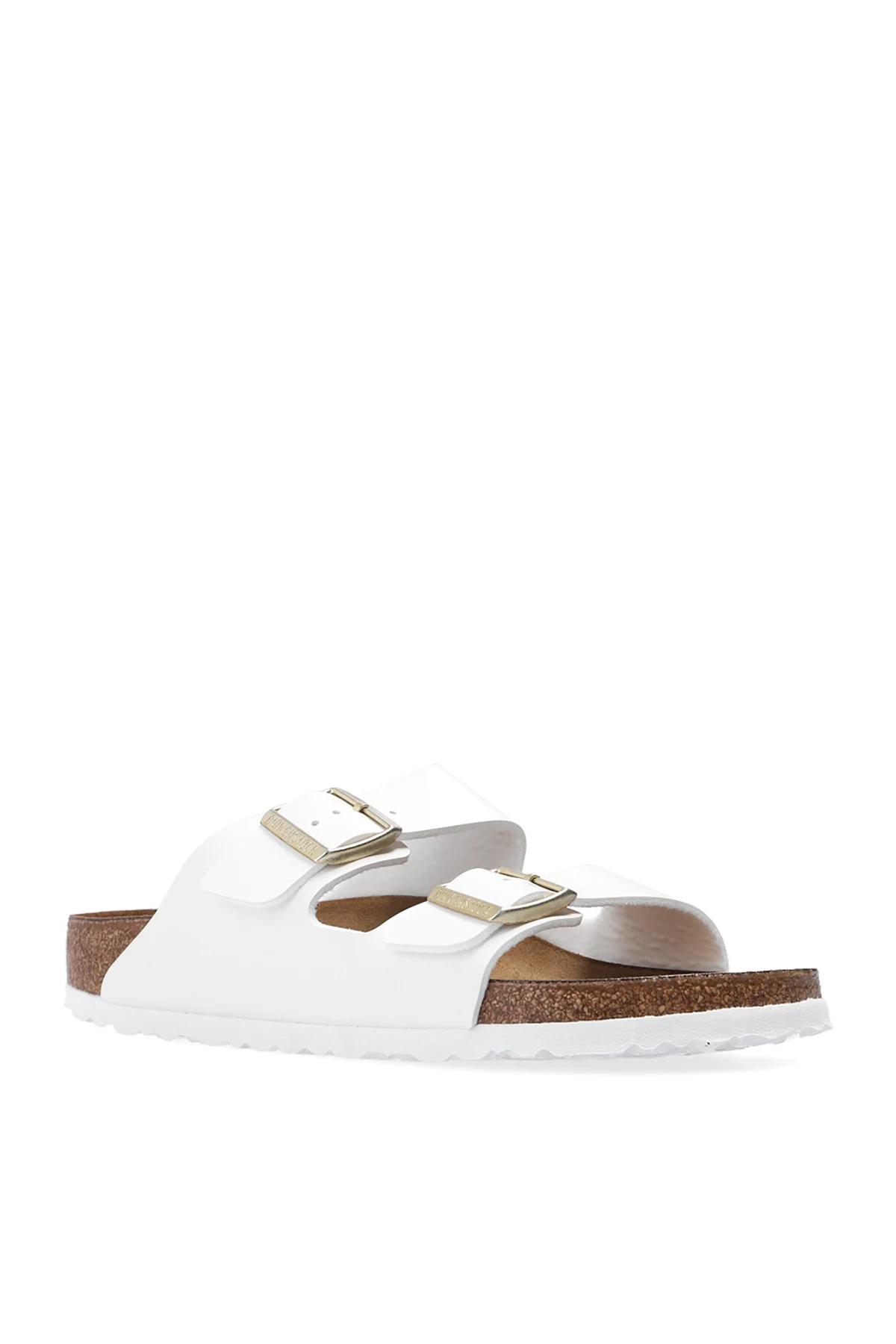 Białe klapki, model ‘Arizona BS’ Birkenstock. Wykonane ze skóry. Paski z klamrą w kolorze złotym z wytłoczonym logo. Brązowo-biała podeszwa wykonana z naturalnego korka oraz pianki EVA.