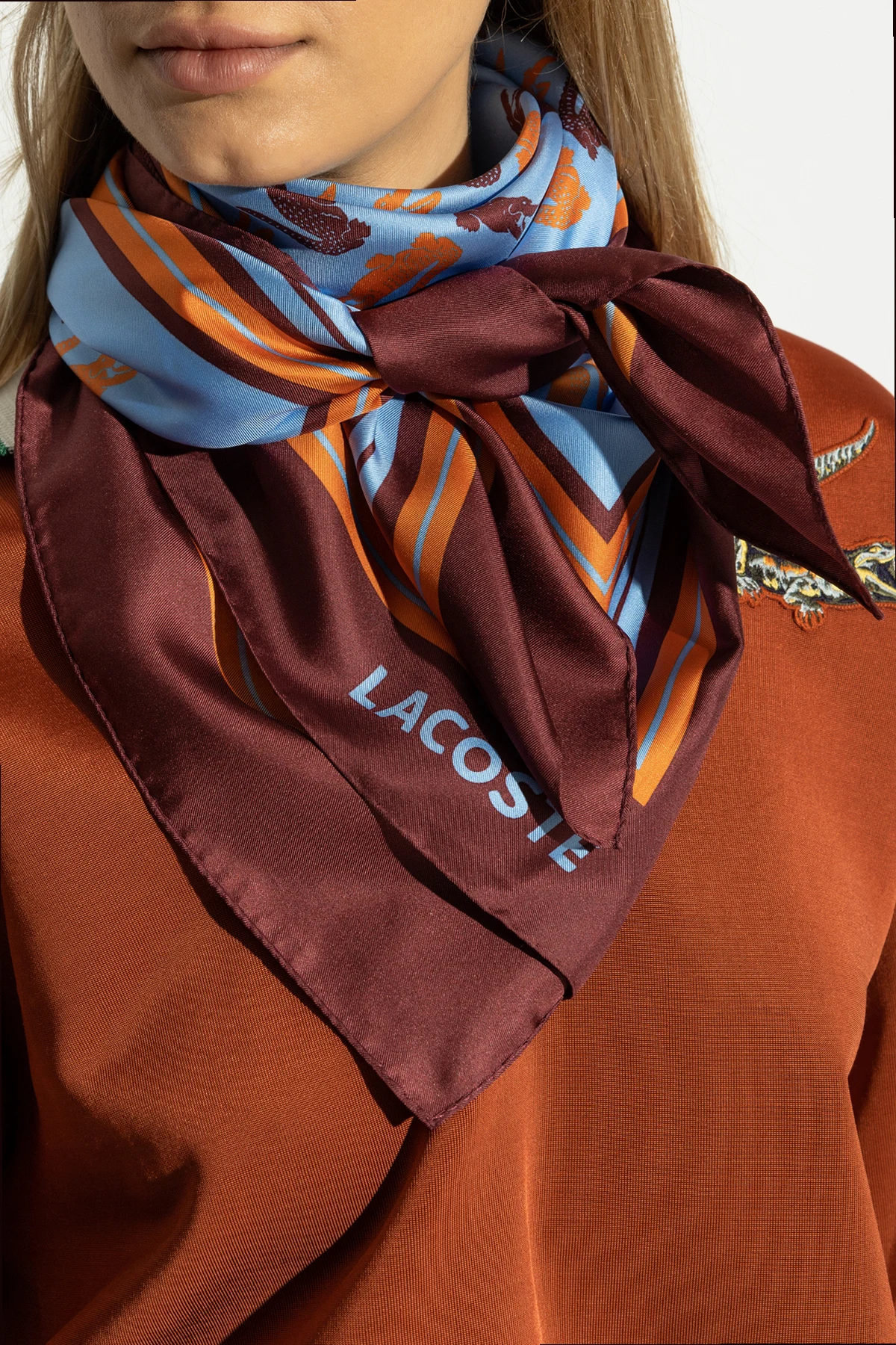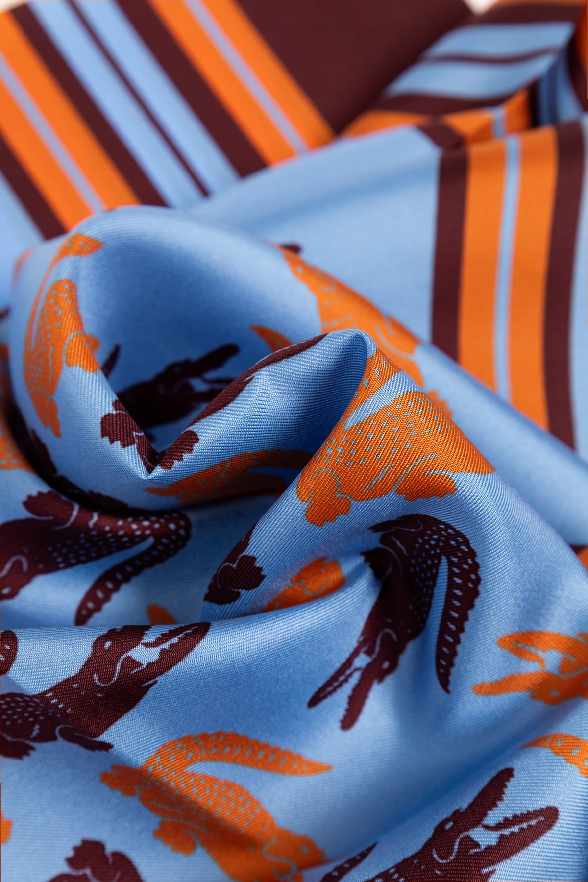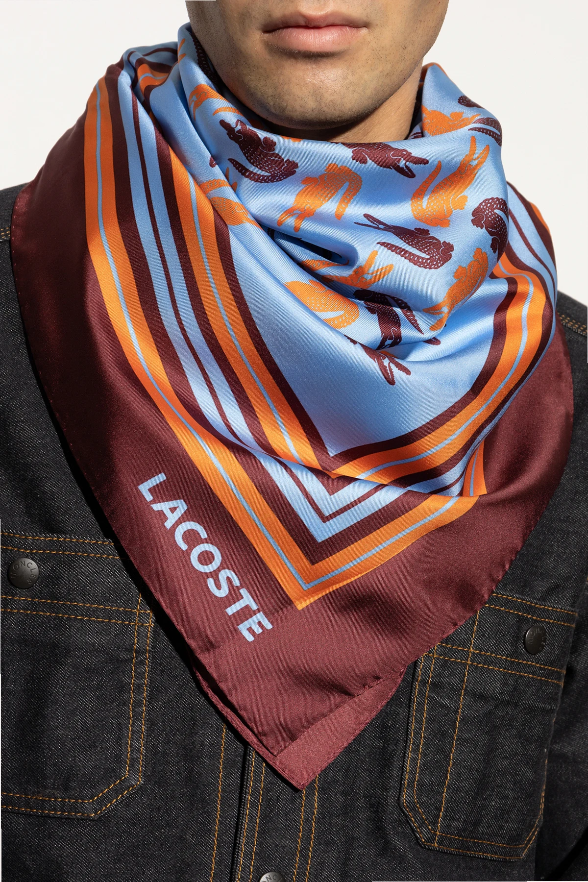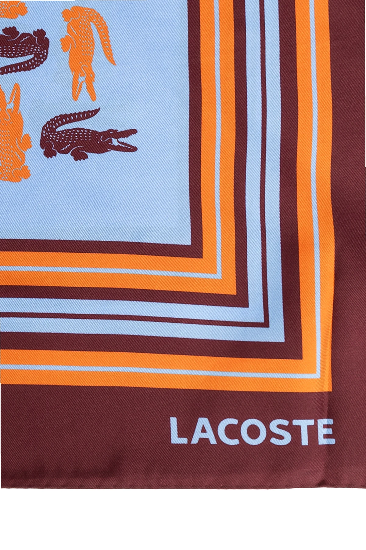 Prezentujemy Państwu jedwabną chustę marki Lacoste , która wyróżnia się wyrafinowanym wzornictwem i najwyższą jakością wykonania. Chusta ma kształt kwadratu i została ozdobiona powtarzającymi się motywami krokodyli na jasnoniebieskim tle, w kolorach ciemnobrązowym i pomarańczowym. Brzegi chusty zdobią pasy w odcieniach ciemnobrązowym, pomarańczowym oraz jasnoniebieskim, co dodaje całości wyjątkowego charakteru.