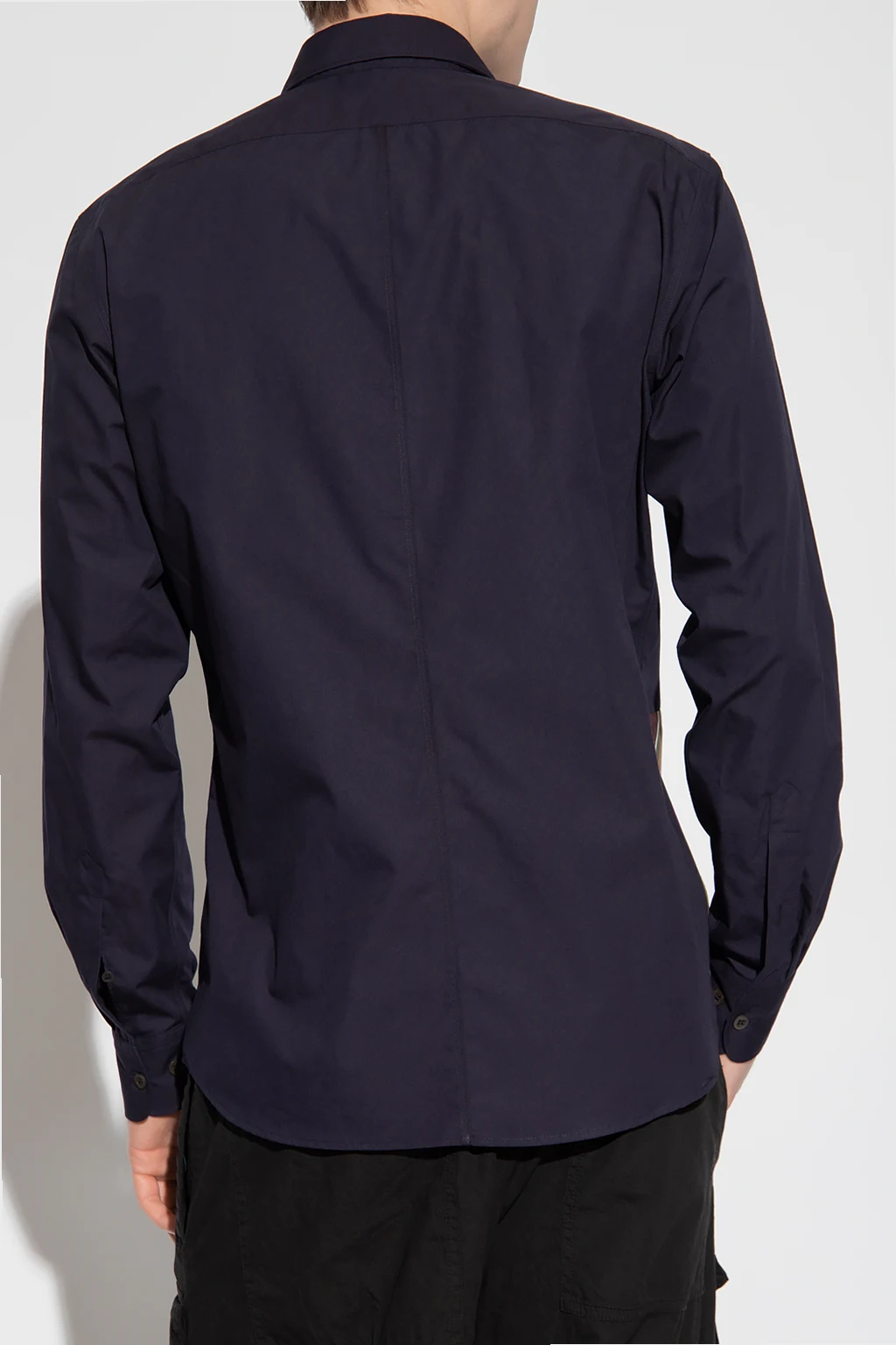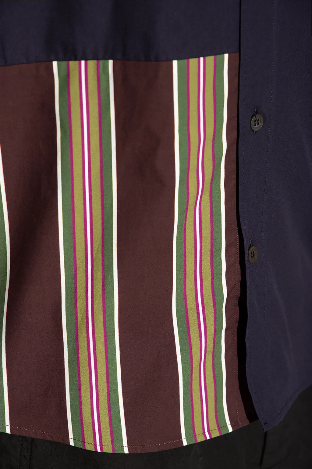 Granatowa koszula Dries Van Noten. Wykonana z bawełny. Zapinana na guziki. Ozdobiona kolorową wstawka ze wzorem w pasy. Wsuwana kieszeń. Długie rękawy wykończone mankietami.