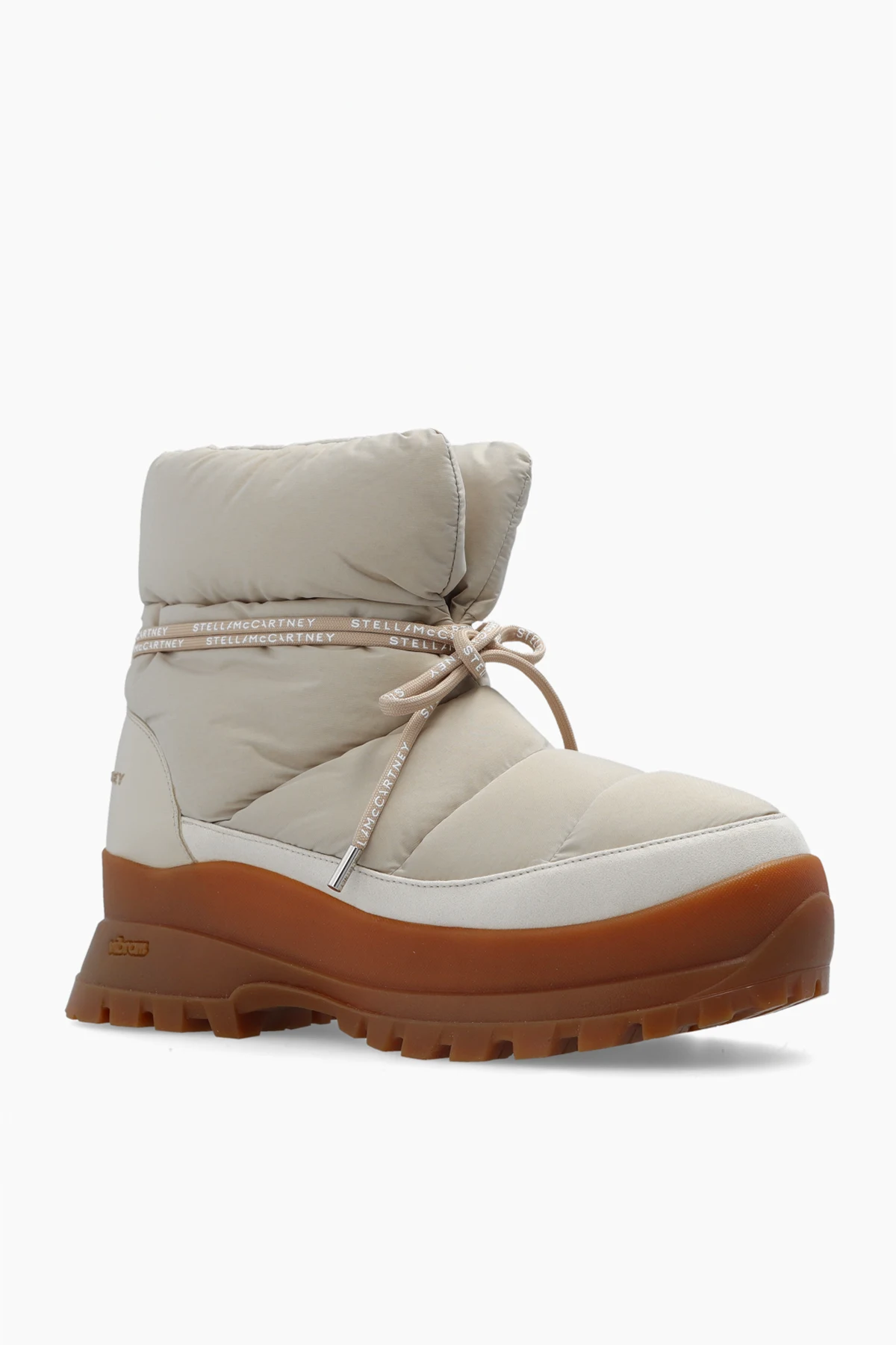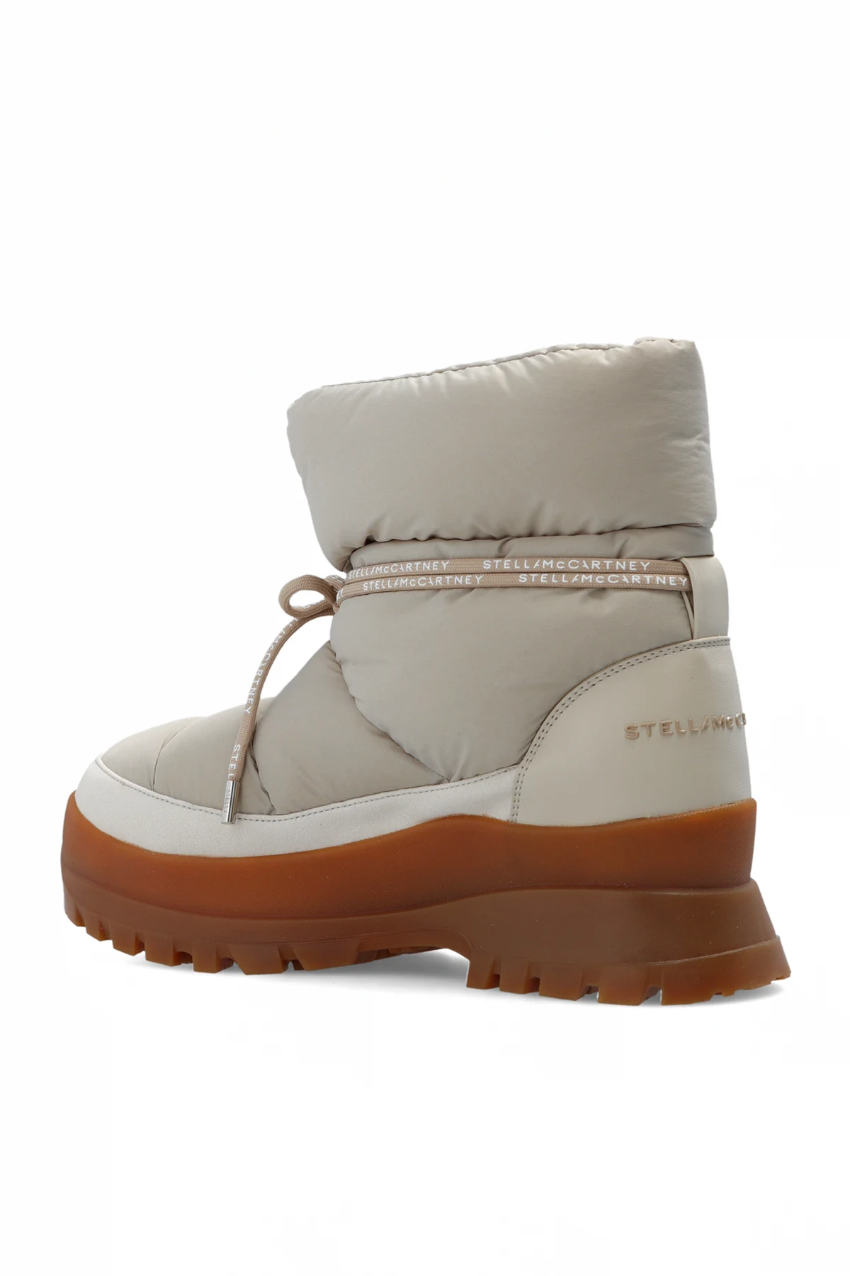 Beżowe, wsuwane śniegowce, model ‘Trace’ Stella McCartney. Wykonane z ECONYLu®. Dekoracyjnie sznurowane. Z tyłu wypukłe logo. Brązowa, gumowa podeszwa Vibram®.