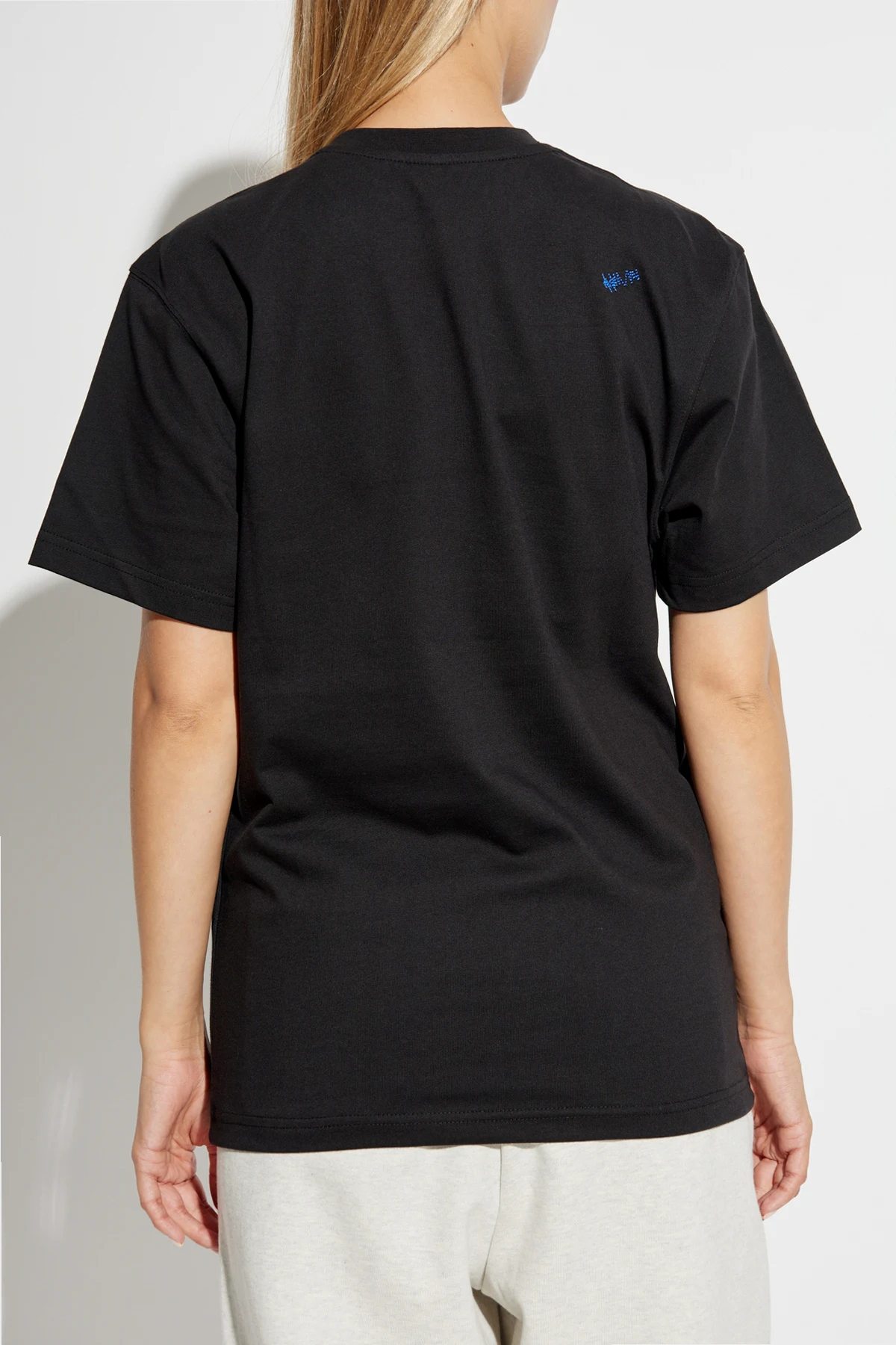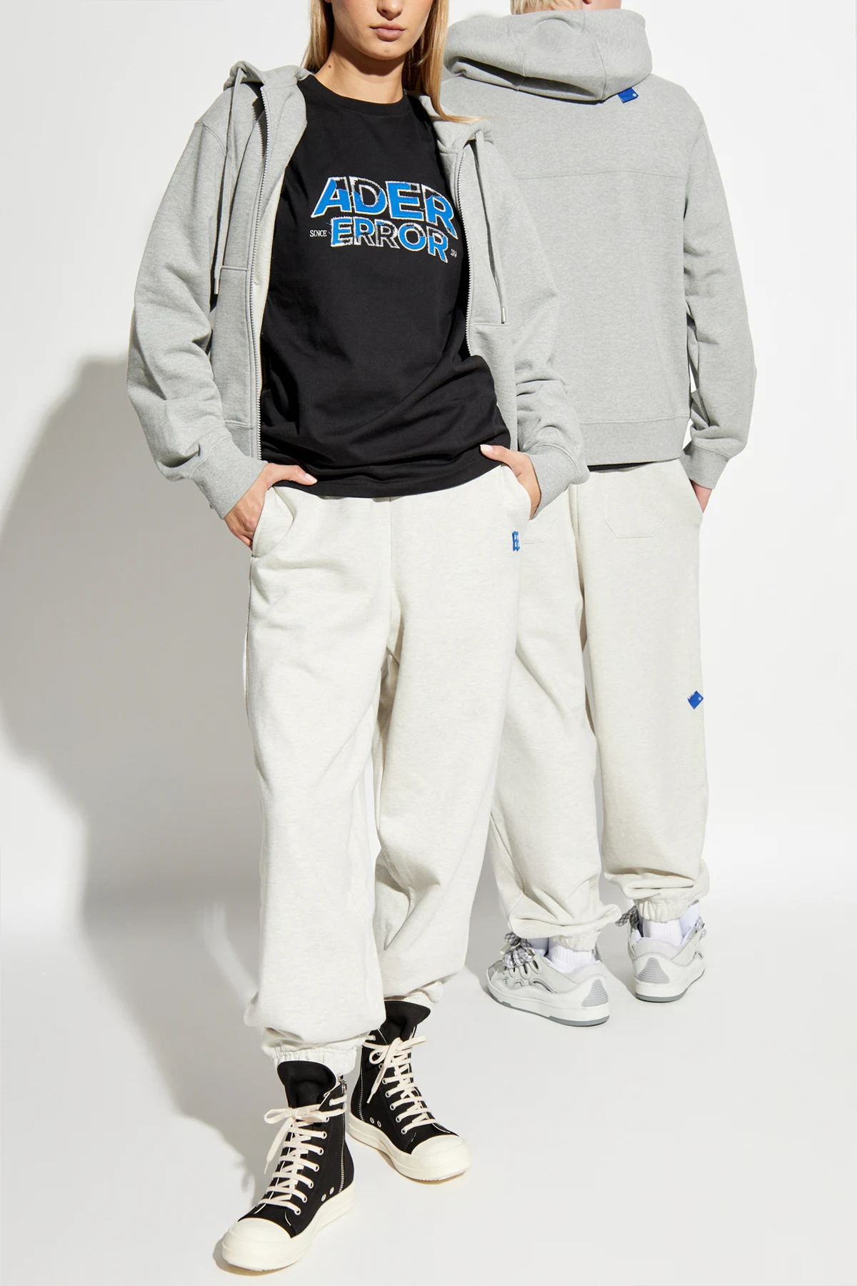 Na przodzie koszulki wyróżnia się duży, charakterystyczny napis "ADER ERROR" w kolorach niebieskim i białym, który podkreśla jej unikalność i rozpoznawalność. Drobne białe napisy umiejscowione pod i nad logo dodają całości subtelnego uroku. Tylna strona koszulki zdobiona jest małym, niebieskim znaczkiem na prawym ramieniu, co stanowi delikatny akcent brandingowy.