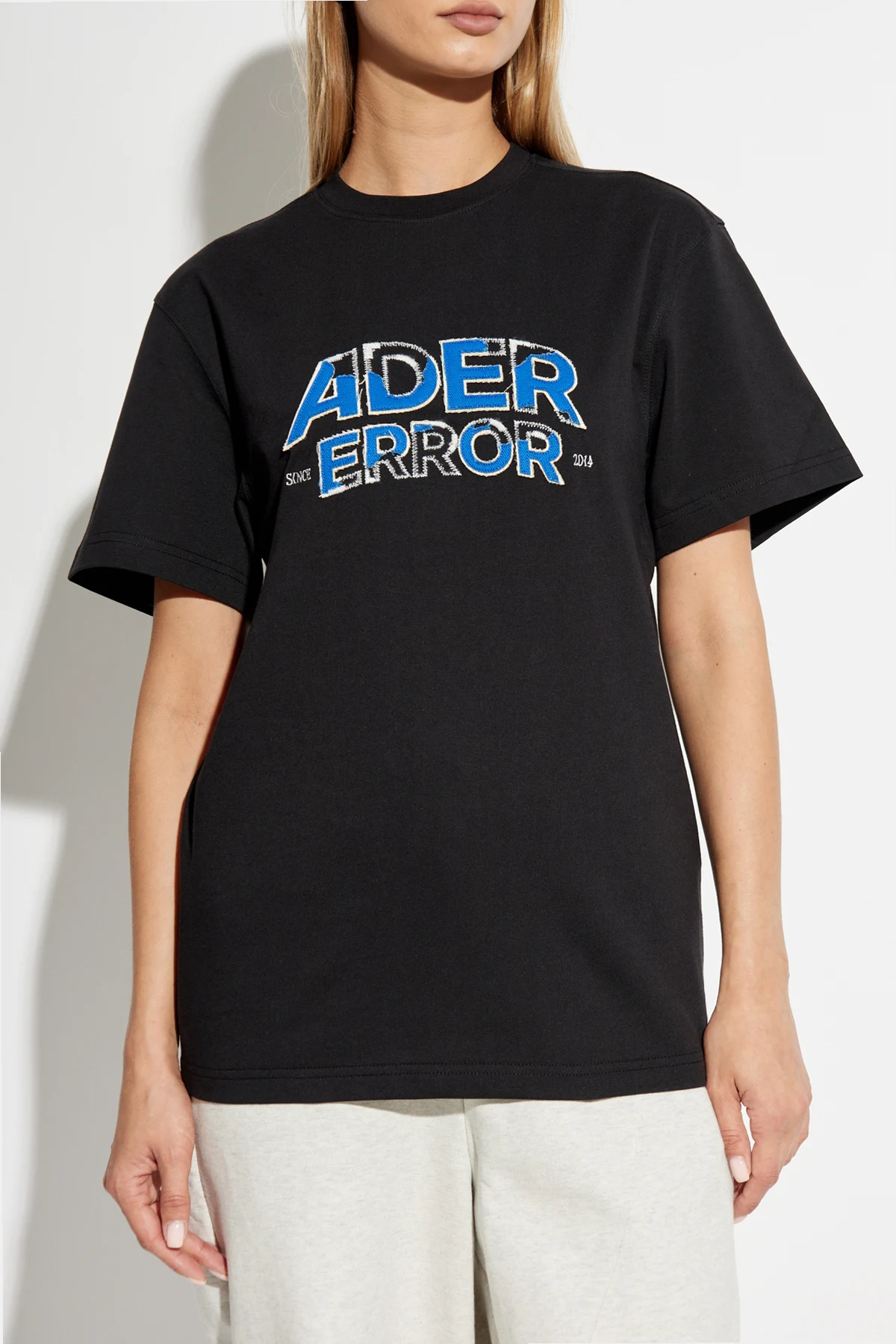 T-shirt z logo marki Ader Error to kwintesencja nowoczesnej elegancji i wyrafinowanego stylu. Wykonany z doskonałej jakości bawełny i poliestru, ten czarny t-shirt o klasycznym kroju zachwyca swoją prostotą i dbałością o detale.