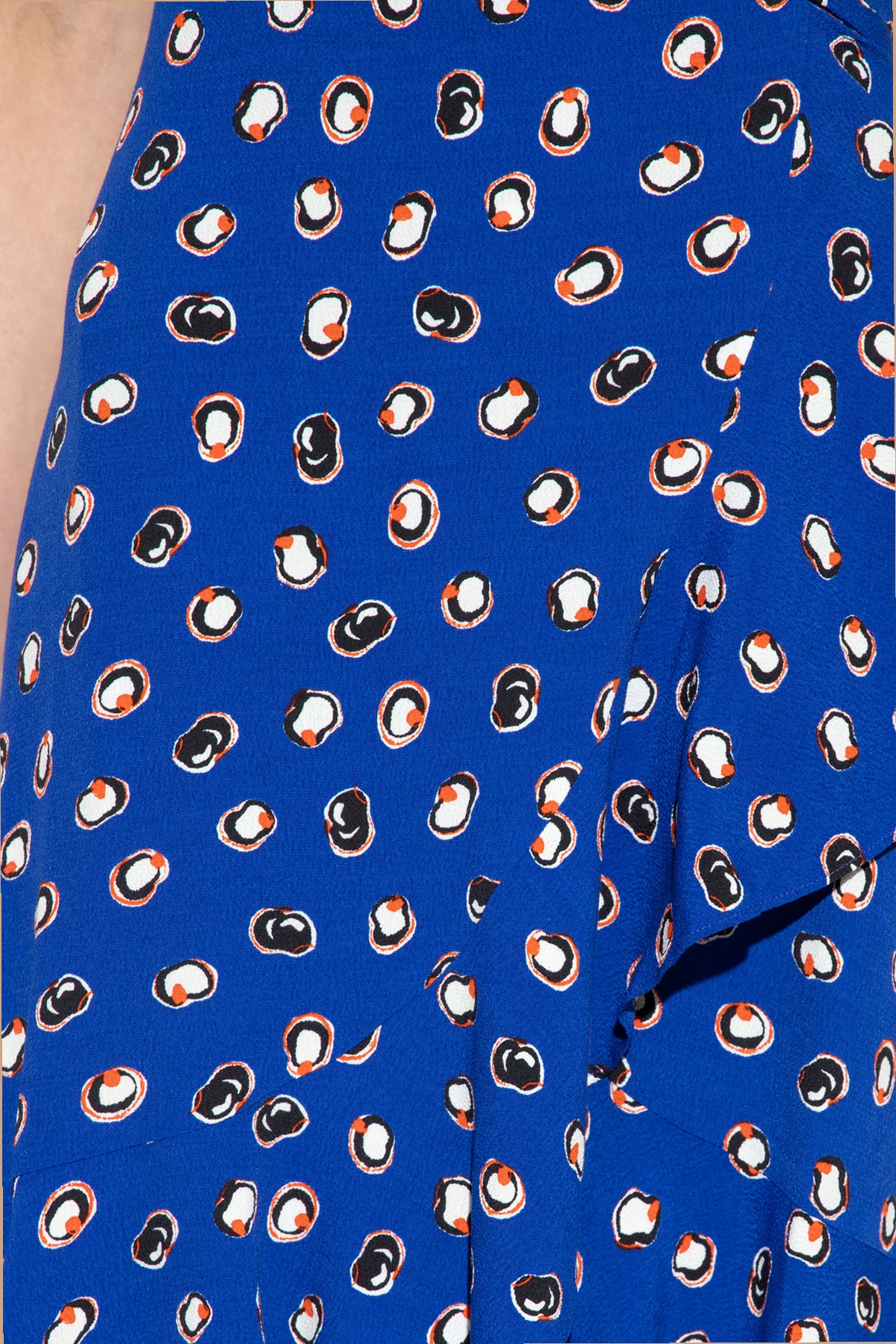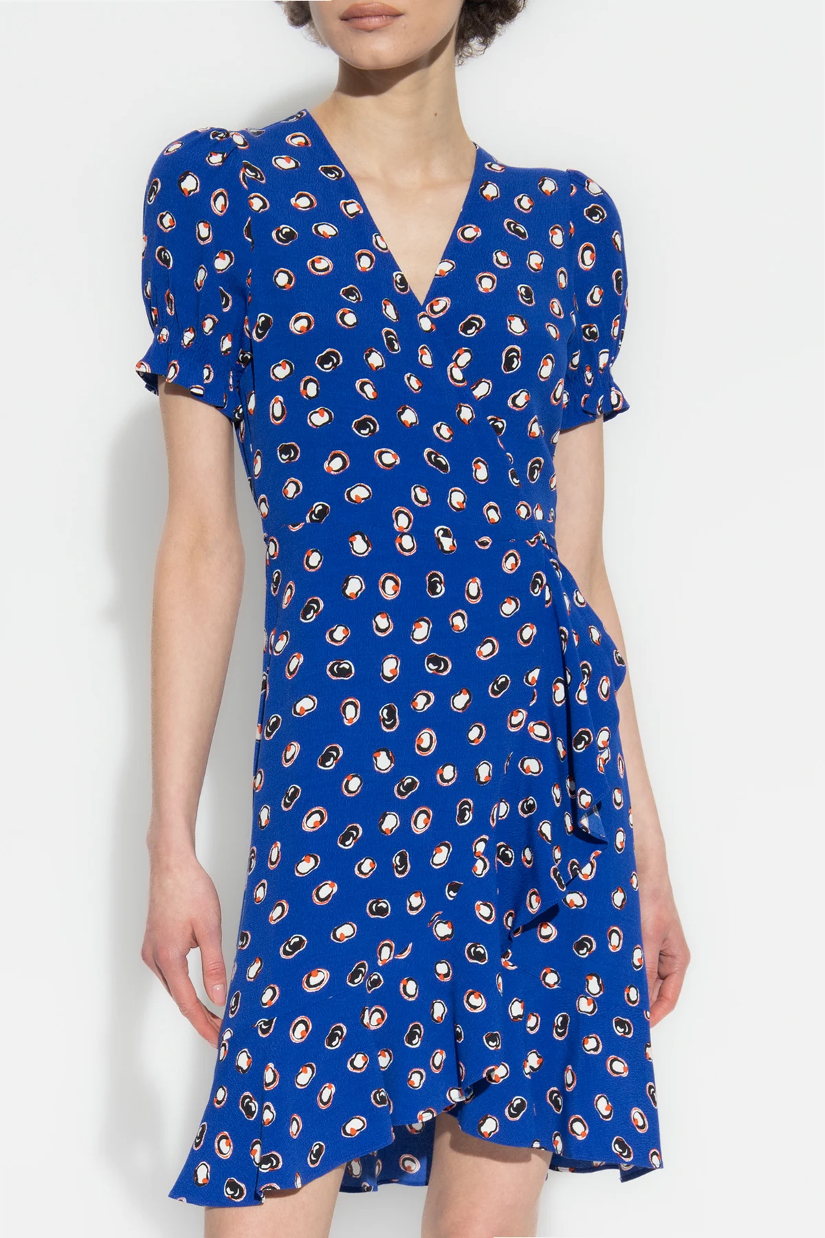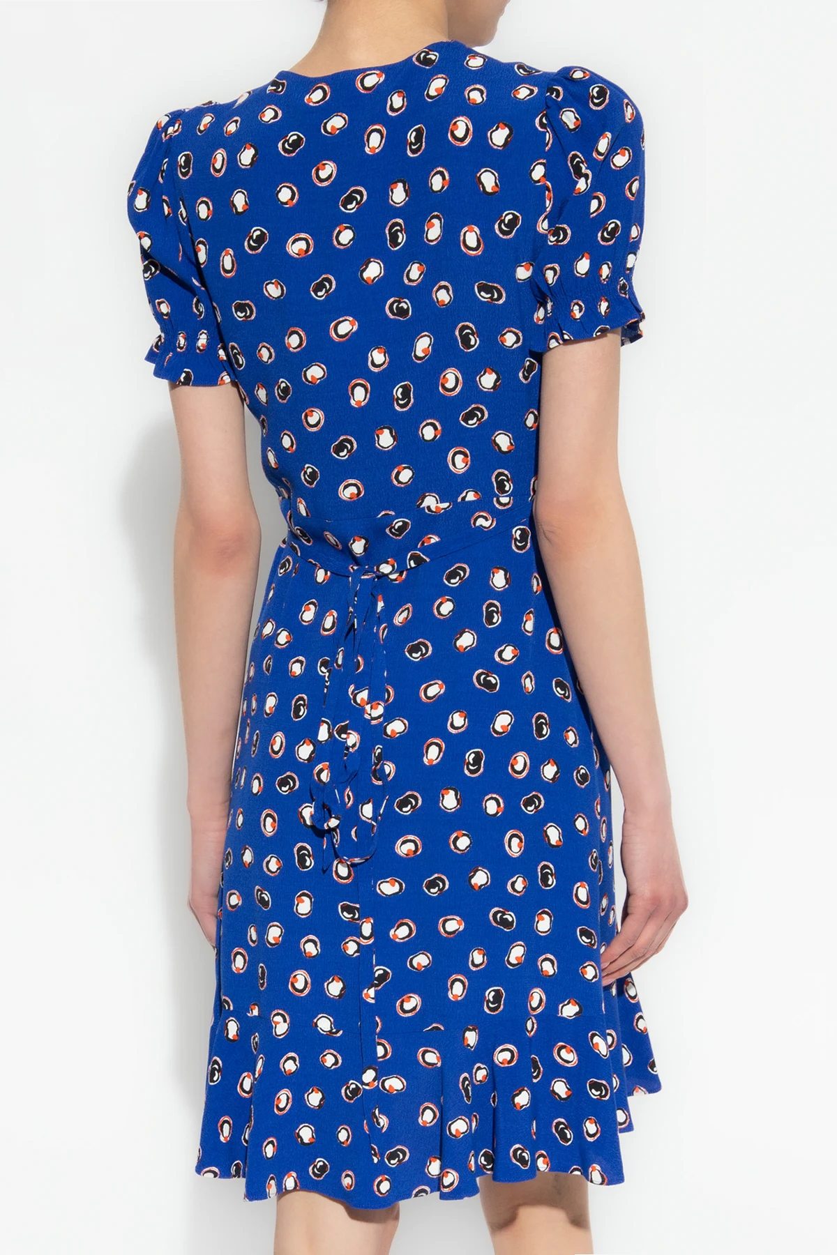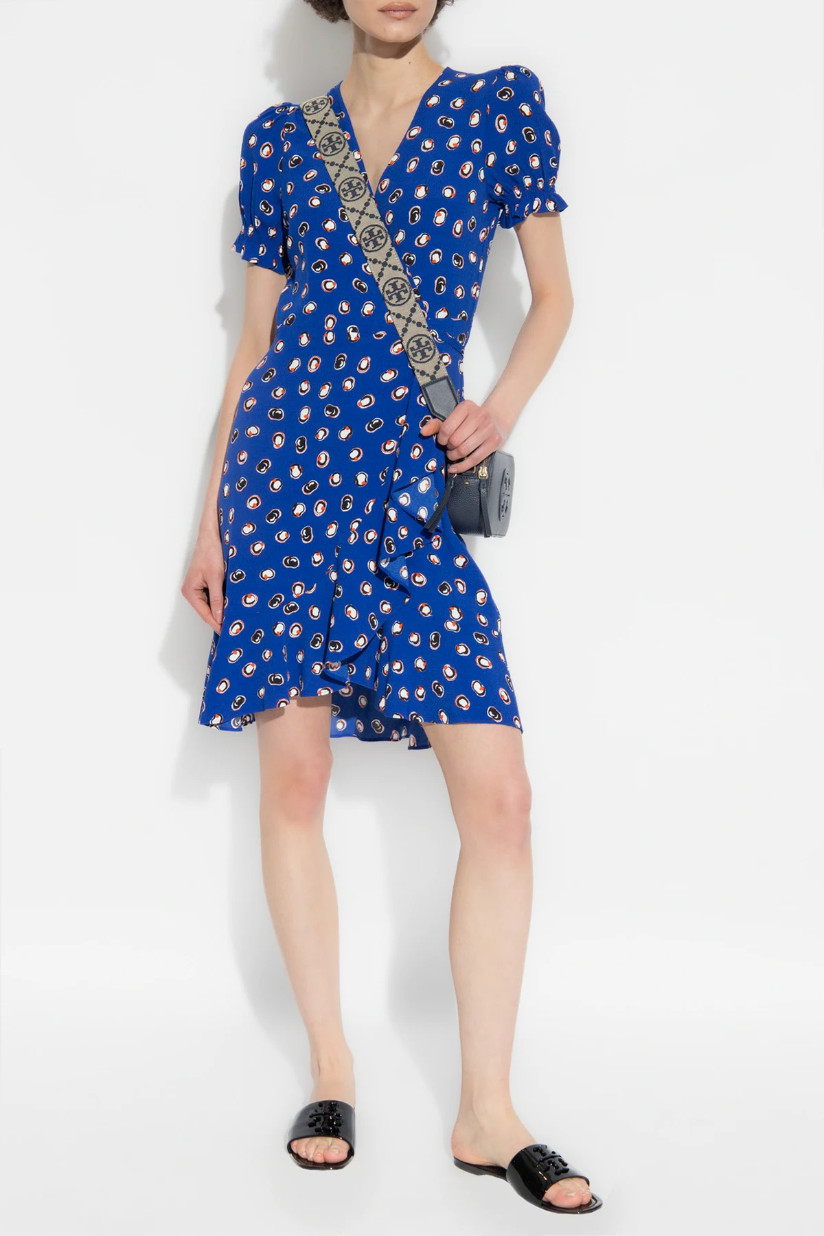 Ciemnoniebieska sukienka, model ‘Emilia’ Diane Von Furstenberg. Wiązana w talii. Ozdobiona geometrycznym wzorem w kolorze biało-pomarańczowo-czarnym. Krótkie rękawy wykończone ściągaczem.