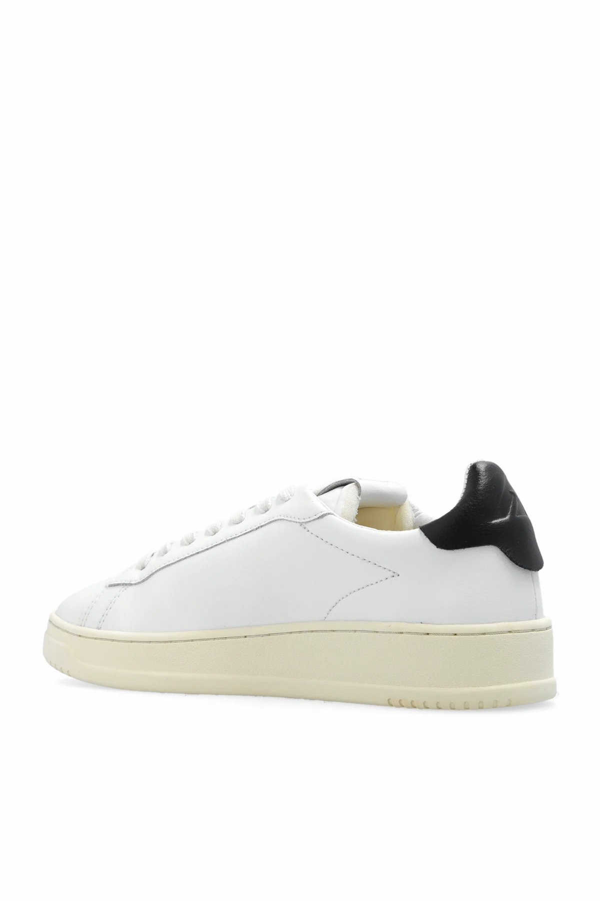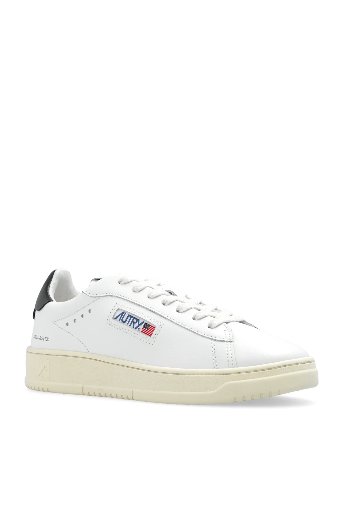Białe, sznurowane buty sportowe, model ‘Dallas’ Autry. Wykonane ze skóry. Ozdobione logo. Czarny zapiętek. Kremowa, gumowa podeszwa.