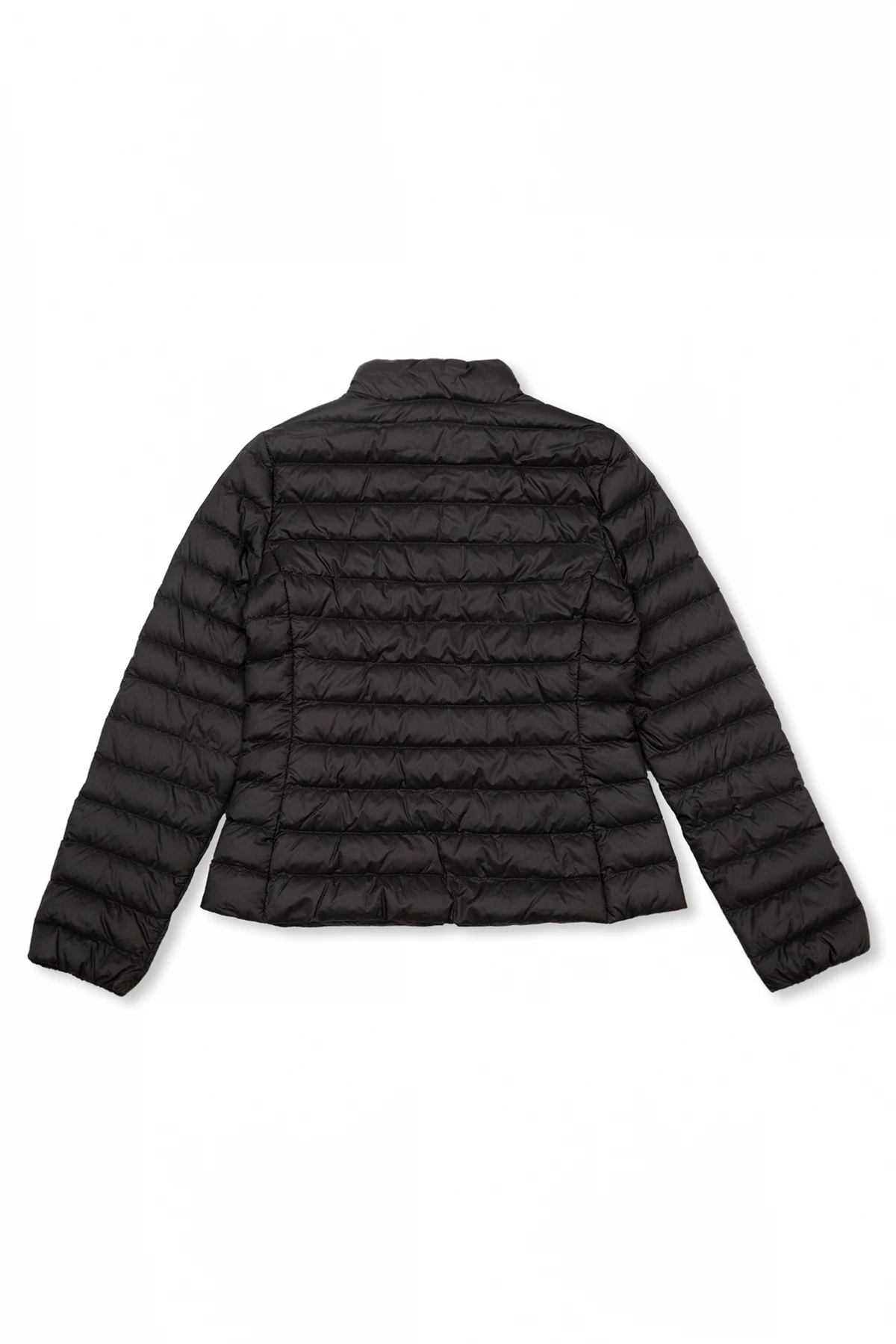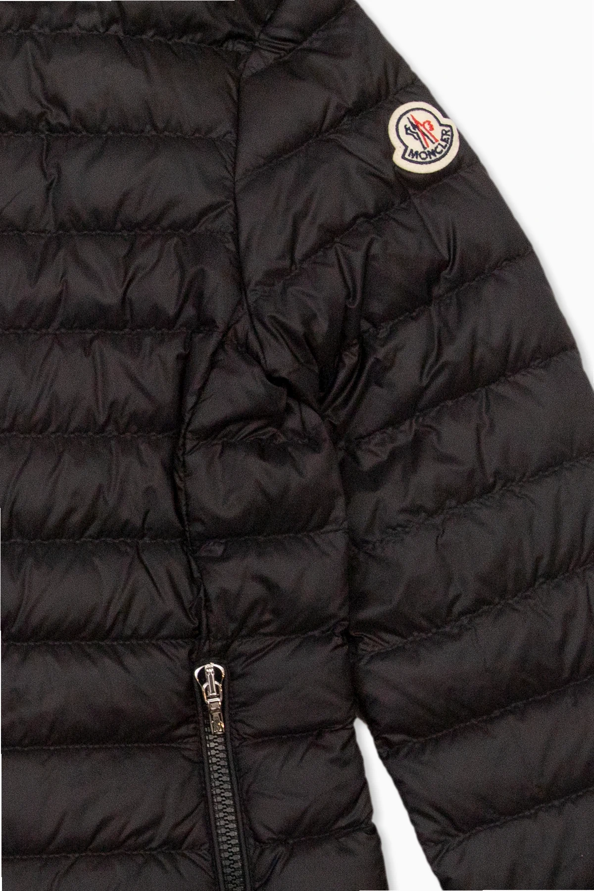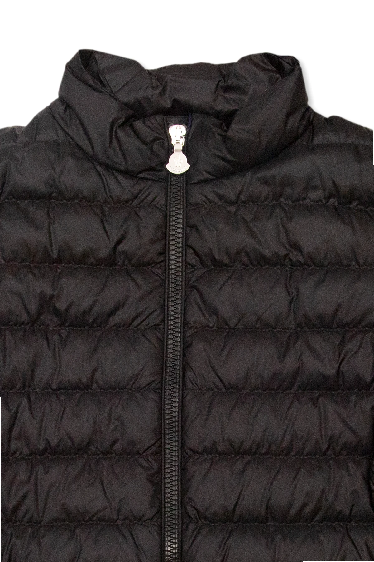 Czarna, pikowana kurtka ze stójką, model ‘Kaukura’ Moncler Enfant. Zamykana na zamek. Z przodu dwie kieszenie zapinane na zamek. Długie rękawy - na jednym kolorowa naszywka z logo. Puchowe wypełnienie.