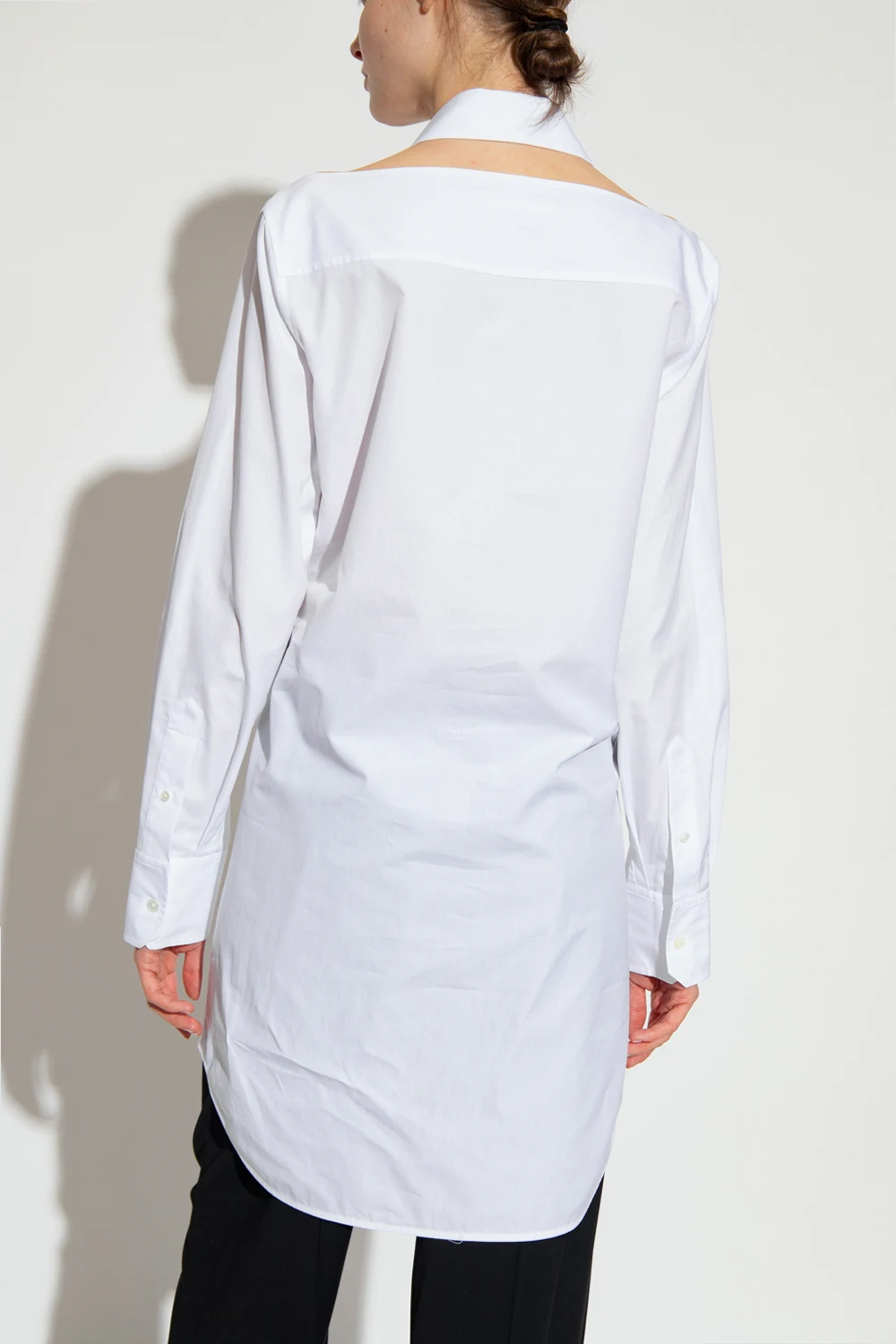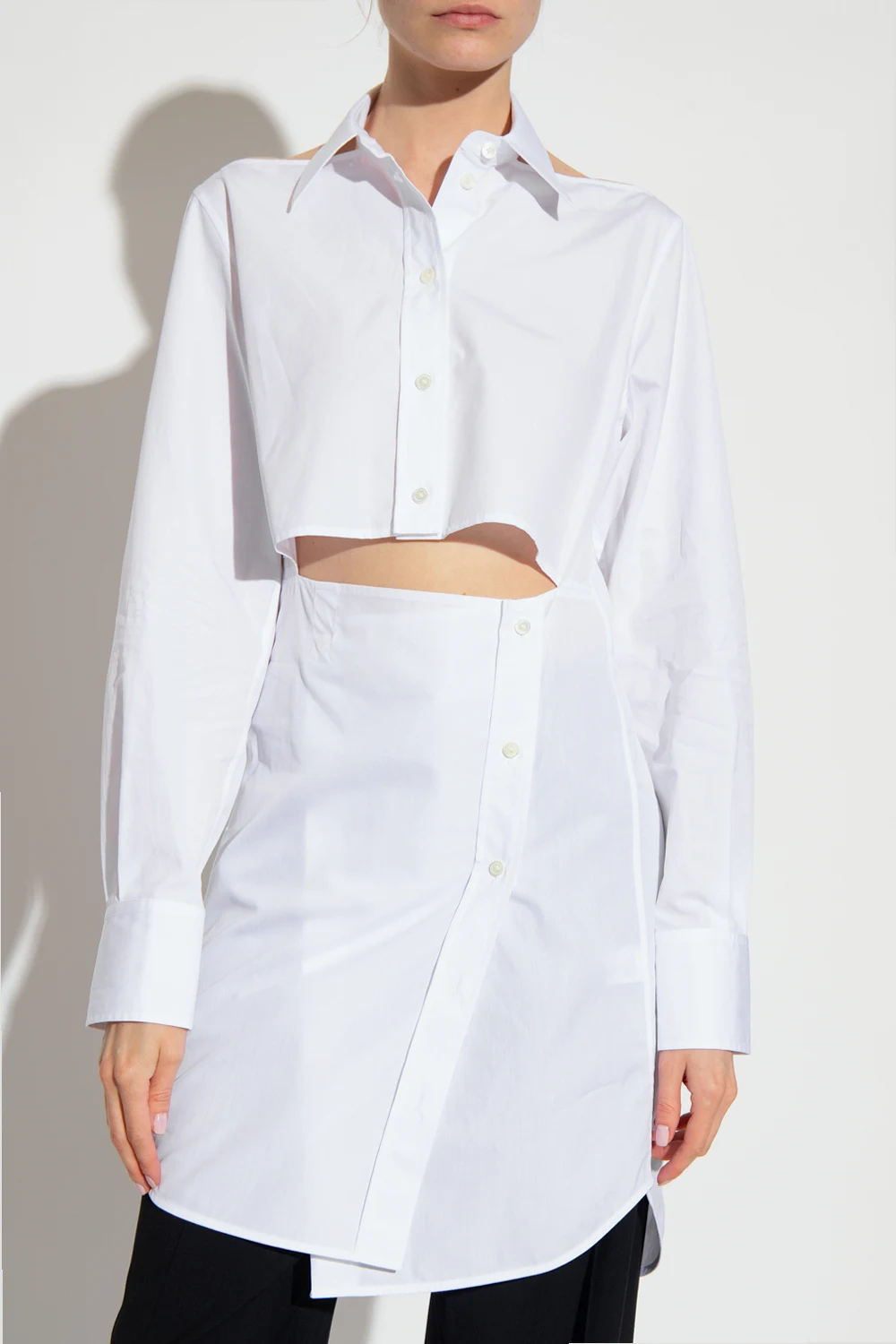 Biała, bawełniana sukienka Helmut Lang. Zapinana na guziki. Na ramionach i z przodu dekoracyjne wycięcia. Długie rękawy zakończone mankietem zapinanym na guziki.