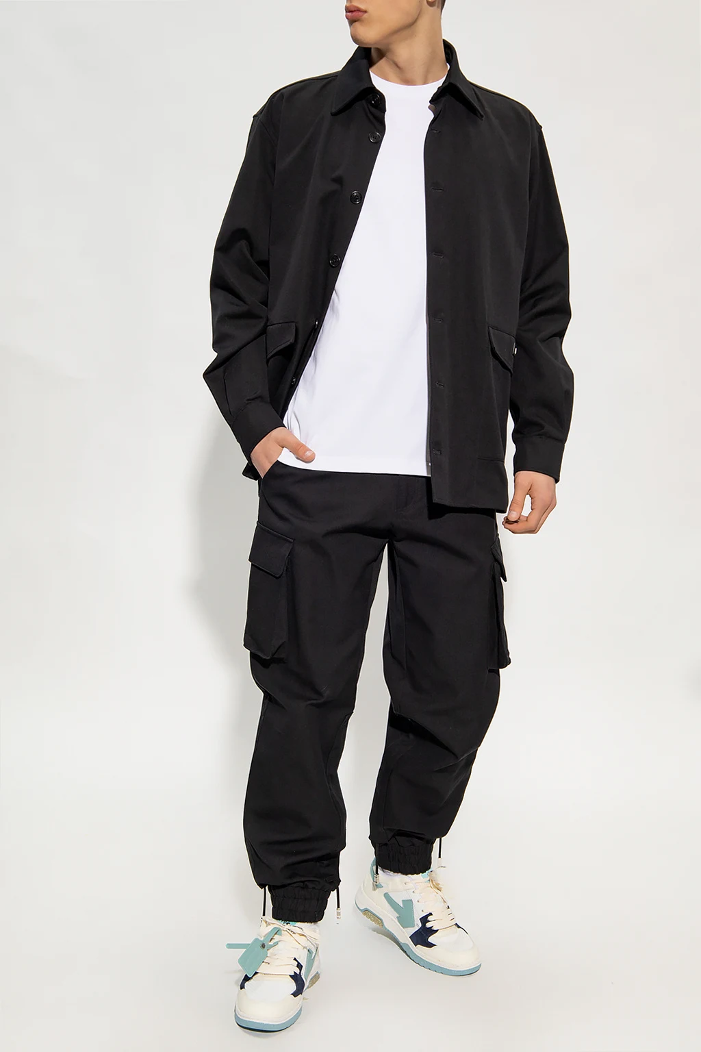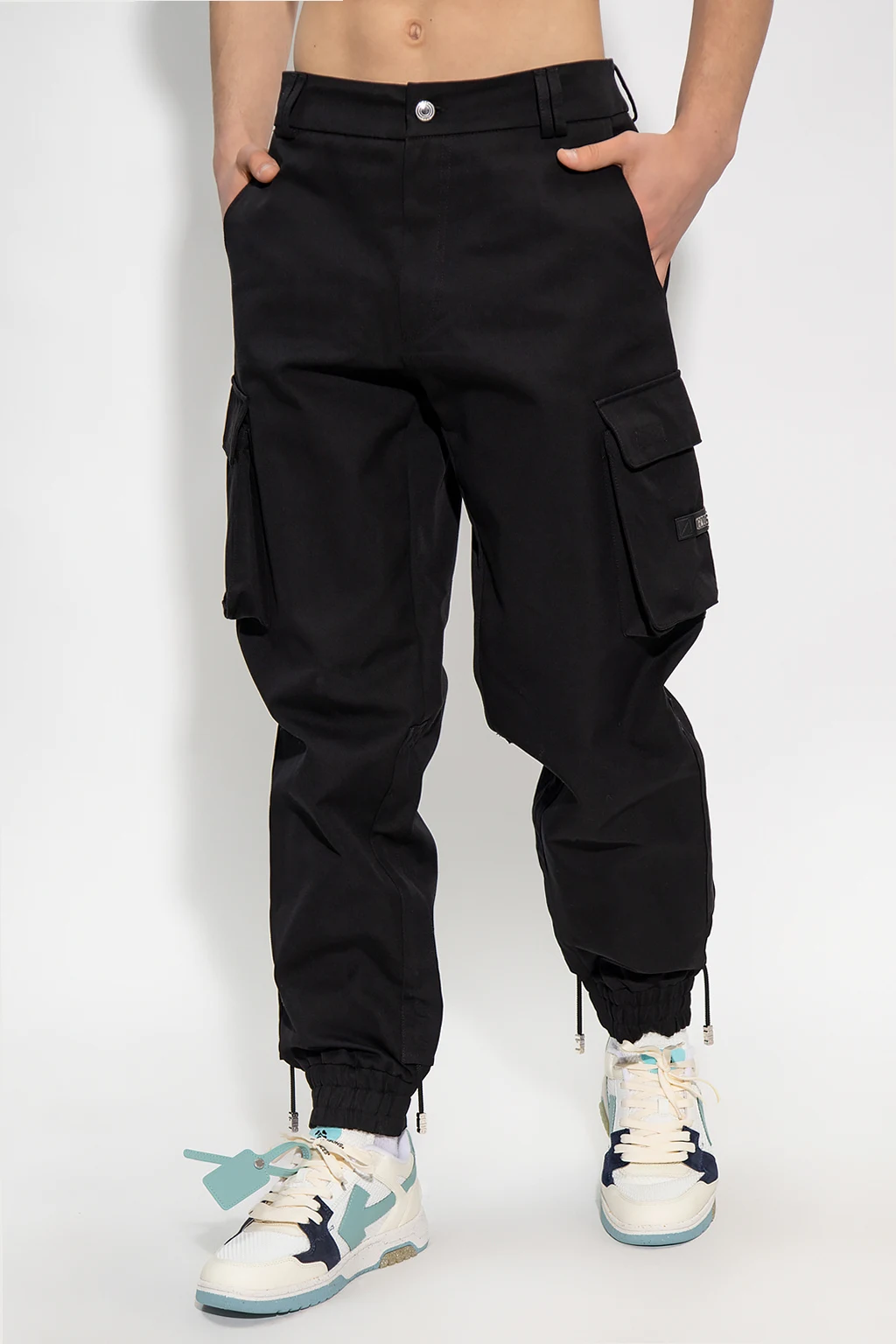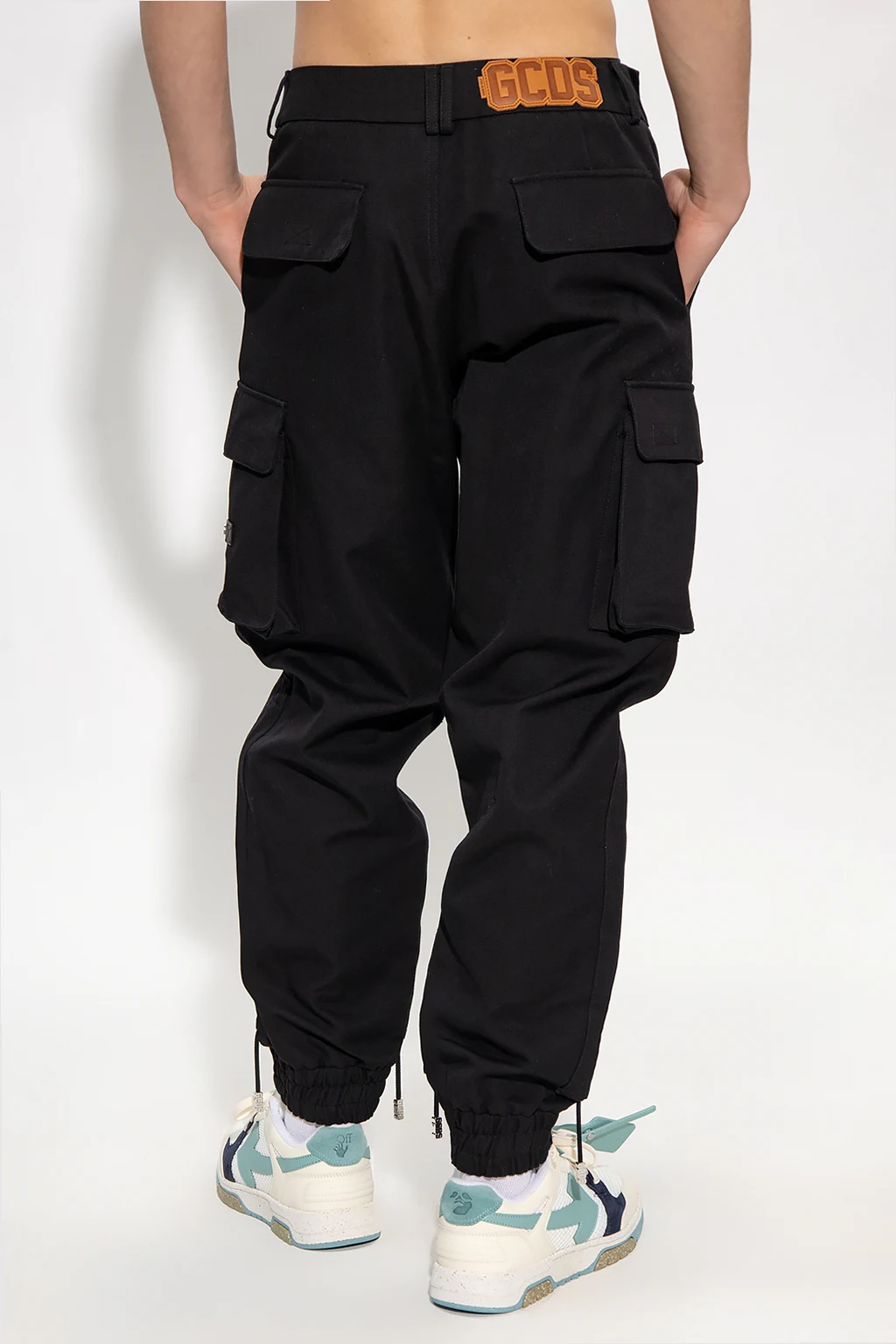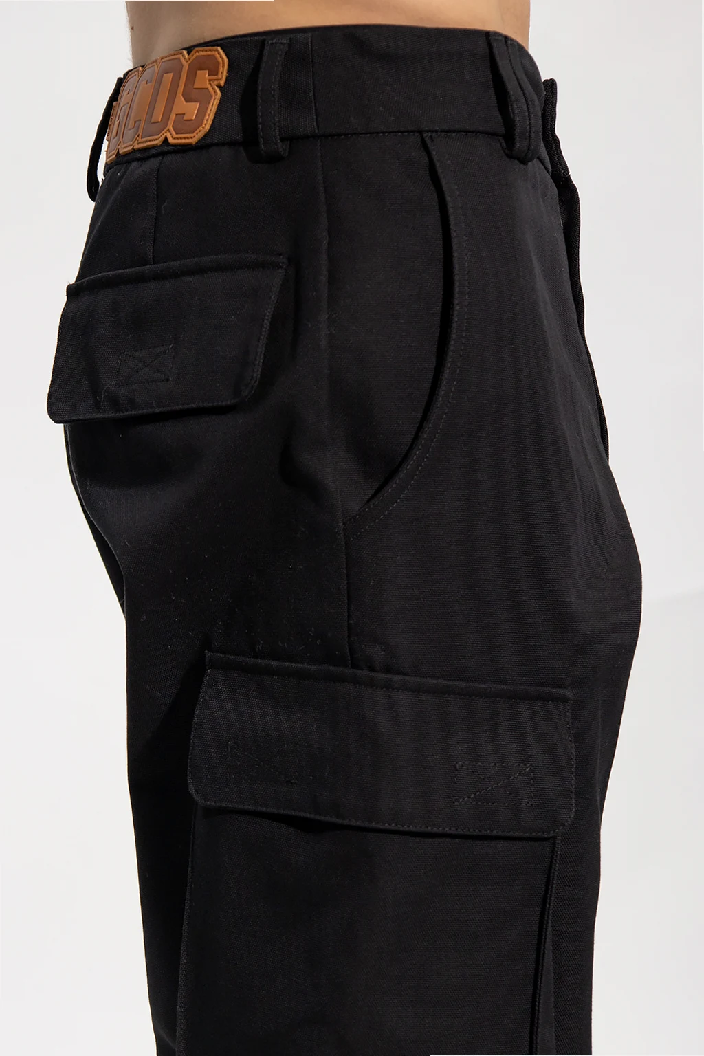 Czarne spodnie typu ‘cargo’ GCDS. Wykonane z bawełny. Zapinane na zamek i guzik. Z tyłu brązowa naszywka z logo. Sześć kieszeni: dwie wsuwane i cztery z patką zapinaną na rzep. Długie nogawki zakończone ściąganymi trokami i ściągaczem.